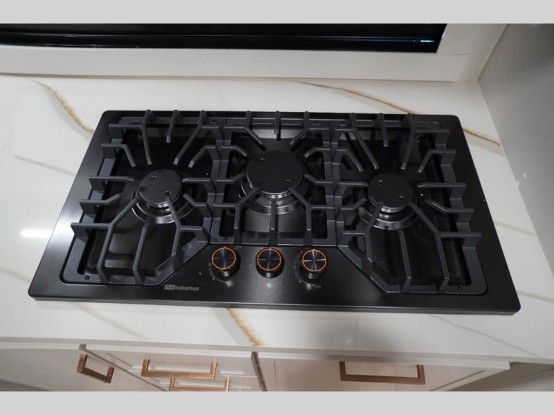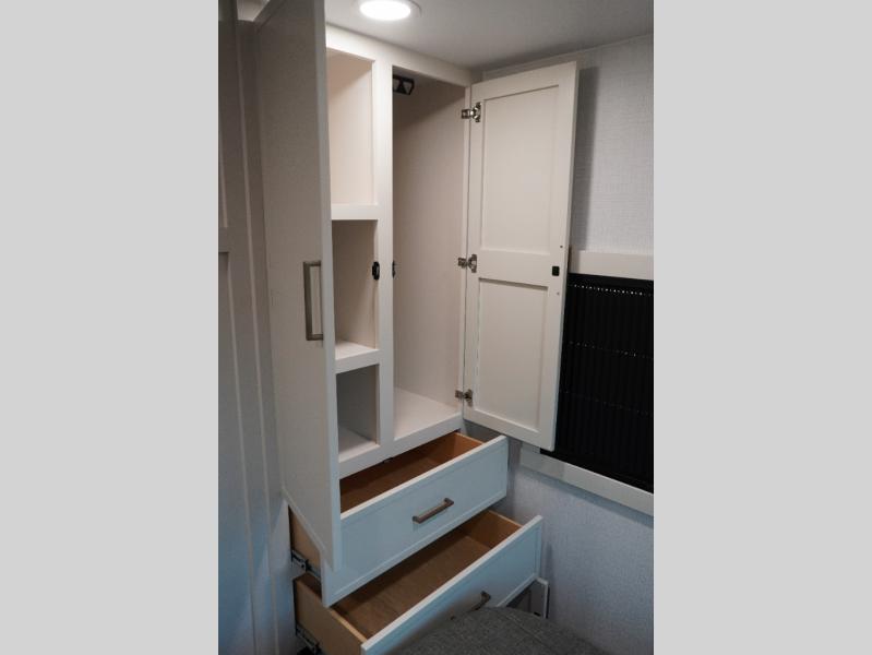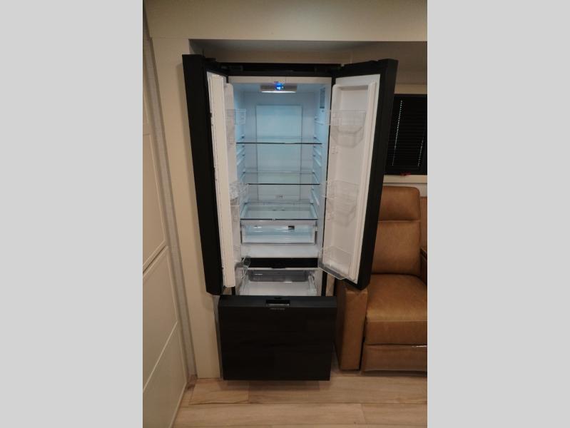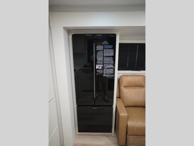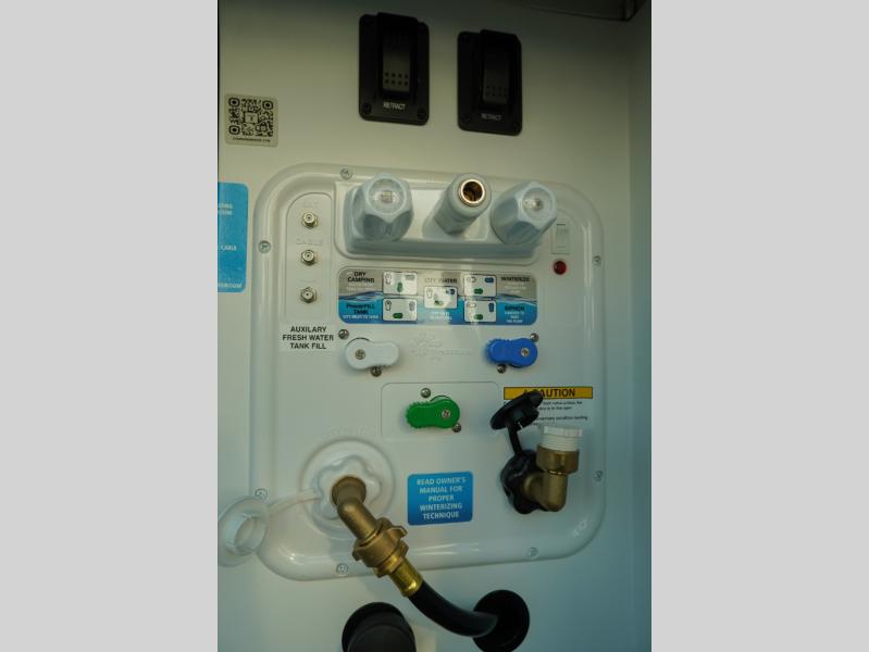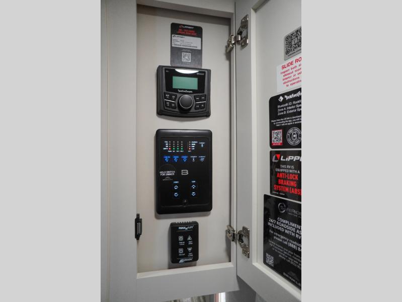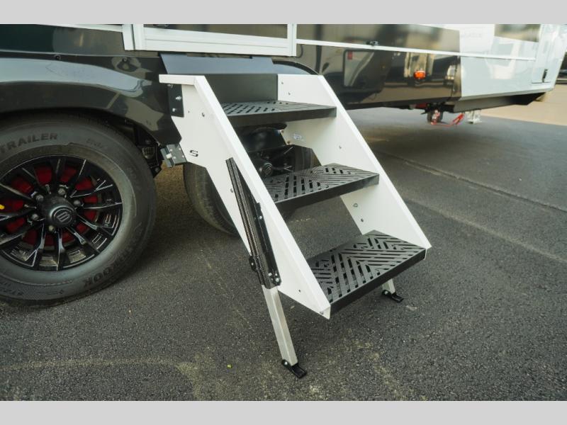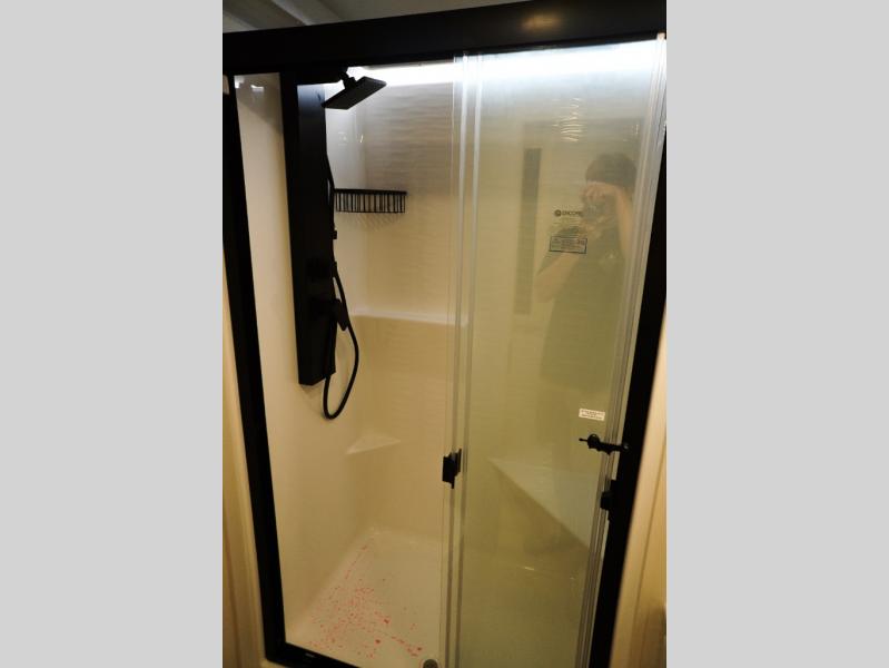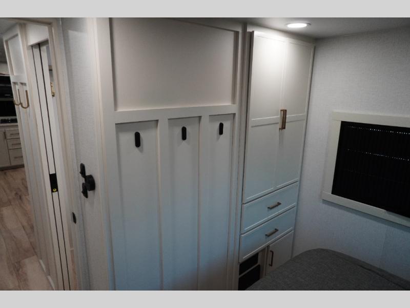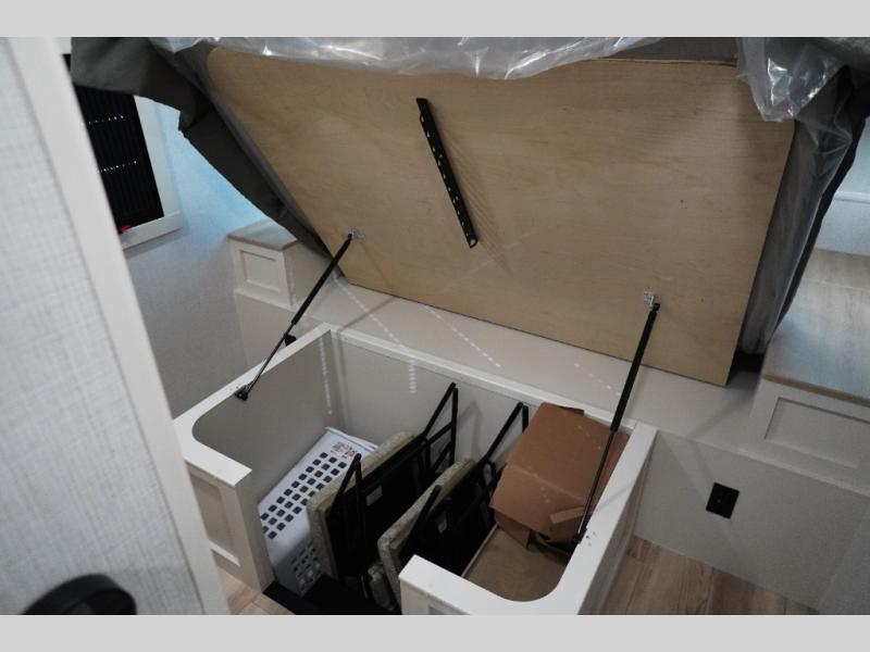 This travel trailer can comfortably sleep four with the king bed in the private bedroom and the tri-fold sofa in the main living area! The full bath features a spacious 42" x 30" shower with a built-in seat and Maxxair fan to name a few comforts. The front private bedroom features a 66" x 80" king bed with a MaxSpace Split-Level Wardrobe underneath to store shoes, clothes, and more! A slide out in the combined living area and rear kitchen makes your space more open, and you'll enjoy relaxing on the theater seating here in the evenings. The full kitchen includes a three burner stovetop, residential 30" convection microwave, 12 cu. ft. 12V refrigerator, plus a trash bin and Stow N' Go paper towel holder for added convenience. You can choose to eat outdoors under the 19' electric awning with LED lights or stay inside to dine at the pull-out dining table with a drawer for added storage!