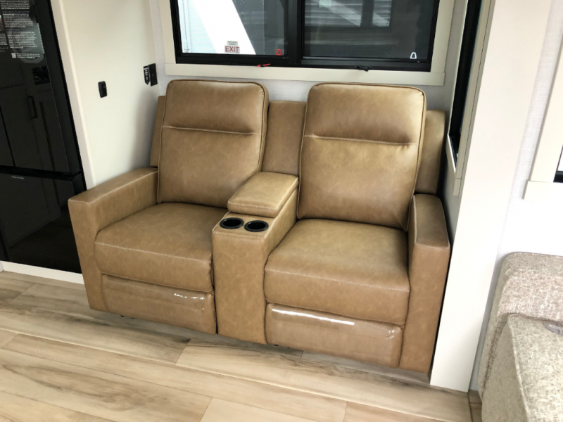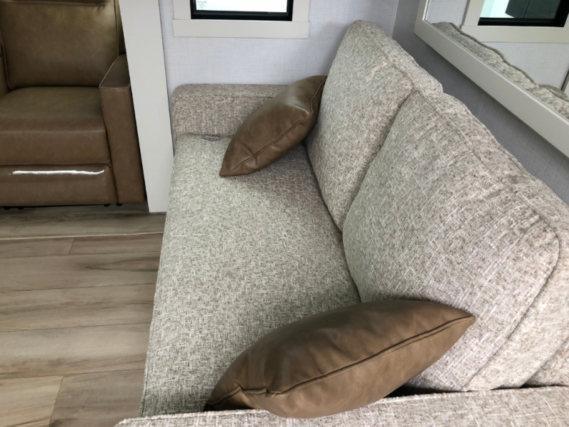 This travel trailer can comfortably sleep four with the king bed in the private bedroom and the tri-fold sofa in the main living area! The full bath features a spacious 42" x 30" shower with a built-in seat and Maxxair fan to name a few comforts. The front private bedroom features a 66" x 80" king bed with a MaxSpace Split-Level Wardrobe underneath to store shoes, clothes, and more! A slide out in the combined living area and rear kitchen makes your space more open, and you'll enjoy relaxing on the theater seating here in the evenings. The full kitchen includes a three burner stovetop, residential 30" convection microwave, 12 cu. ft. 12V refrigerator, plus a trash bin and Stow N' Go paper towel holder for added convenience. You can choose to eat outdoors under the 19' electric awning with LED lights or stay inside to dine at the pull-out dining table with a drawer for added storage!