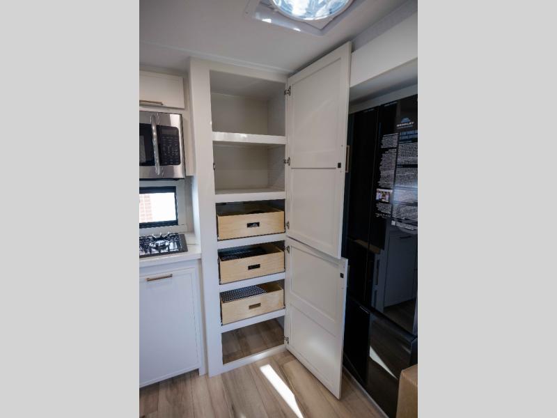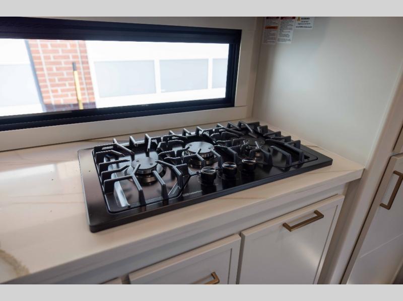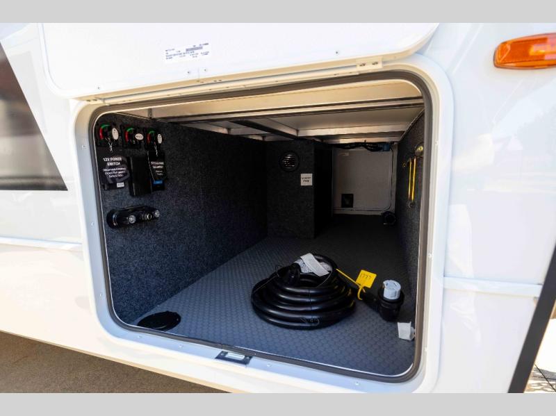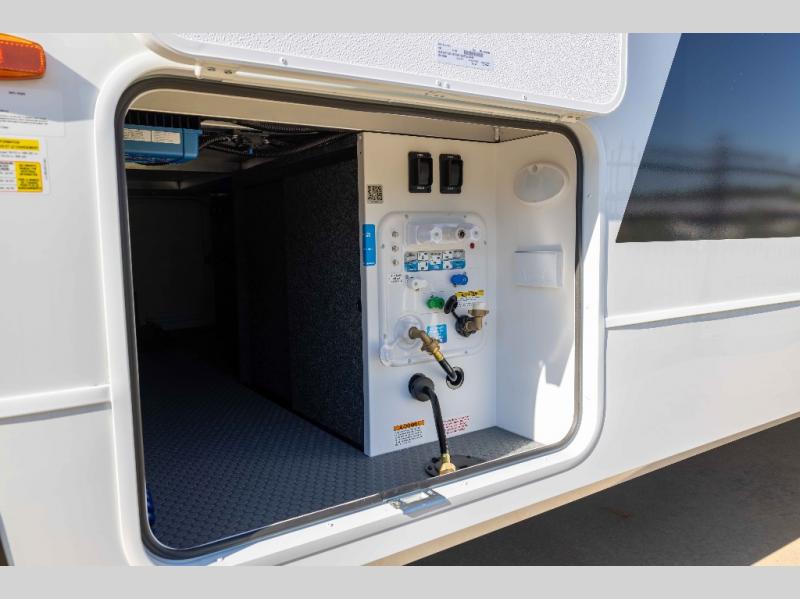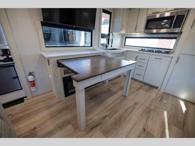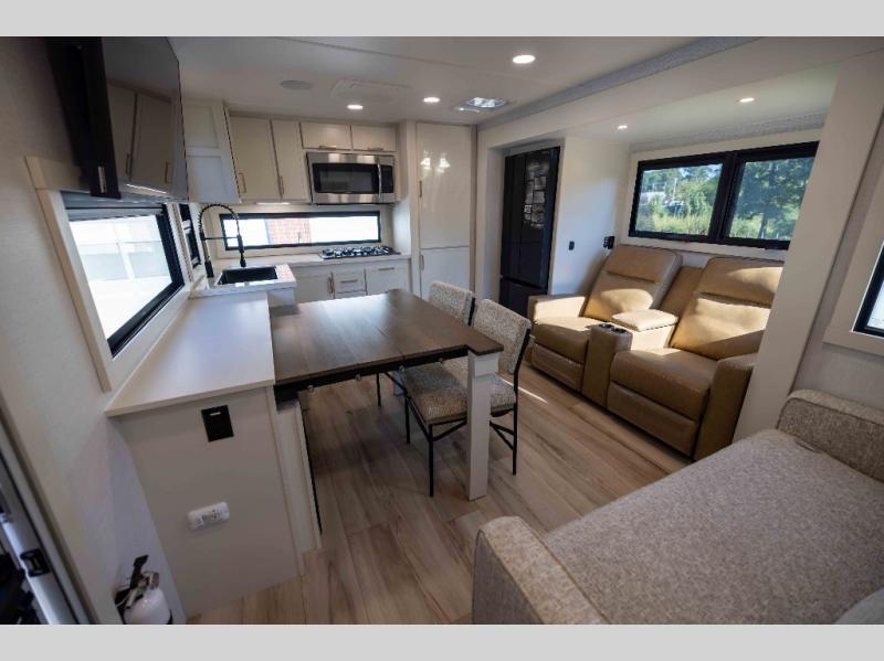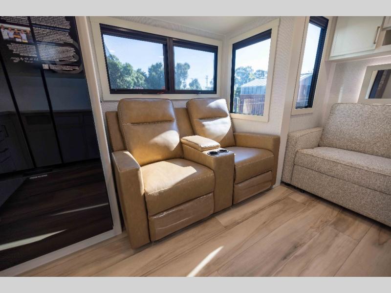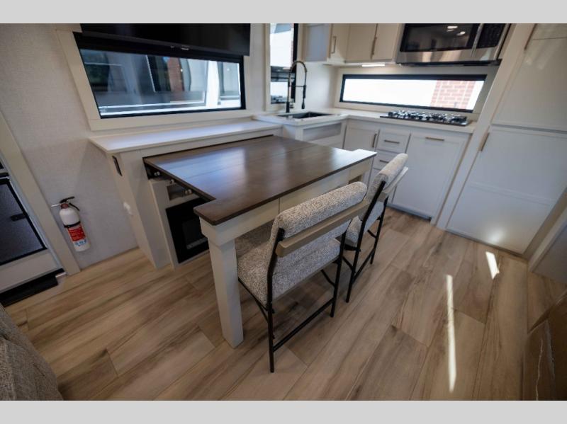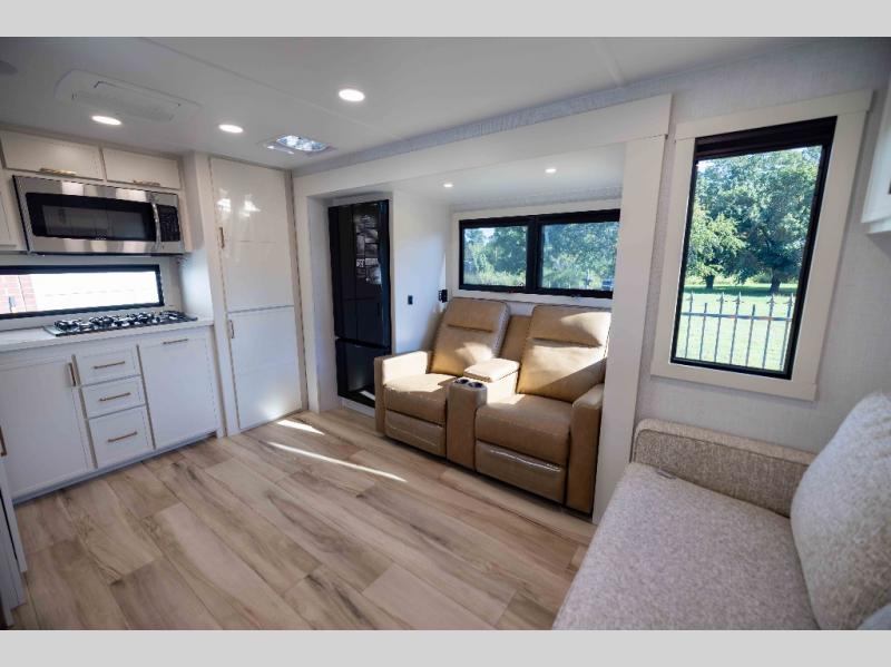 This travel trailer can comfortably sleep four with the king bed in the private bedroom and the tri-fold sofa in the main living area! The full bath features a spacious 42" x 30" shower with a built-in seat and Maxxair fan to name a few comforts. The front private bedroom features a 66" x 80" king bed with a MaxSpace Split-Level Wardrobe underneath to store shoes, clothes, and more! A slide out in the combined living area and rear kitchen makes your space more open, and you'll enjoy relaxing on the theater seating here in the evenings. The full kitchen includes a three burner stovetop, residential 30" convection microwave, 12 cu. ft. 12V refrigerator, plus a trash bin and Stow N' Go paper towel holder for added convenience. You can choose to eat outdoors under the 19' electric awning with LED lights or stay inside to dine at the pull-out dining table with a drawer for added storage!