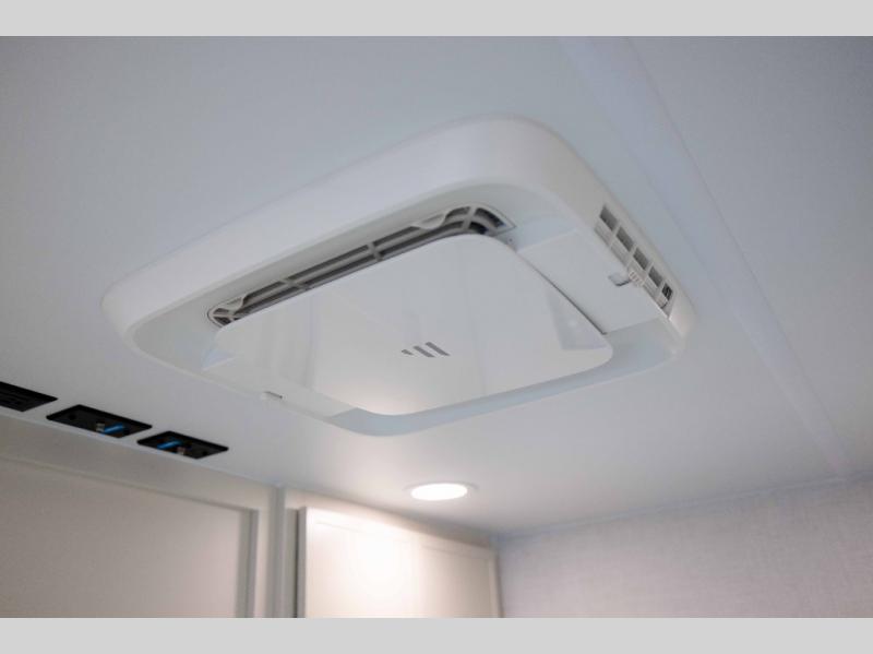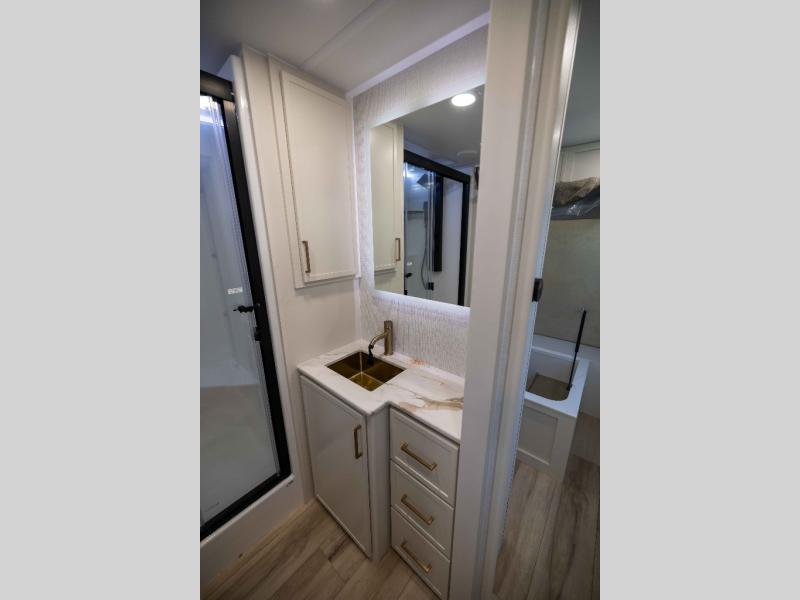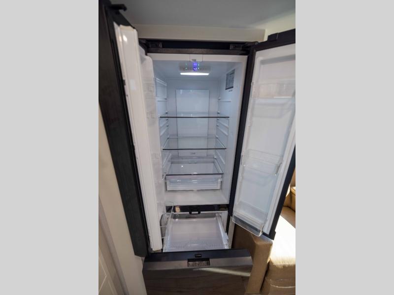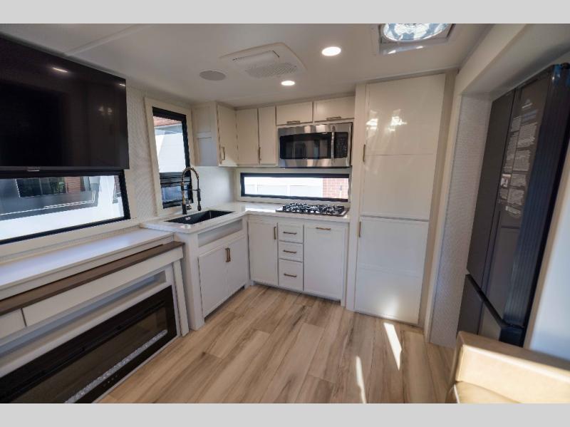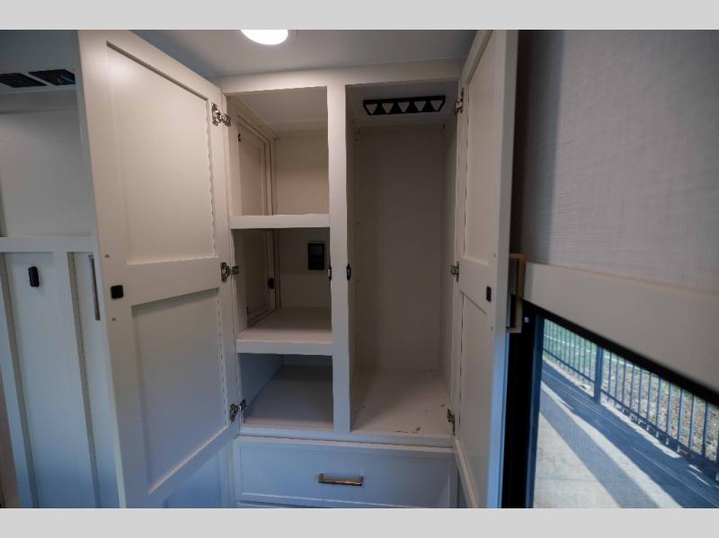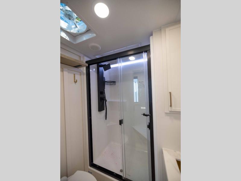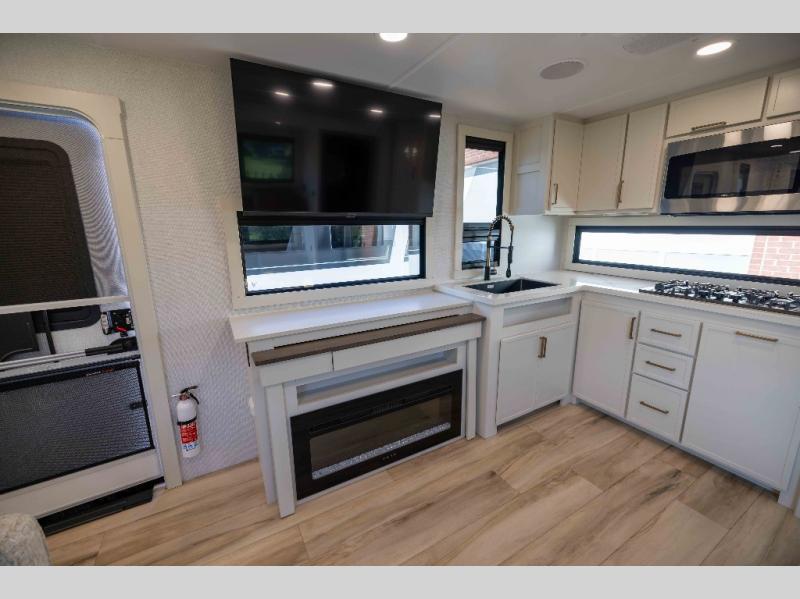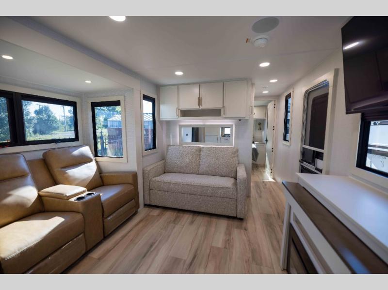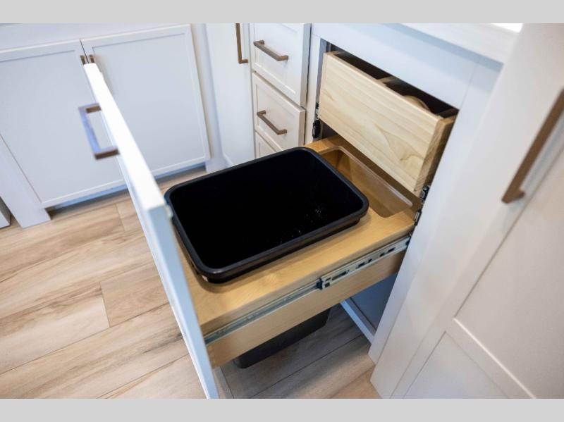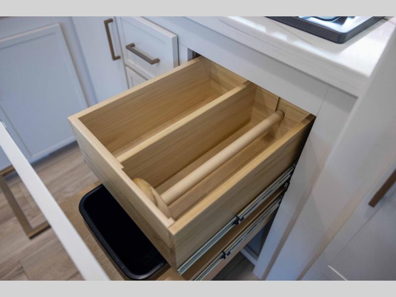 This travel trailer can comfortably sleep four with the king bed in the private bedroom and the tri-fold sofa in the main living area! The full bath features a spacious 42" x 30" shower with a built-in seat and Maxxair fan to name a few comforts. The front private bedroom features a 66" x 80" king bed with a MaxSpace Split-Level Wardrobe underneath to store shoes, clothes, and more! A slide out in the combined living area and rear kitchen makes your space more open, and you'll enjoy relaxing on the theater seating here in the evenings. The full kitchen includes a three burner stovetop, residential 30" convection microwave, 12 cu. ft. 12V refrigerator, plus a trash bin and Stow N' Go paper towel holder for added convenience. You can choose to eat outdoors under the 19' electric awning with LED lights or stay inside to dine at the pull-out dining table with a drawer for added storage!