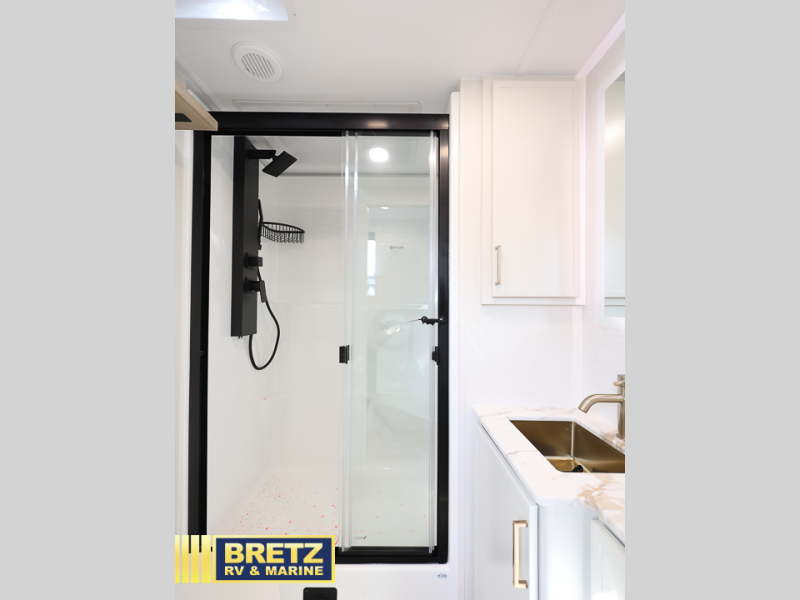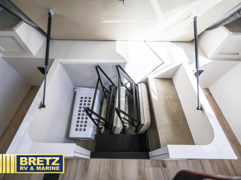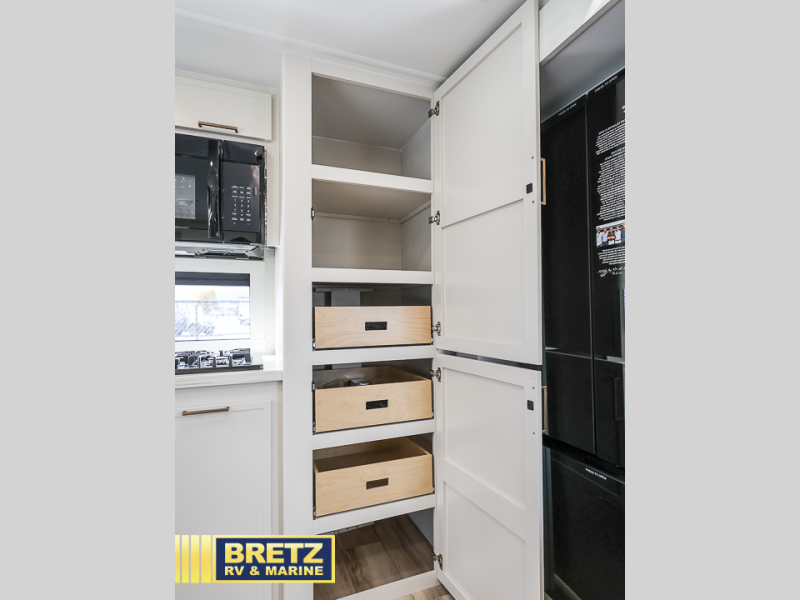 This travel trailer can comfortably sleep four with the king bed in the private bedroom and the tri-fold sofa in the main living area! The full bath features a spacious 42" x 30" shower with a built-in seat and Maxxair fan to name a few comforts. The front private bedroom features a 66" x 80" king bed with a MaxSpace Split-Level Wardrobe underneath to store shoes, clothes, and more! A slide out in the combined living area and rear kitchen makes your space more open, and you'll enjoy relaxing on the theater seating here in the evenings. The full kitchen includes a three burner stovetop, residential 30" convection microwave, 12 cu. ft. 12V refrigerator, plus a trash bin and Stow N' Go paper towel holder for added convenience. You can choose to eat outdoors under the 19' electric awning with LED lights or stay inside to dine at the pull-out dining table with a drawer for added storage!