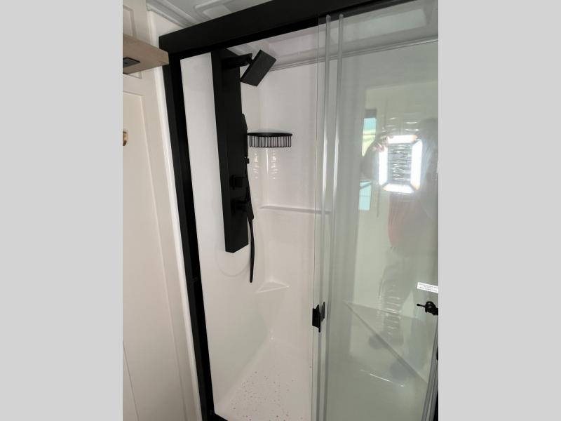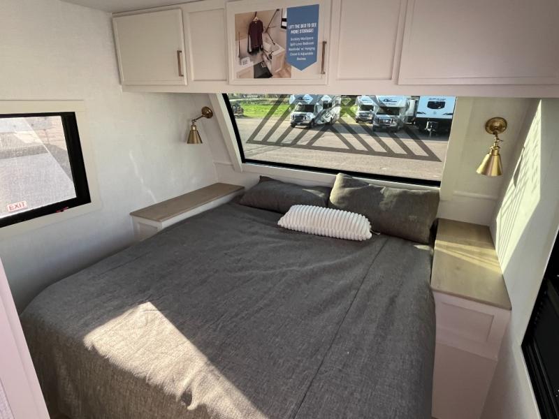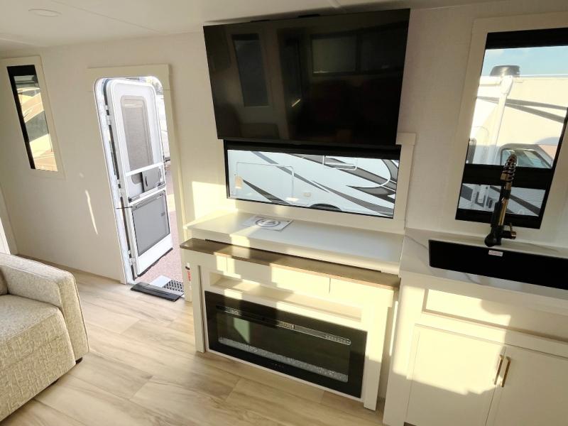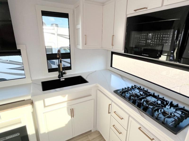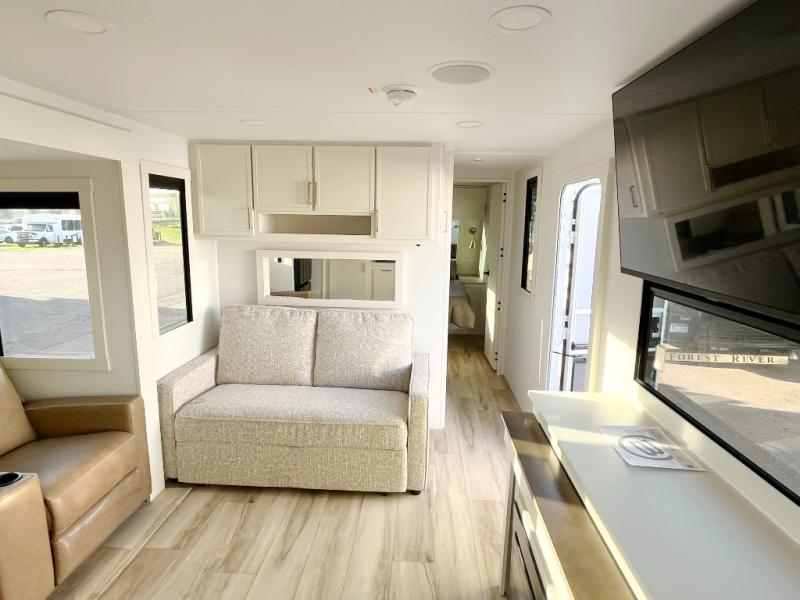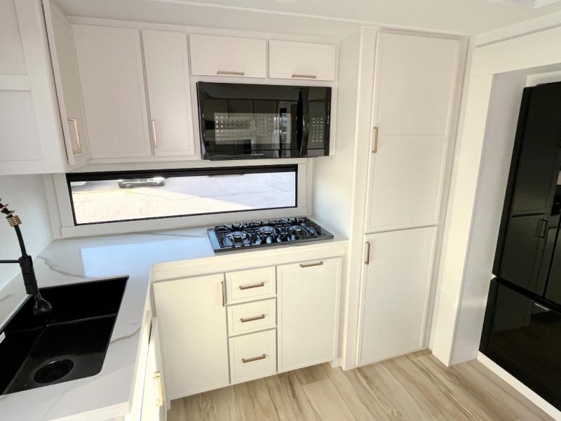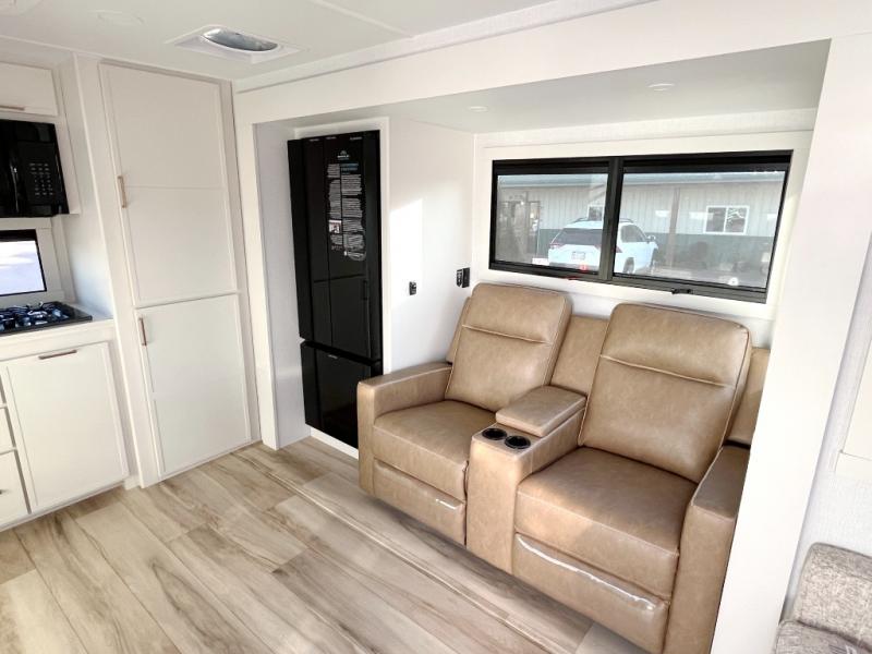 This travel trailer can comfortably sleep four with the king bed in the private bedroom and the tri-fold sofa in the main living area! The full bath features a spacious 42" x 30" shower with a built-in seat and Maxxair fan to name a few comforts. The front private bedroom features a 66" x 80" king bed with a MaxSpace Split-Level Wardrobe underneath to store shoes, clothes, and more! A slide out in the combined living area and rear kitchen makes your space more open, and you'll enjoy relaxing on the theater seating here in the evenings. The full kitchen includes a three burner stovetop, residential 30" convection microwave, 12 cu. ft. 12V refrigerator, plus a trash bin and Stow N' Go paper towel holder for added convenience. You can choose to eat outdoors under the 19' electric awning with LED lights or stay inside to dine at the pull-out dining table with a drawer for added storage!