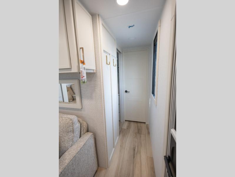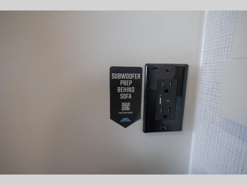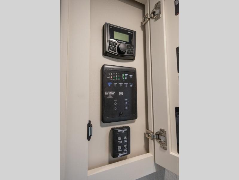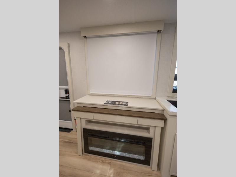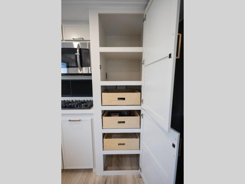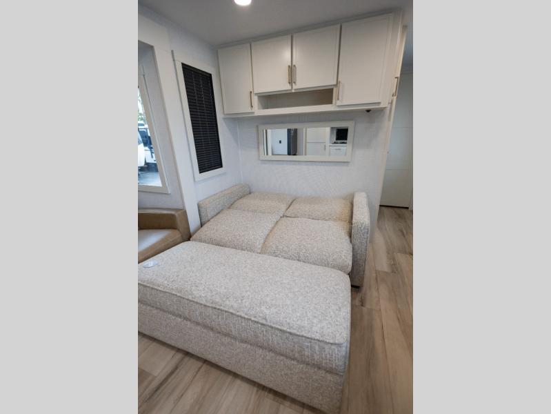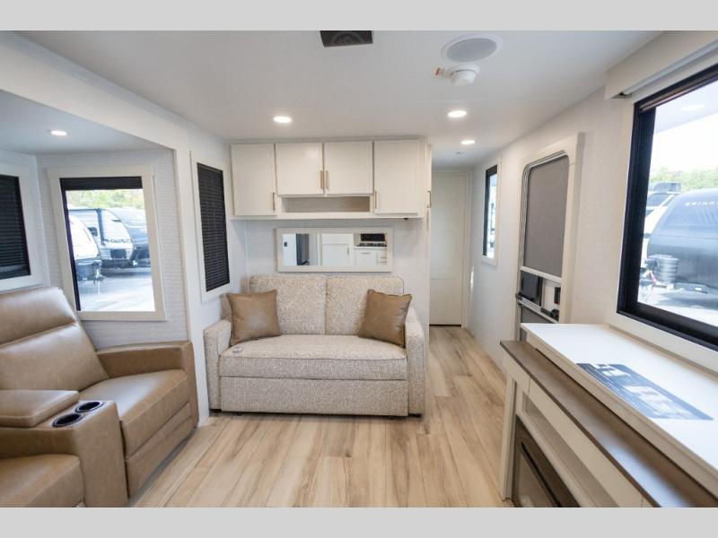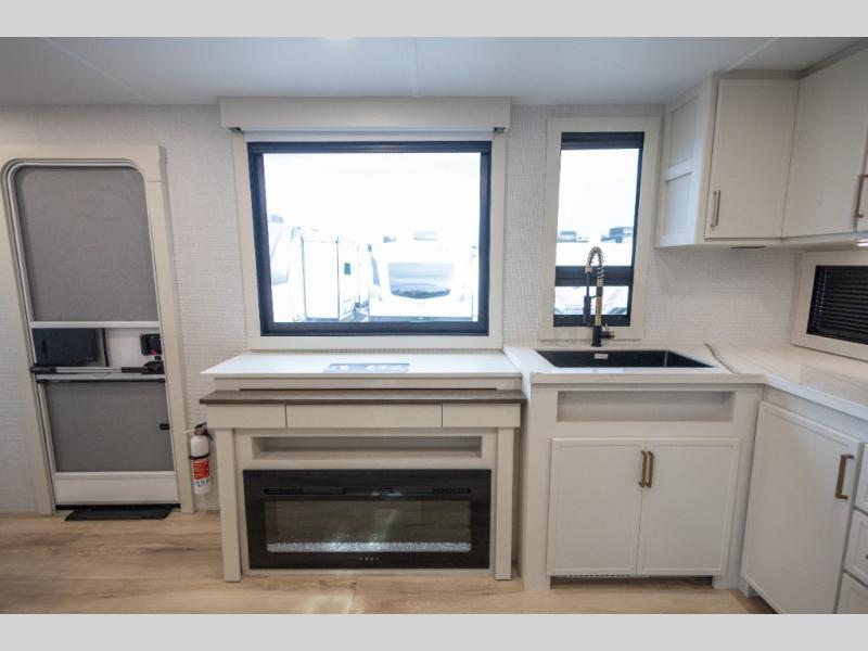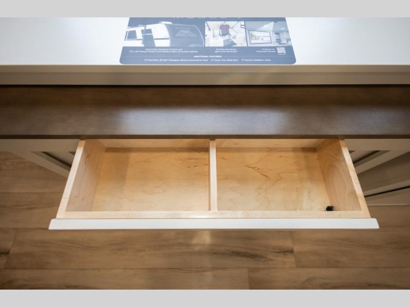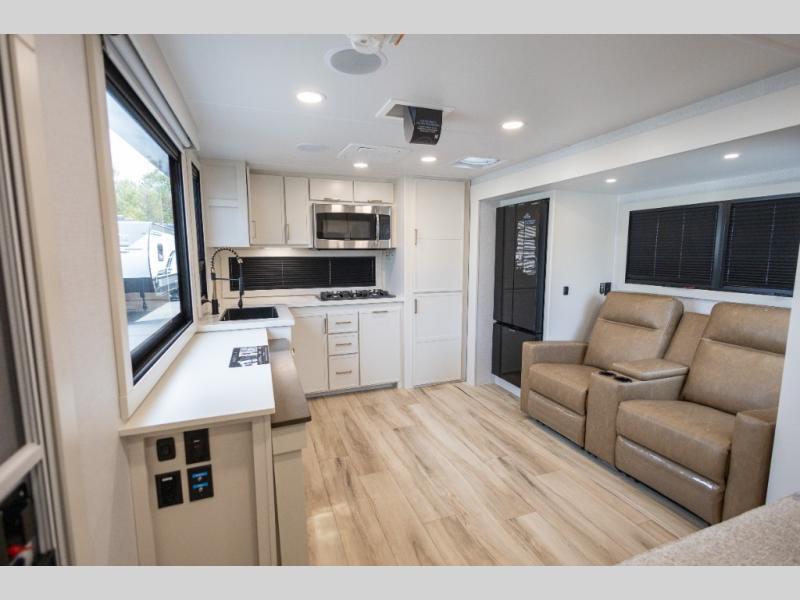 This travel trailer can comfortably sleep four with the king bed in the private bedroom and the tri-fold sofa in the main living area! The full bath features a spacious 42" x 30" shower with a built-in seat and Maxxair fan to name a few comforts. The front private bedroom features a 66" x 80" king bed with a MaxSpace Split-Level Wardrobe underneath to store shoes, clothes, and more! A slide out in the combined living area and rear kitchen makes your space more open, and you'll enjoy relaxing on the theater seating here in the evenings. The full kitchen includes a three burner stovetop, residential 30" convection microwave, 12 cu. ft. 12V refrigerator, plus a trash bin and Stow N' Go paper towel holder for added convenience. You can choose to eat outdoors under the 19' electric awning with LED lights or stay inside to dine at the pull-out dining table with a drawer for added storage!