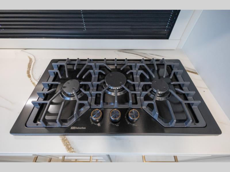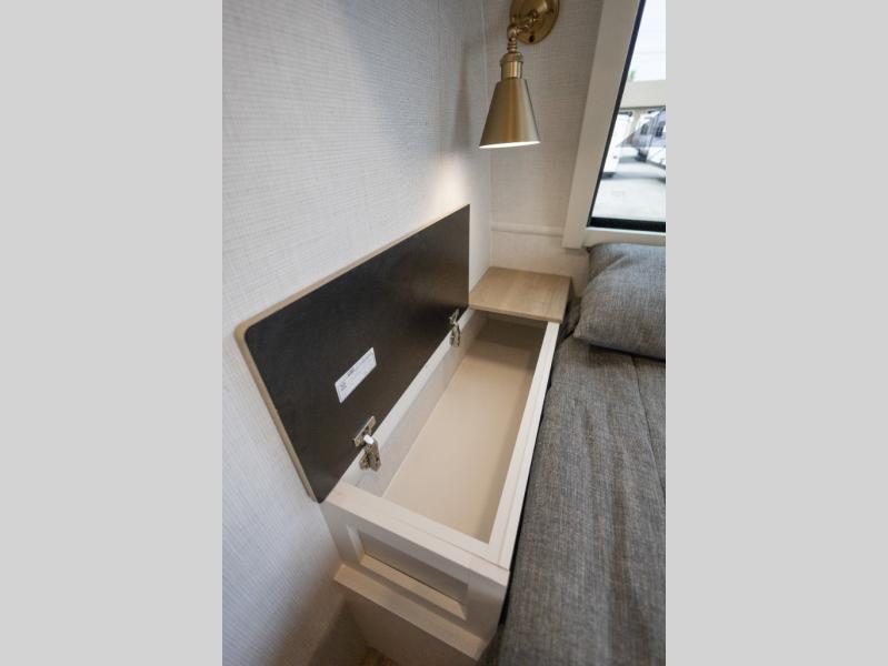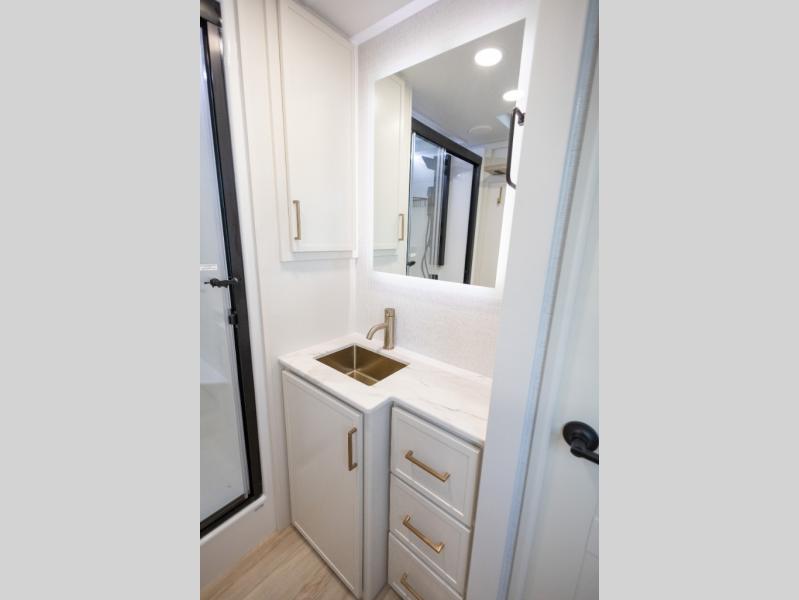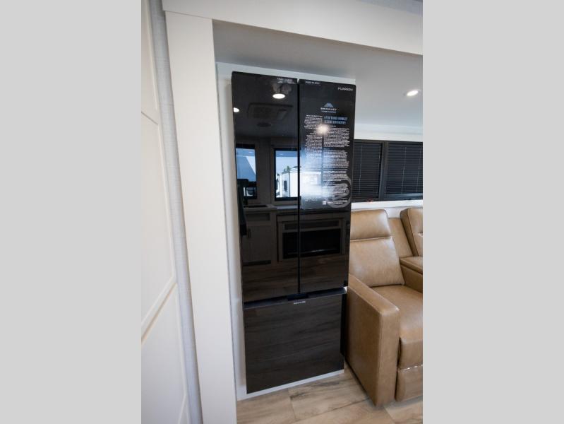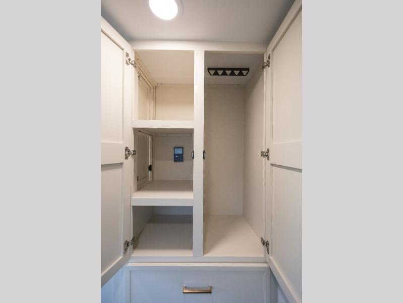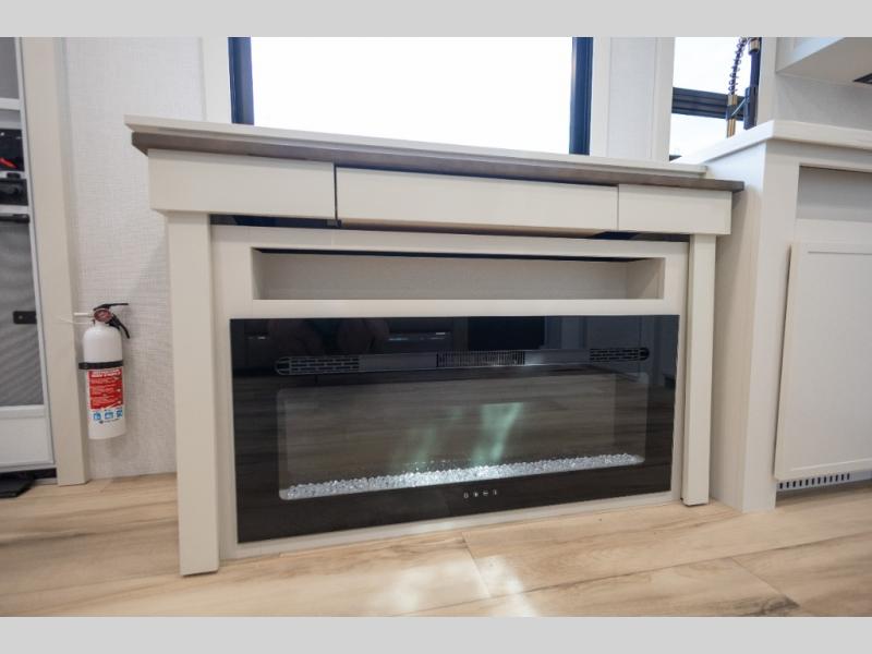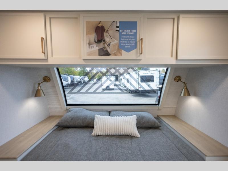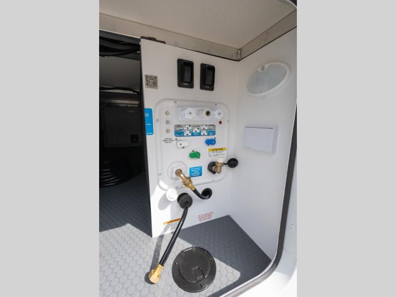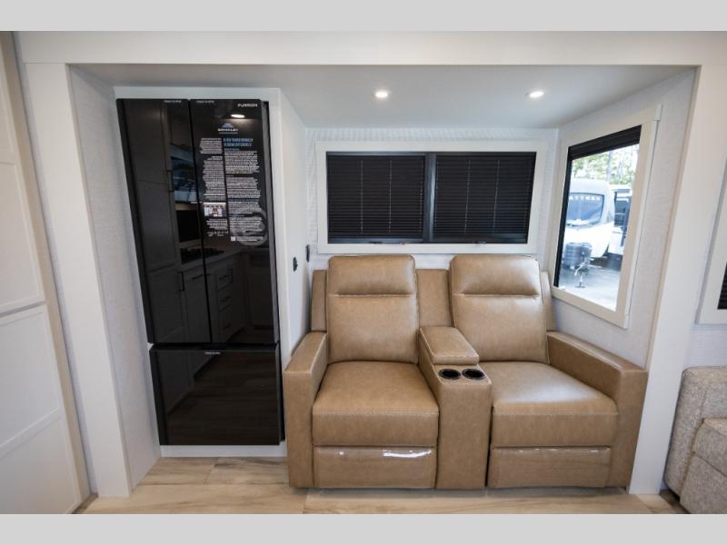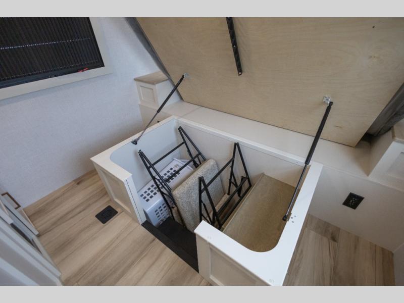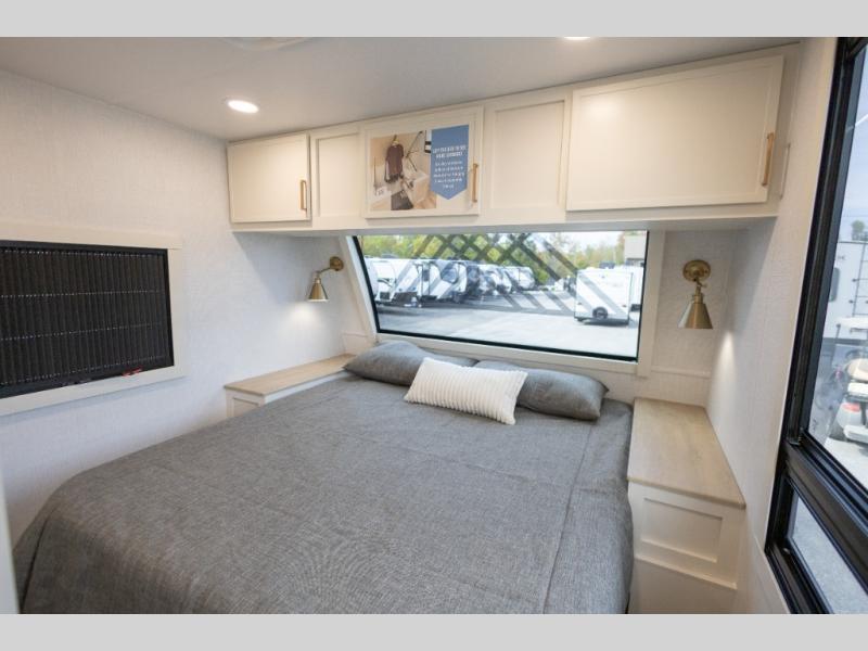 This travel trailer can comfortably sleep four with the king bed in the private bedroom and the tri-fold sofa in the main living area! The full bath features a spacious 42" x 30" shower with a built-in seat and Maxxair fan to name a few comforts. The front private bedroom features a 66" x 80" king bed with a MaxSpace Split-Level Wardrobe underneath to store shoes, clothes, and more! A slide out in the combined living area and rear kitchen makes your space more open, and you'll enjoy relaxing on the theater seating here in the evenings. The full kitchen includes a three burner stovetop, residential 30" convection microwave, 12 cu. ft. 12V refrigerator, plus a trash bin and Stow N' Go paper towel holder for added convenience. You can choose to eat outdoors under the 19' electric awning with LED lights or stay inside to dine at the pull-out dining table with a drawer for added storage!