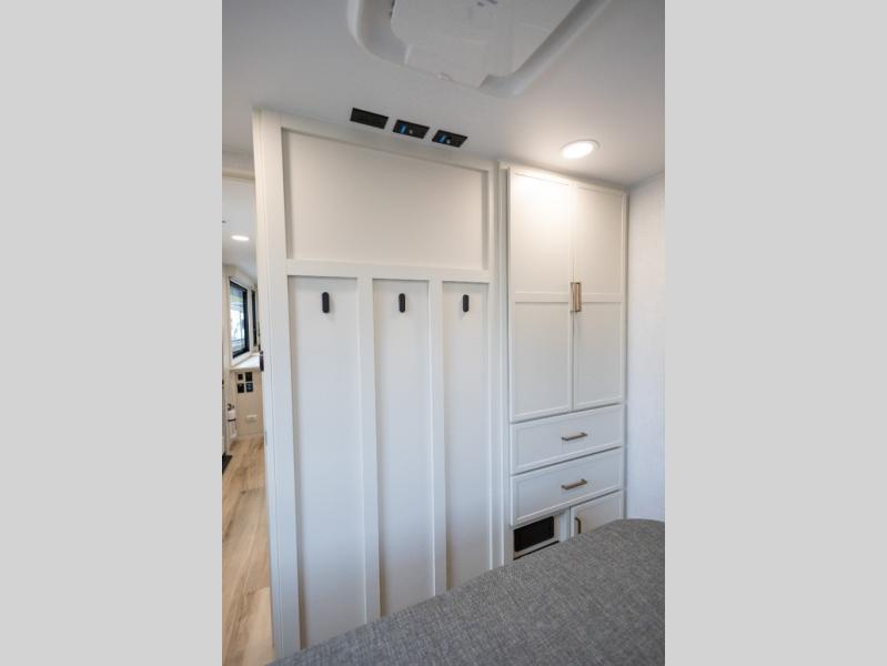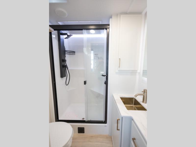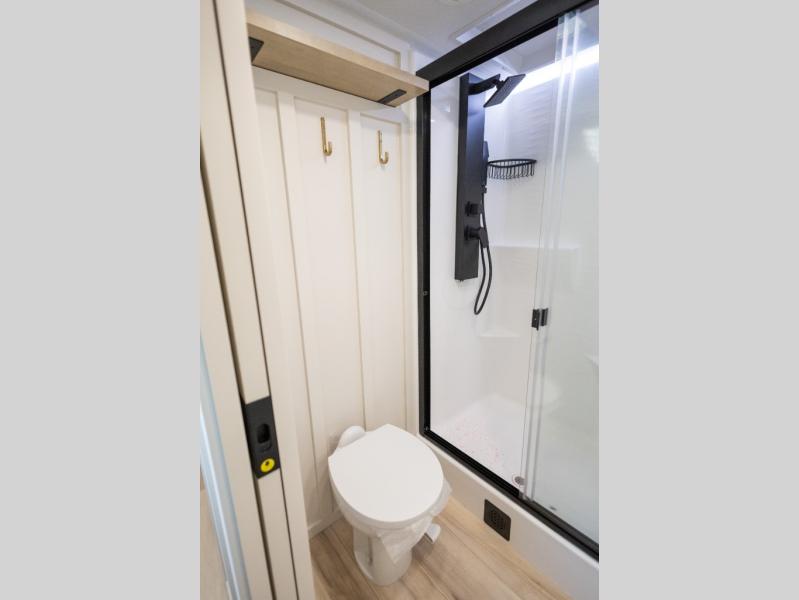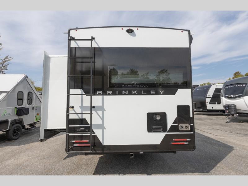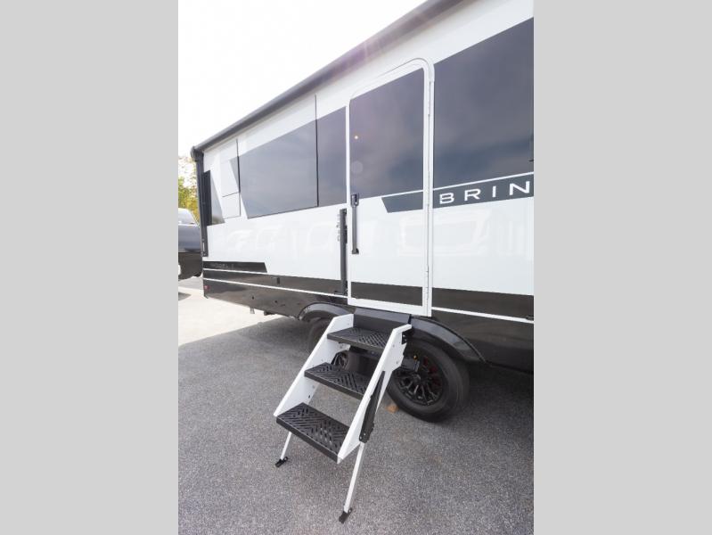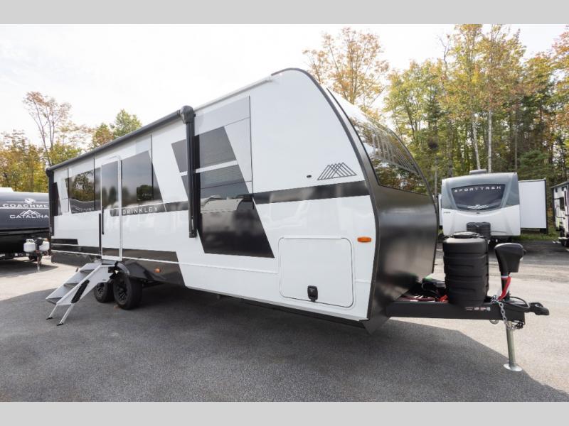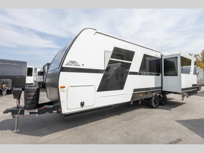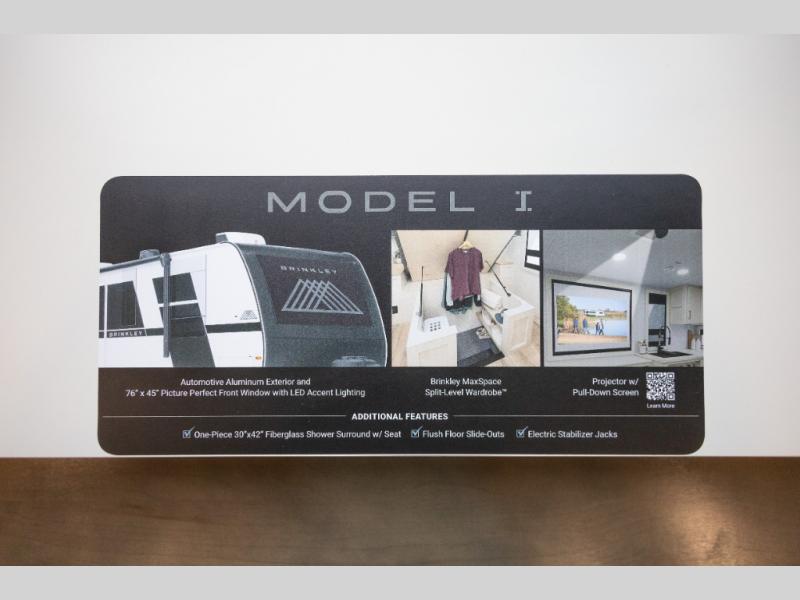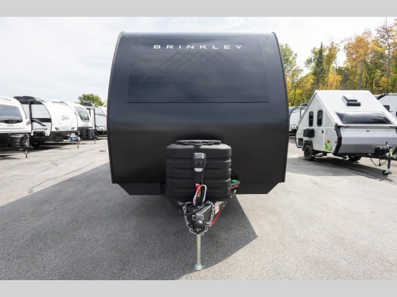 The lightweight Model I travel trailer by Brinkley is the perfect choice for those looking for an easy tow and at-home comforts! There is a drop-frame chassis, high-performance Road Armor suspension equalizer system, and Demco EZ Latch trailer coupler that automatically latches when dropped onto a hitch ball without the need of a safety pin. Additional exterior features include square Euro frameless windows, automotive-grade paint, full-width LED strip lighting in the pass-thru, and a pet & property security campside tie-down to keep your gear and furry friends safe. Inside, you'll be wowed by Brinkley's CraftSense wood trim construction, residential solid surface kitchen countertops, dimmable bedroom lights, and marine-grade neon LED shower lighting to name a few stand-out features!