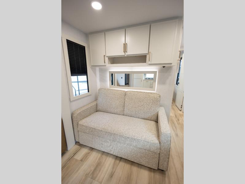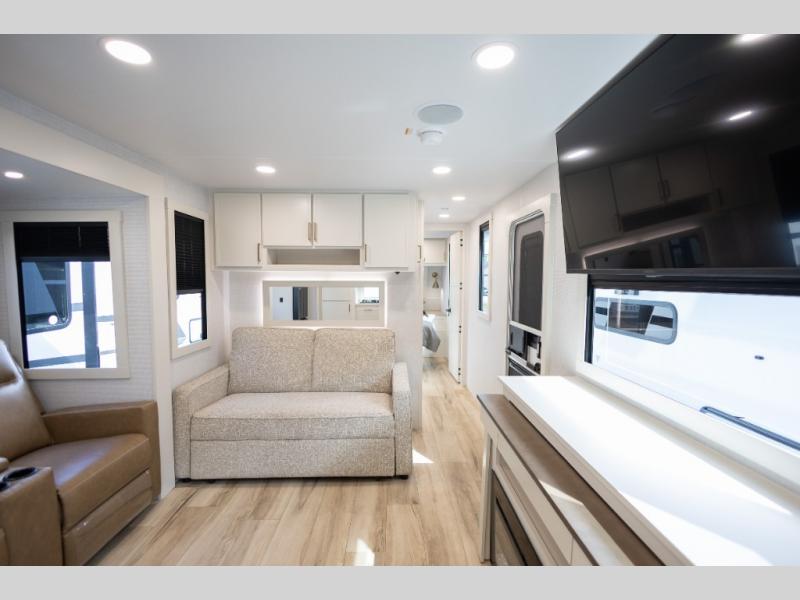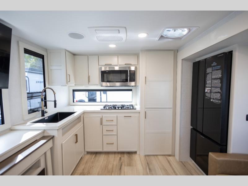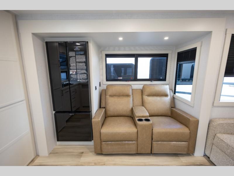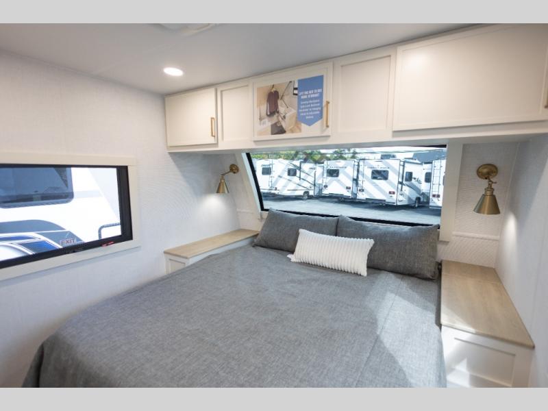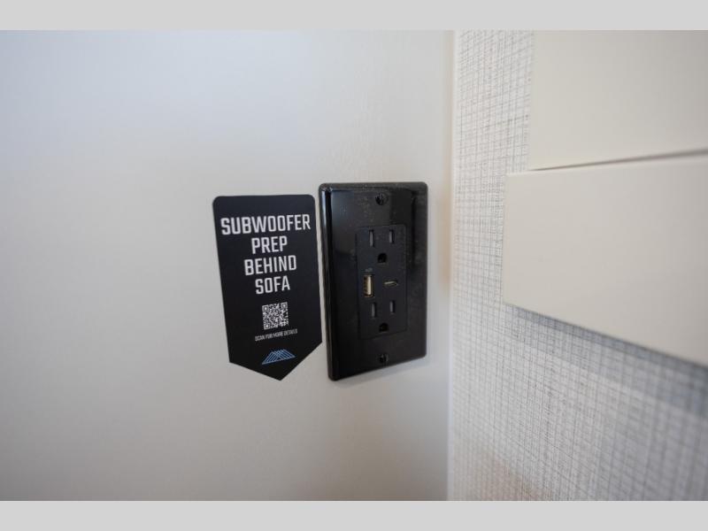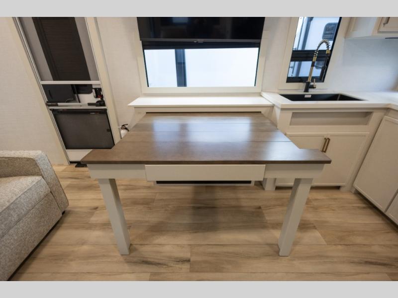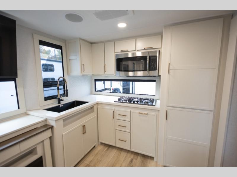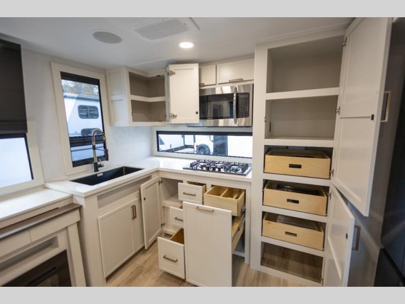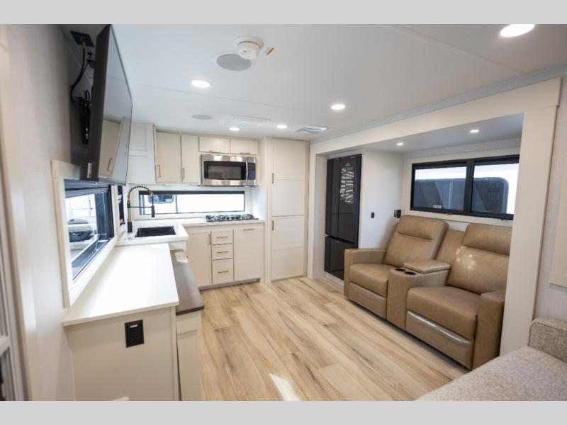 This travel trailer can comfortably sleep four with the king bed in the private bedroom and the tri-fold sofa in the main living area! The full bath features a spacious 42" x 30" shower with a built-in seat and Maxxair fan to name a few comforts. The front private bedroom features a 66" x 80" king bed with a MaxSpace Split-Level Wardrobe underneath to store shoes, clothes, and more! A slide out in the combined living area and rear kitchen makes your space more open, and you'll enjoy relaxing on the theater seating here in the evenings. The full kitchen includes a three burner stovetop, residential 30" convection microwave, 12 cu. ft. 12V refrigerator, plus a trash bin and Stow N' Go paper towel holder for added convenience. You can choose to eat outdoors under the 19' electric awning with LED lights or stay inside to dine at the pull-out dining table with a drawer for added storage!