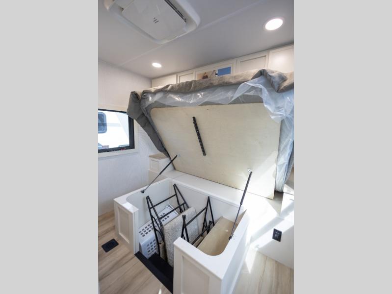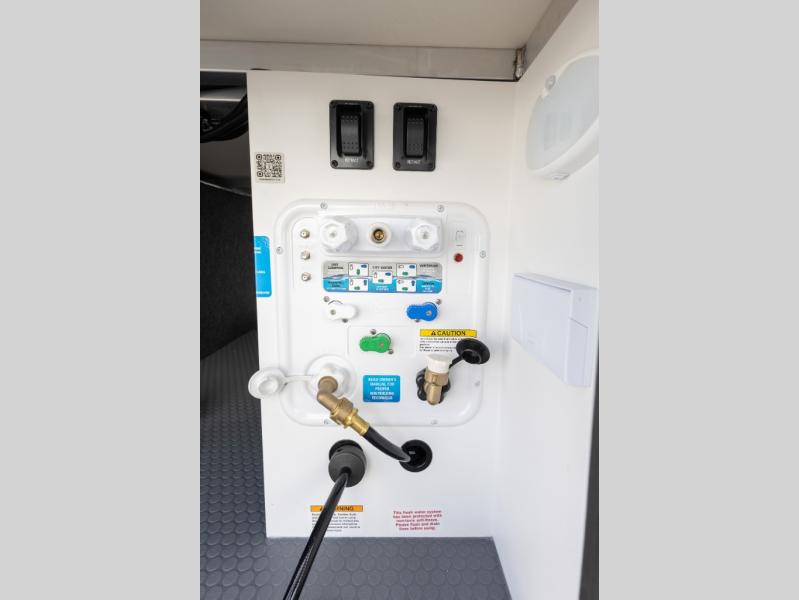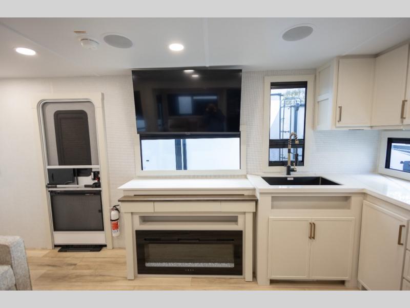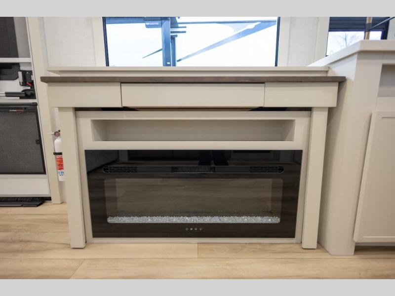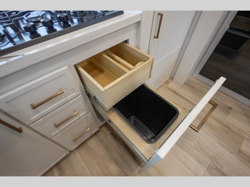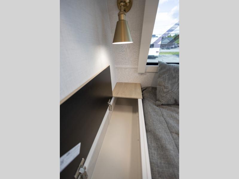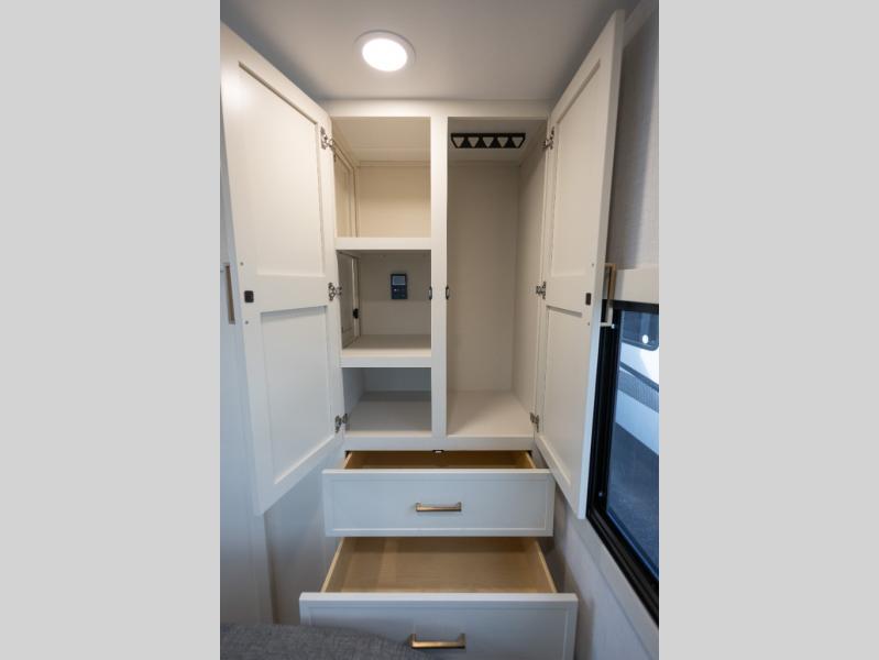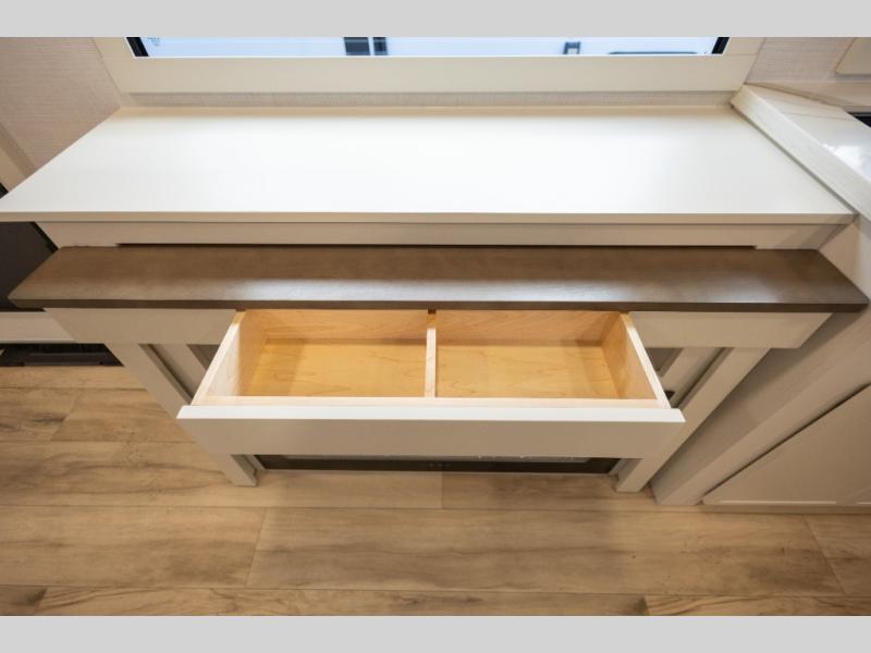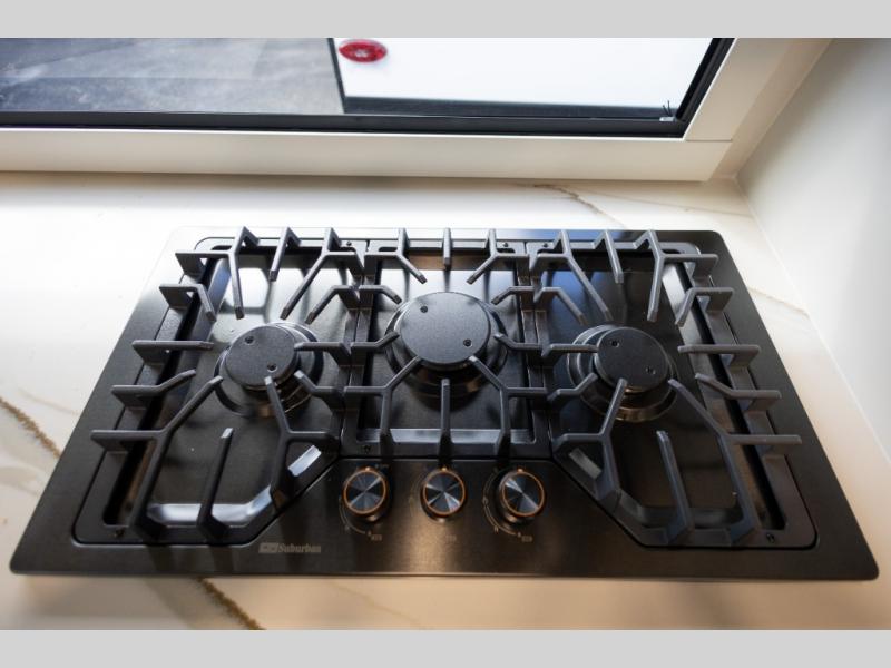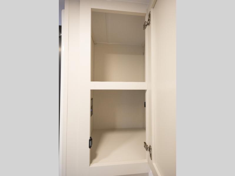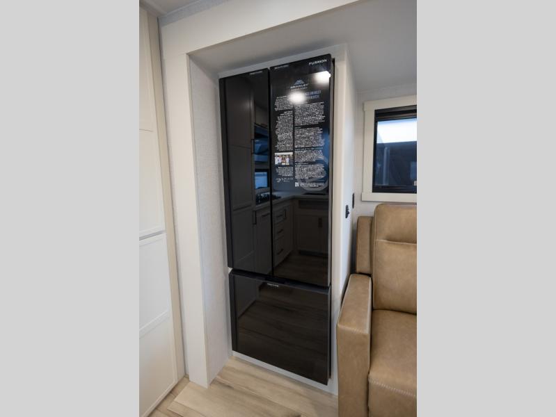 This travel trailer can comfortably sleep four with the king bed in the private bedroom and the tri-fold sofa in the main living area! The full bath features a spacious 42" x 30" shower with a built-in seat and Maxxair fan to name a few comforts. The front private bedroom features a 66" x 80" king bed with a MaxSpace Split-Level Wardrobe underneath to store shoes, clothes, and more! A slide out in the combined living area and rear kitchen makes your space more open, and you'll enjoy relaxing on the theater seating here in the evenings. The full kitchen includes a three burner stovetop, residential 30" convection microwave, 12 cu. ft. 12V refrigerator, plus a trash bin and Stow N' Go paper towel holder for added convenience. You can choose to eat outdoors under the 19' electric awning with LED lights or stay inside to dine at the pull-out dining table with a drawer for added storage!