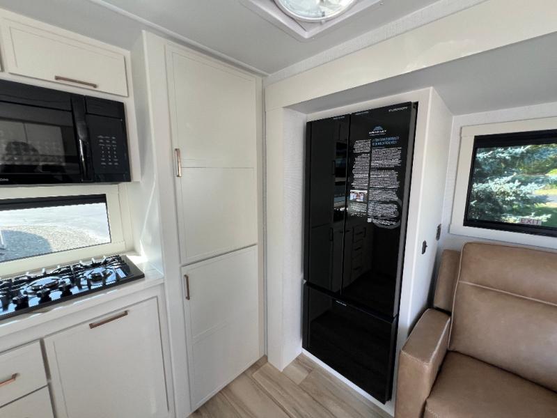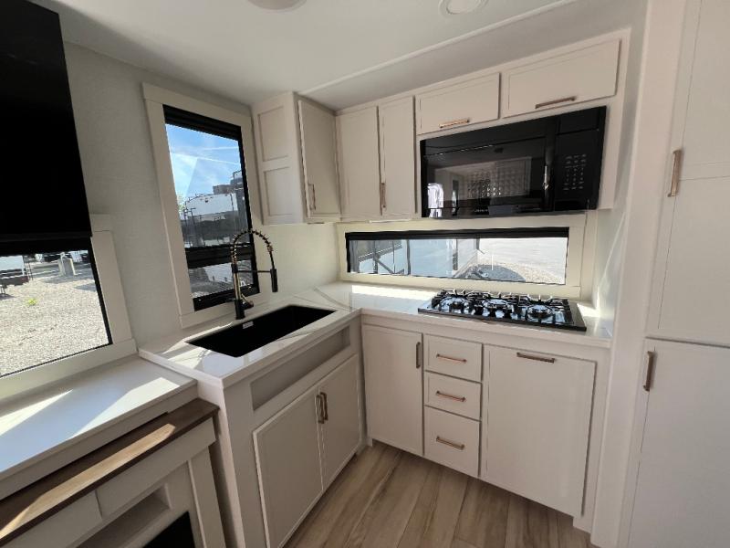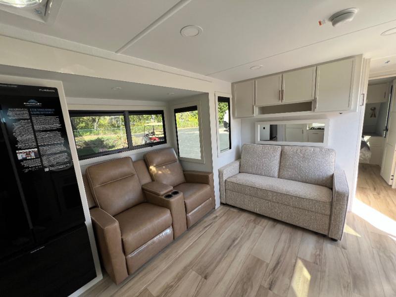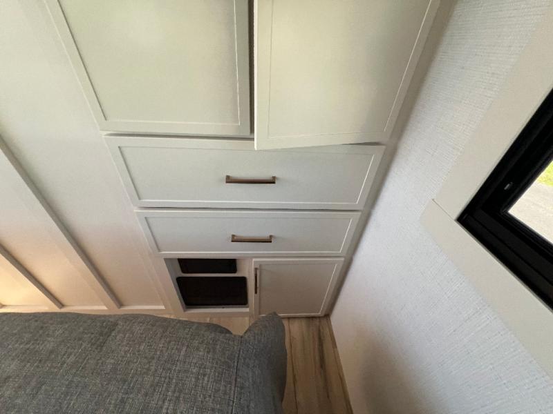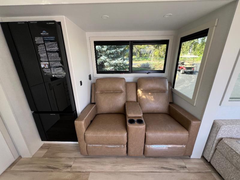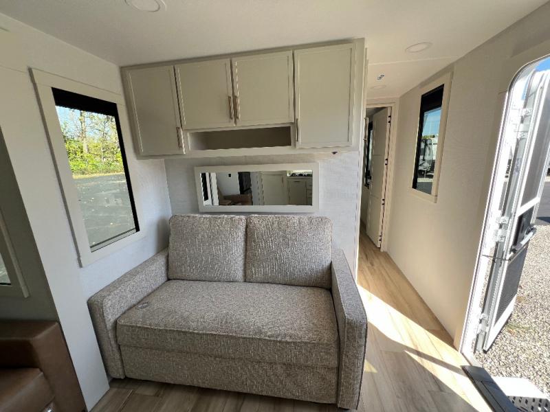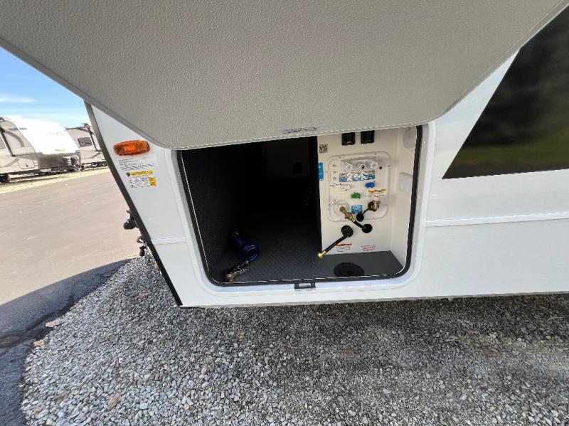 This travel trailer can comfortably sleep four with the king bed in the private bedroom and the tri-fold sofa in the main living area! The full bath features a spacious 42" x 30" shower with a built-in seat and Maxxair fan to name a few comforts. The front private bedroom features a 66" x 80" king bed with a MaxSpace Split-Level Wardrobe underneath to store shoes, clothes, and more! A slide out in the combined living area and rear kitchen makes your space more open, and you'll enjoy relaxing on the theater seating here in the evenings. The full kitchen includes a three burner stovetop, residential 30" convection microwave, 12 cu. ft. 12V refrigerator, plus a trash bin and Stow N' Go paper towel holder for added convenience. You can choose to eat outdoors under the 19' electric awning with LED lights or stay inside to dine at the pull-out dining table with a drawer for added storage!