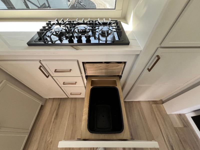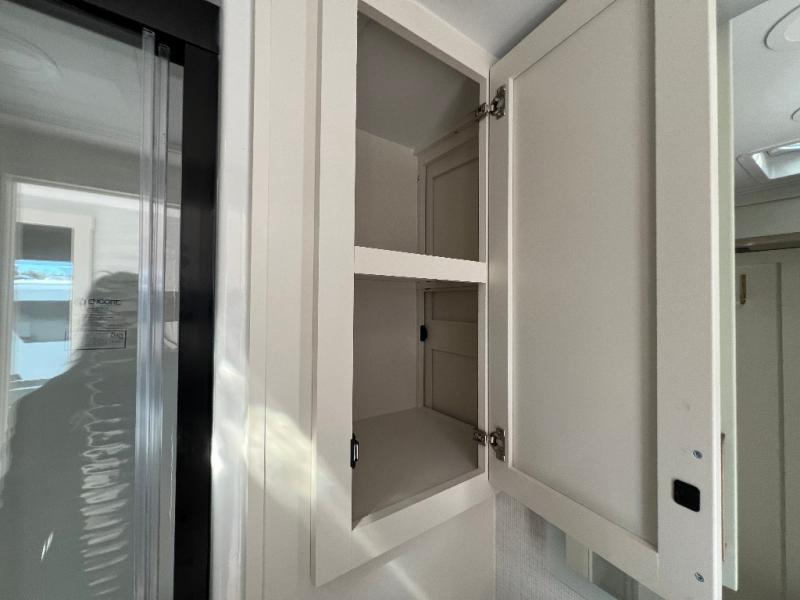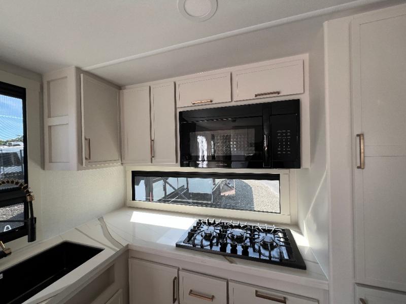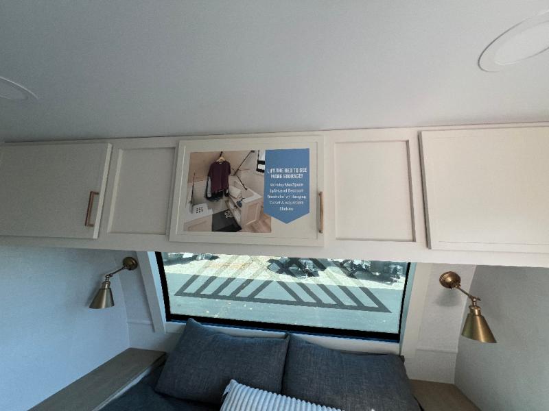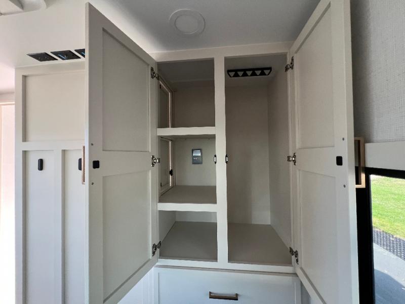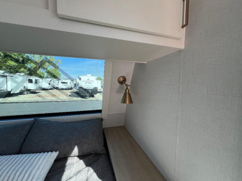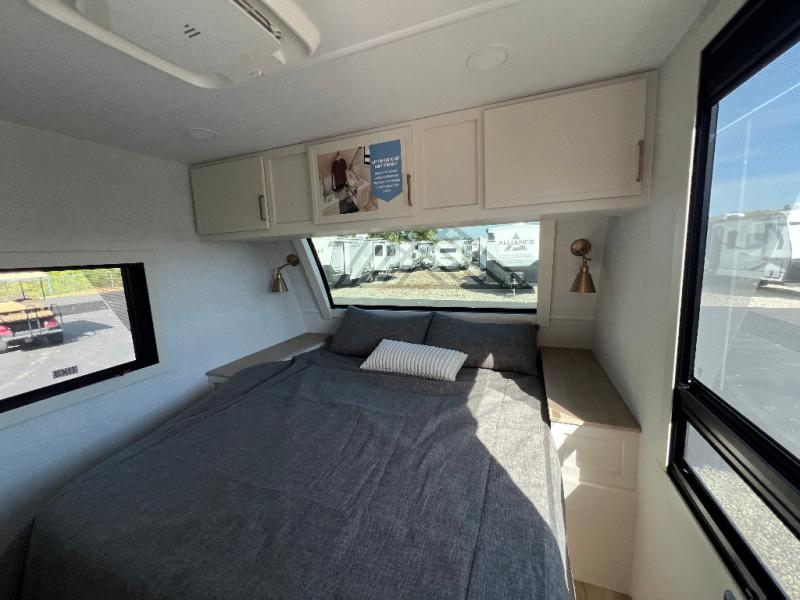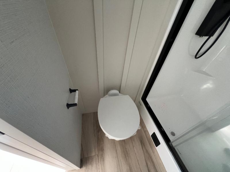 This travel trailer can comfortably sleep four with the king bed in the private bedroom and the tri-fold sofa in the main living area! The full bath features a spacious 42" x 30" shower with a built-in seat and Maxxair fan to name a few comforts. The front private bedroom features a 66" x 80" king bed with a MaxSpace Split-Level Wardrobe underneath to store shoes, clothes, and more! A slide out in the combined living area and rear kitchen makes your space more open, and you'll enjoy relaxing on the theater seating here in the evenings. The full kitchen includes a three burner stovetop, residential 30" convection microwave, 12 cu. ft. 12V refrigerator, plus a trash bin and Stow N' Go paper towel holder for added convenience. You can choose to eat outdoors under the 19' electric awning with LED lights or stay inside to dine at the pull-out dining table with a drawer for added storage!
