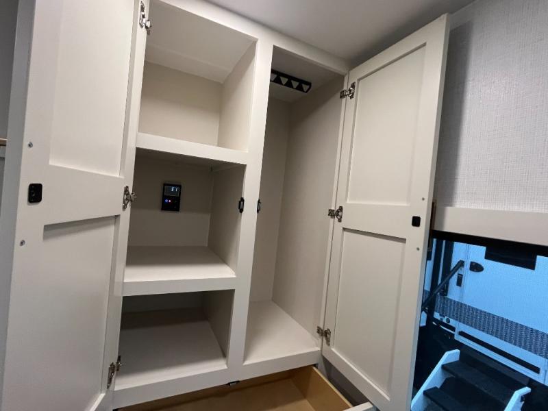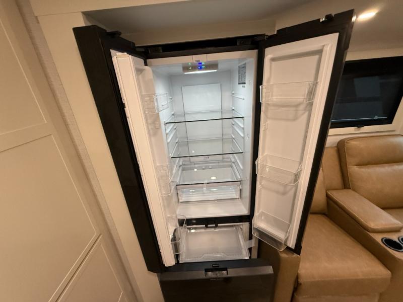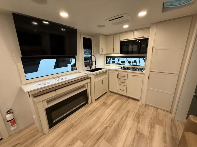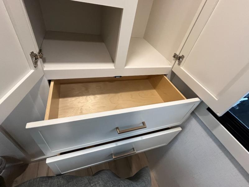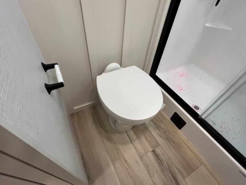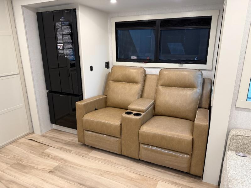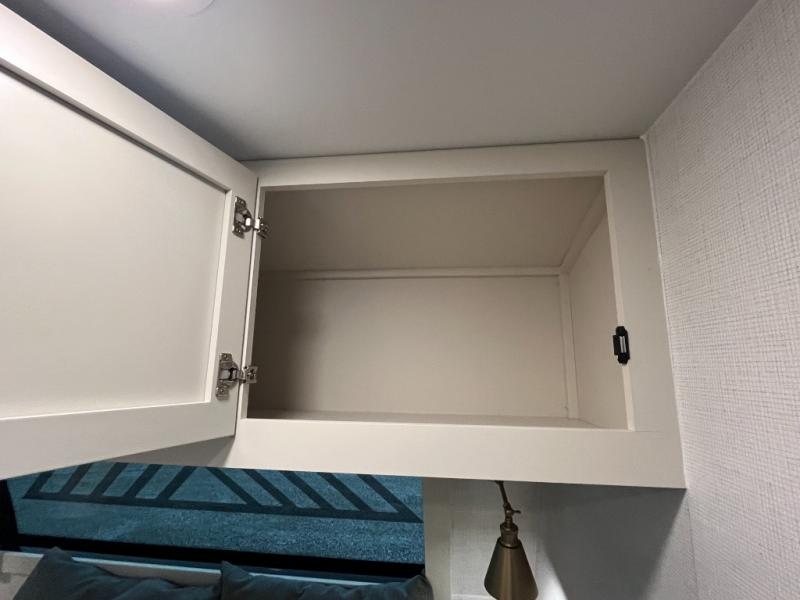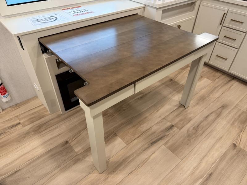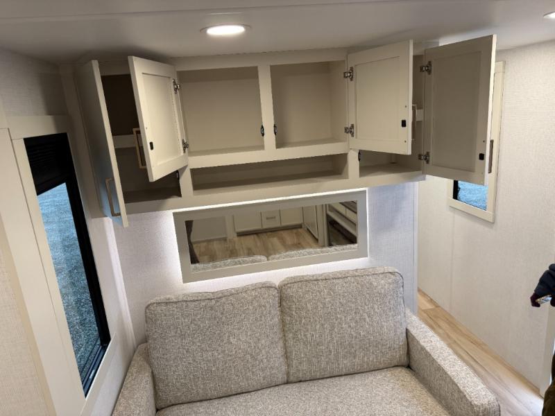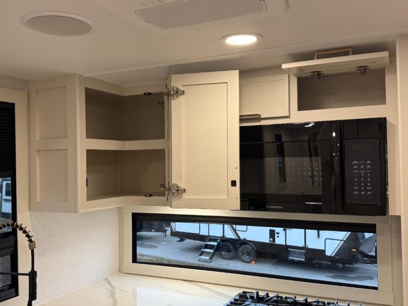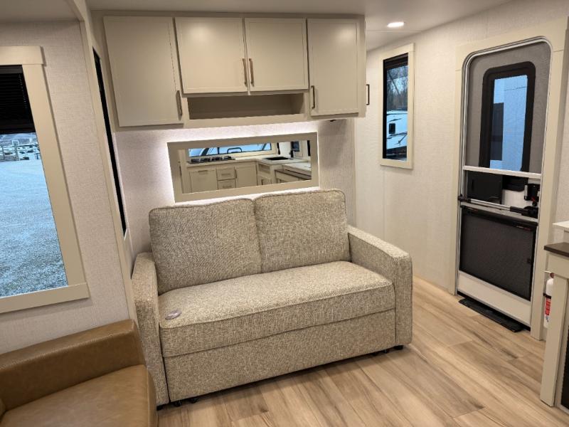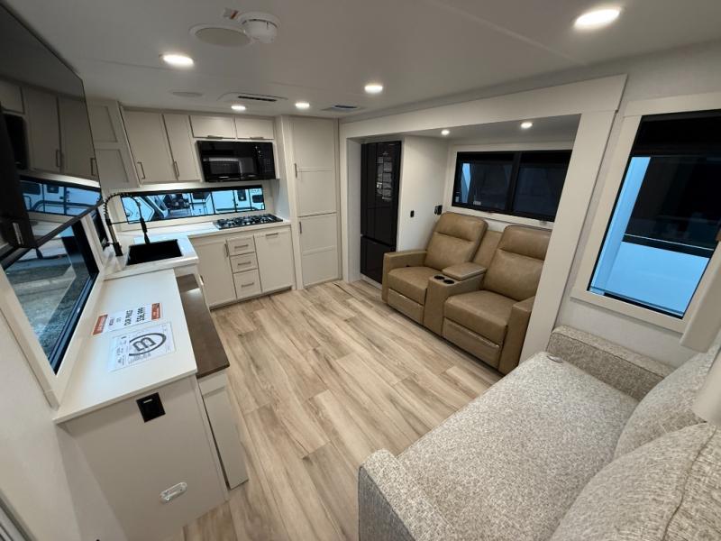 This travel trailer can comfortably sleep four with the king bed in the private bedroom and the tri-fold sofa in the main living area! The full bath features a spacious 42" x 30" shower with a built-in seat and Maxxair fan to name a few comforts. The front private bedroom features a 66" x 80" king bed with a MaxSpace Split-Level Wardrobe underneath to store shoes, clothes, and more! A slide out in the combined living area and rear kitchen makes your space more open, and you'll enjoy relaxing on the theater seating here in the evenings. The full kitchen includes a three burner stovetop, residential 30" convection microwave, 12 cu. ft. 12V refrigerator, plus a trash bin and Stow N' Go paper towel holder for added convenience. You can choose to eat outdoors under the 19' electric awning with LED lights or stay inside to dine at the pull-out dining table with a drawer for added storage!