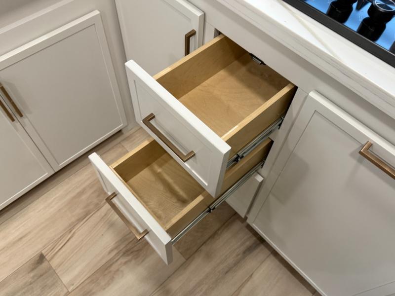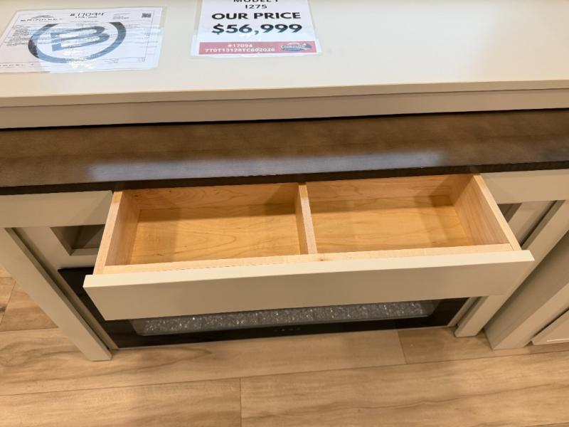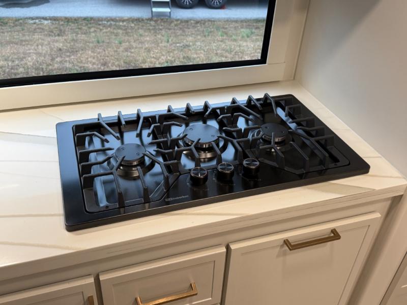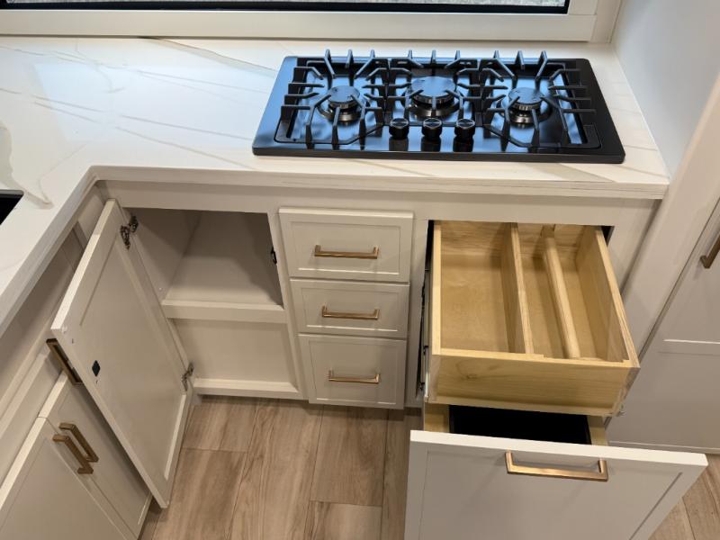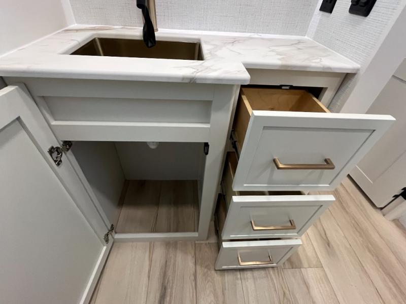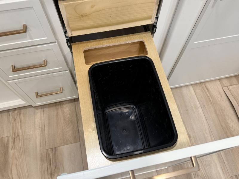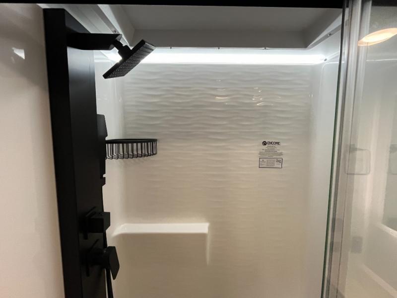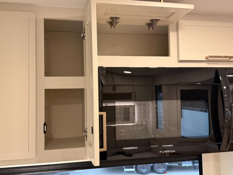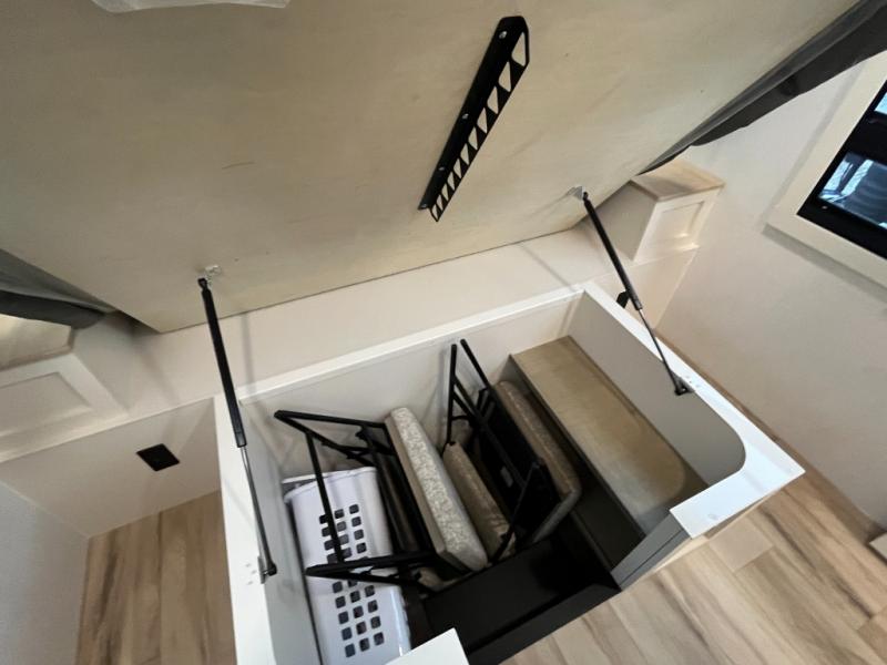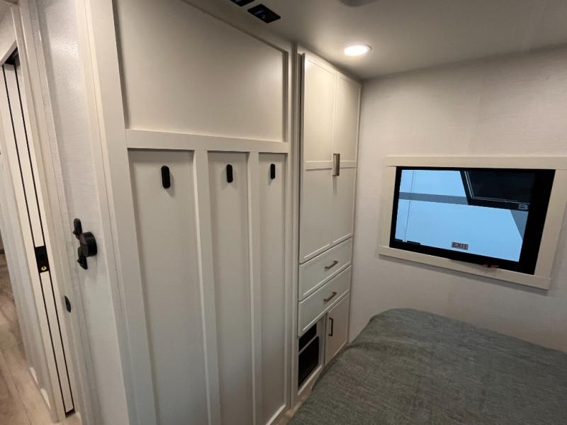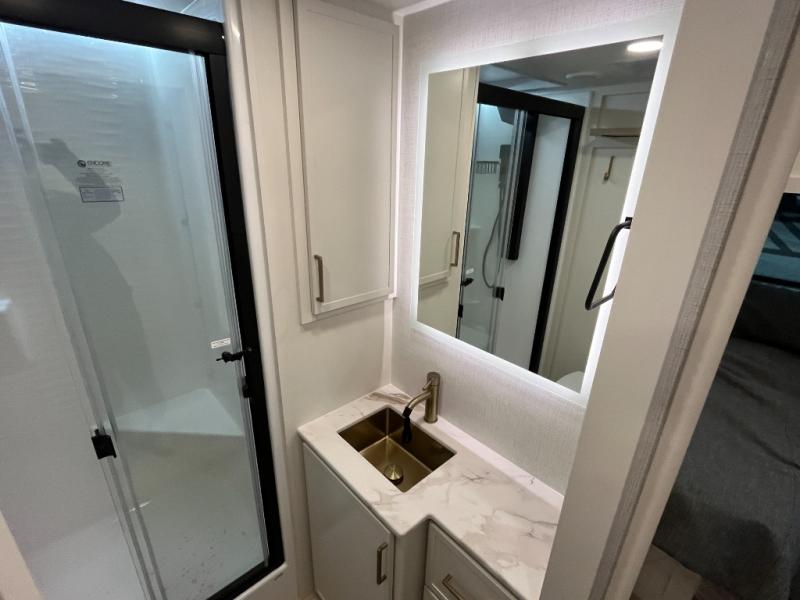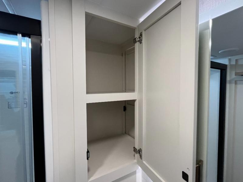 This travel trailer can comfortably sleep four with the king bed in the private bedroom and the tri-fold sofa in the main living area! The full bath features a spacious 42" x 30" shower with a built-in seat and Maxxair fan to name a few comforts. The front private bedroom features a 66" x 80" king bed with a MaxSpace Split-Level Wardrobe underneath to store shoes, clothes, and more! A slide out in the combined living area and rear kitchen makes your space more open, and you'll enjoy relaxing on the theater seating here in the evenings. The full kitchen includes a three burner stovetop, residential 30" convection microwave, 12 cu. ft. 12V refrigerator, plus a trash bin and Stow N' Go paper towel holder for added convenience. You can choose to eat outdoors under the 19' electric awning with LED lights or stay inside to dine at the pull-out dining table with a drawer for added storage!