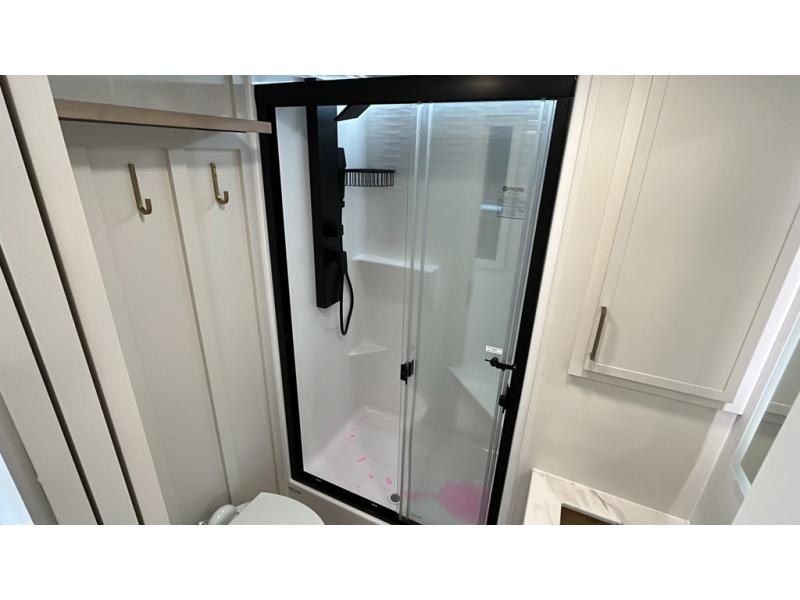 This travel trailer can comfortably sleep four with the king bed in the private bedroom and the tri-fold sofa in the main living area! The full bath features a spacious 42" x 30" shower with a built-in seat and Maxxair fan to name a few comforts. The front private bedroom features a 66" x 80" king bed with a MaxSpace Split-Level Wardrobe underneath to store shoes, clothes, and more! A slide out in the combined living area and rear kitchen makes your space more open, and you'll enjoy relaxing on the theater seating here in the evenings. The full kitchen includes a three burner stovetop, residential 30" convection microwave, 12 cu. ft. 12V refrigerator, plus a trash bin and Stow N' Go paper towel holder for added convenience. You can choose to eat outdoors under the 19' electric awning with LED lights or stay inside to dine at the pull-out dining table with a drawer for added storage!
