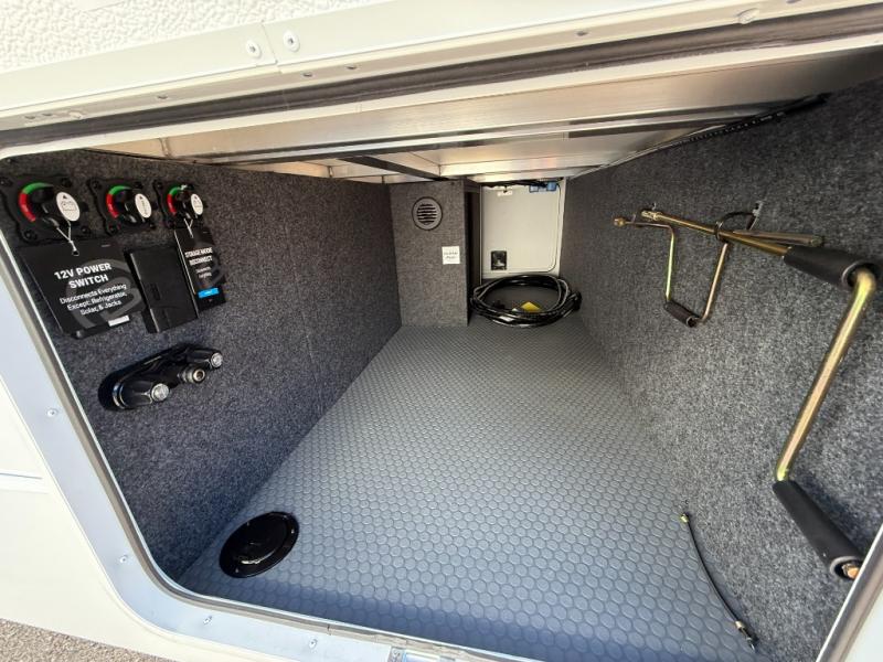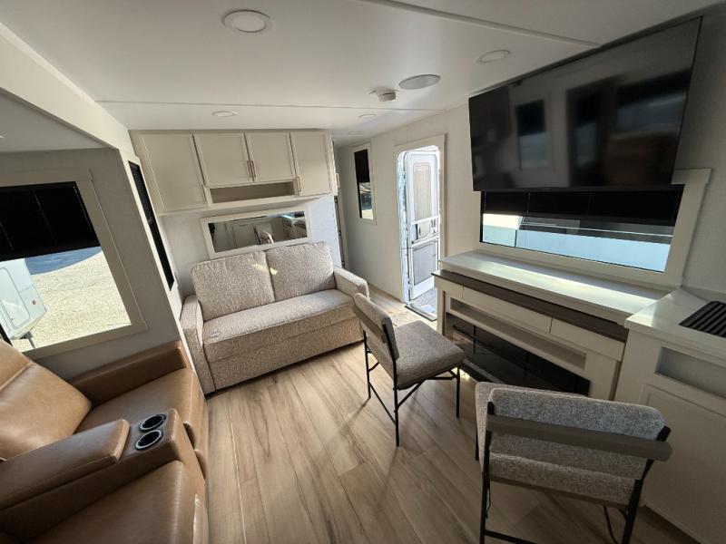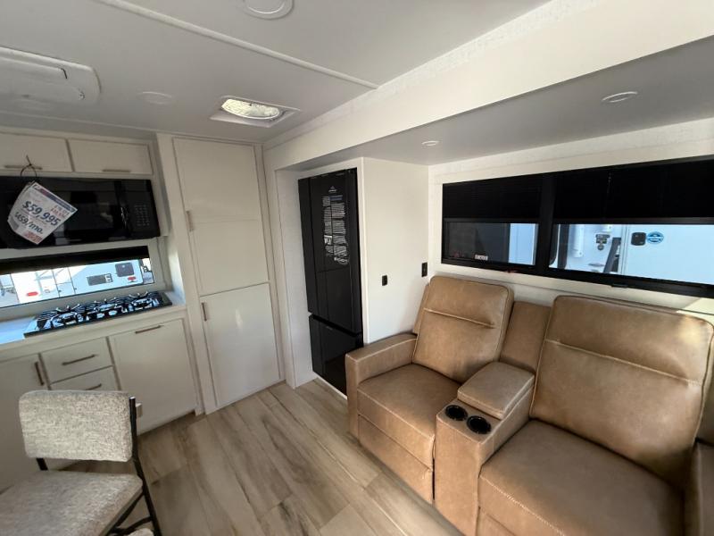 This travel trailer can comfortably sleep four with the king bed in the private bedroom and the tri-fold sofa in the main living area! The full bath features a spacious 42" x 30" shower with a built-in seat and Maxxair fan to name a few comforts. The front private bedroom features a 66" x 80" king bed with a MaxSpace Split-Level Wardrobe underneath to store shoes, clothes, and more! A slide out in the combined living area and rear kitchen makes your space more open, and you'll enjoy relaxing on the theater seating here in the evenings. The full kitchen includes a three burner stovetop, residential 30" convection microwave, 12 cu. ft. 12V refrigerator, plus a trash bin and Stow N' Go paper towel holder for added convenience. You can choose to eat outdoors under the 19' electric awning with LED lights or stay inside to dine at the pull-out dining table with a drawer for added storage!