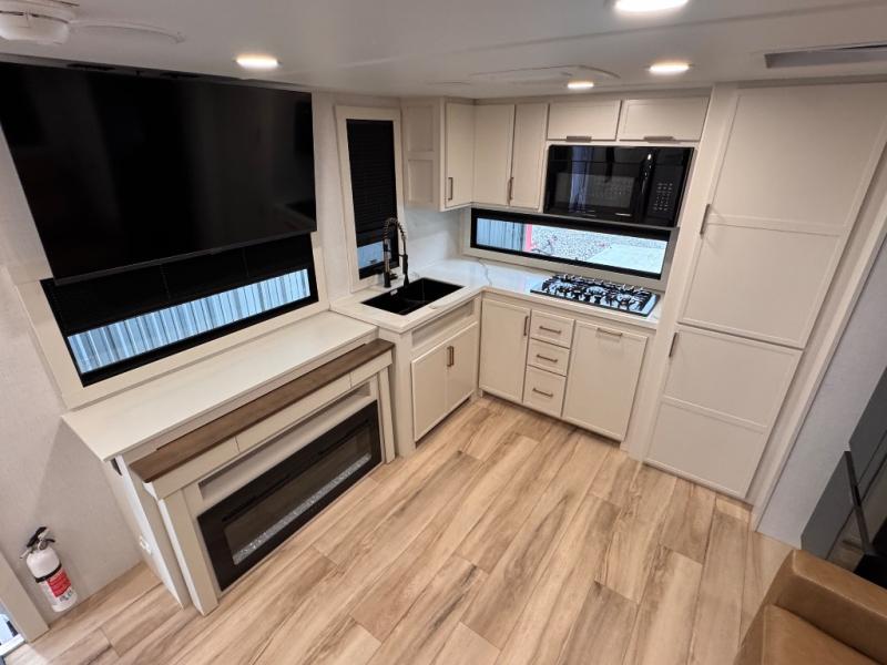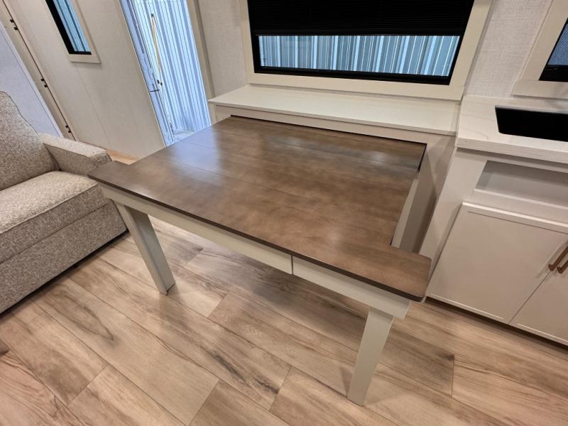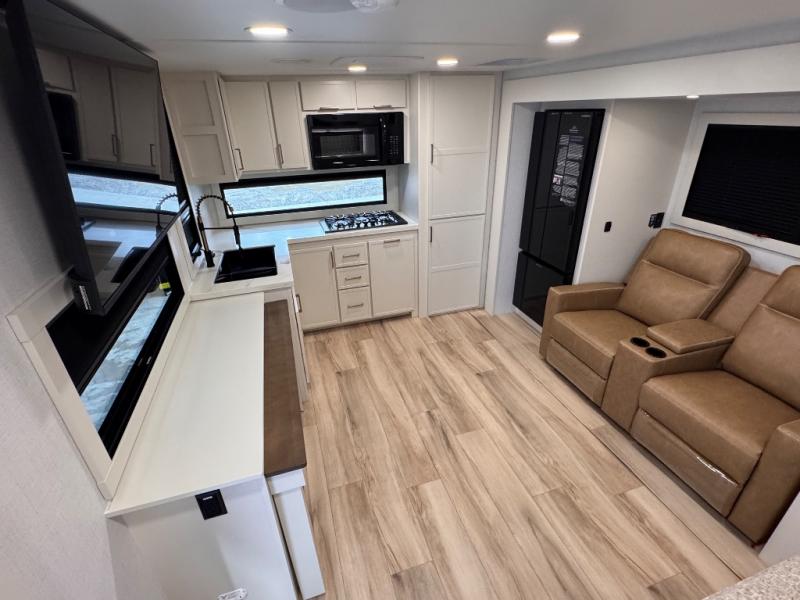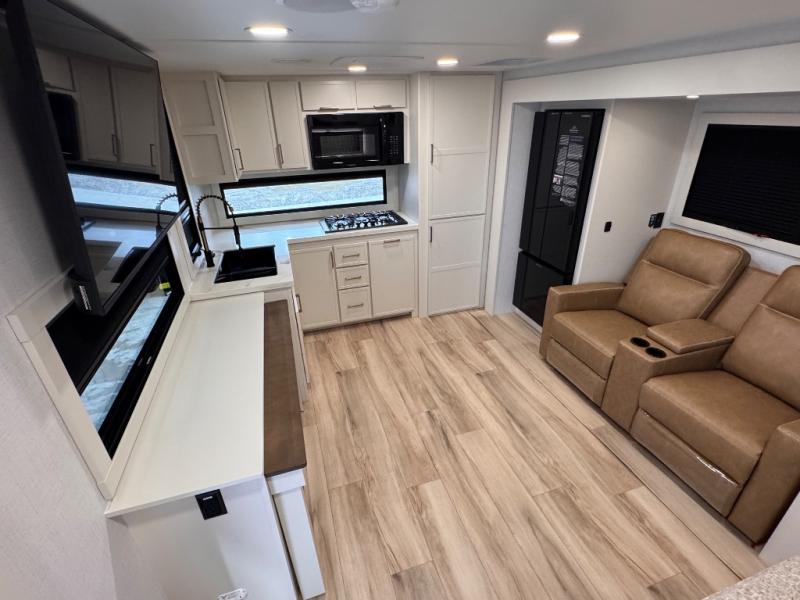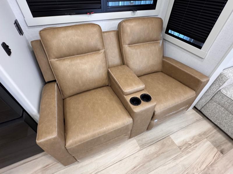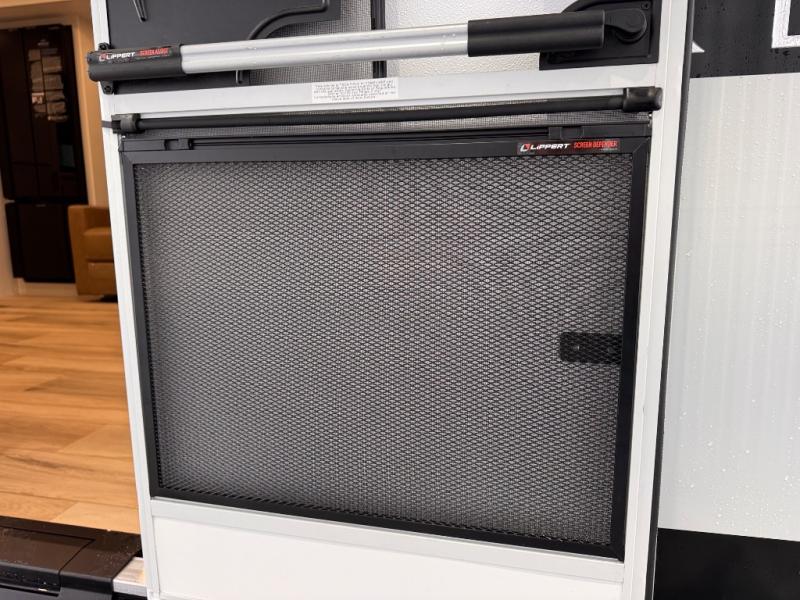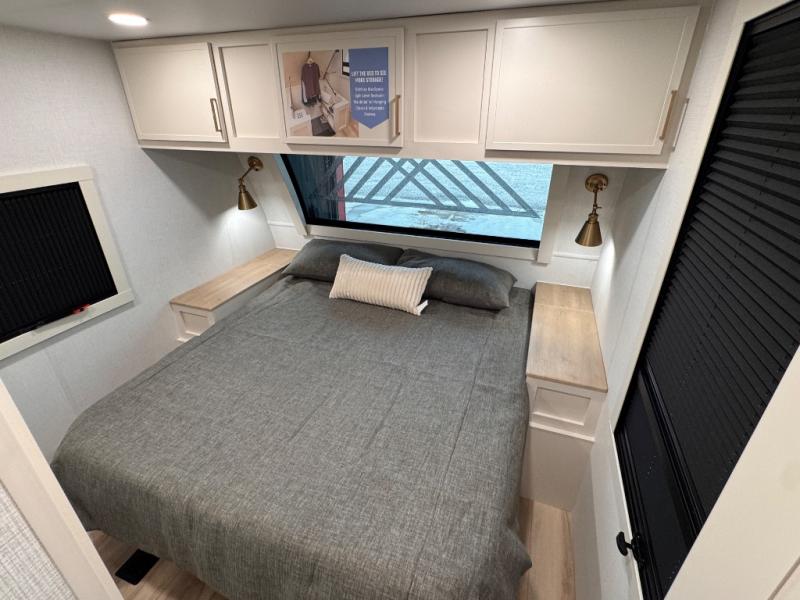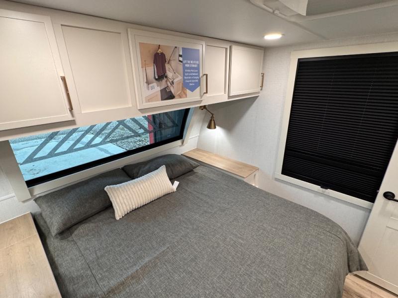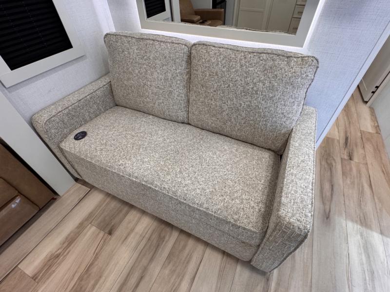 This travel trailer can comfortably sleep four with the king bed in the private bedroom and the tri-fold sofa in the main living area! The full bath features a spacious 42" x 30" shower with a built-in seat and Maxxair fan to name a few comforts. The front private bedroom features a 66" x 80" king bed with a MaxSpace Split-Level Wardrobe underneath to store shoes, clothes, and more! A slide out in the combined living area and rear kitchen makes your space more open, and you'll enjoy relaxing on the theater seating here in the evenings. The full kitchen includes a three burner stovetop, residential 30" convection microwave, 12 cu. ft. 12V refrigerator, plus a trash bin and Stow N' Go paper towel holder for added convenience. You can choose to eat outdoors under the 19' electric awning with LED lights or stay inside to dine at the pull-out dining table with a drawer for added storage!