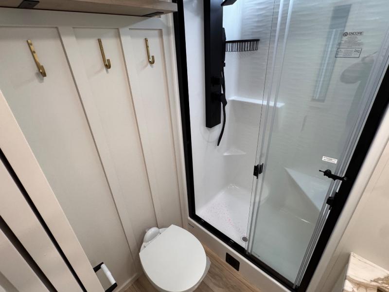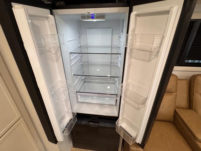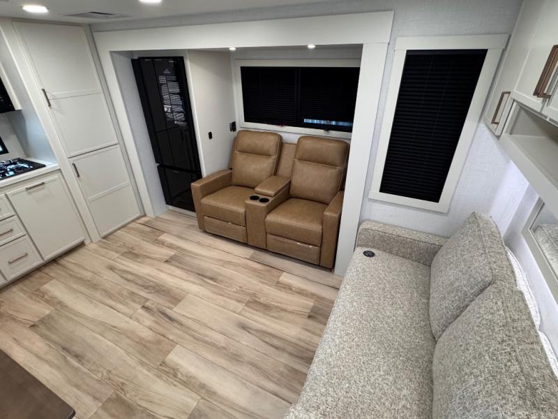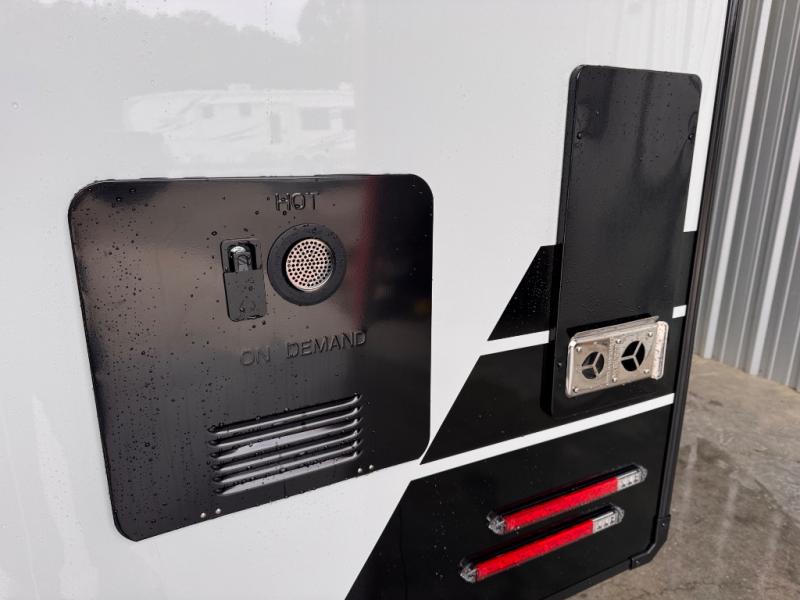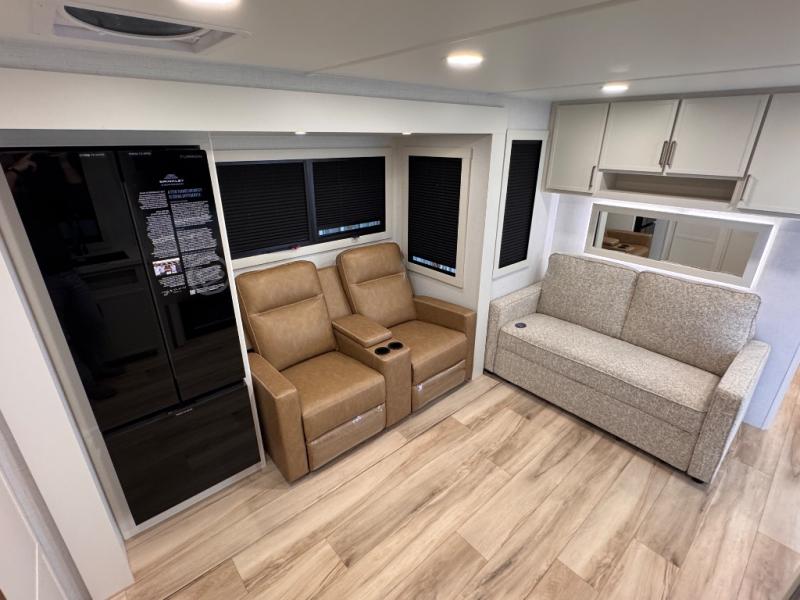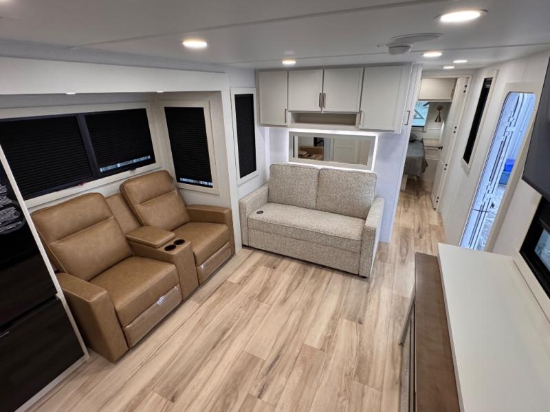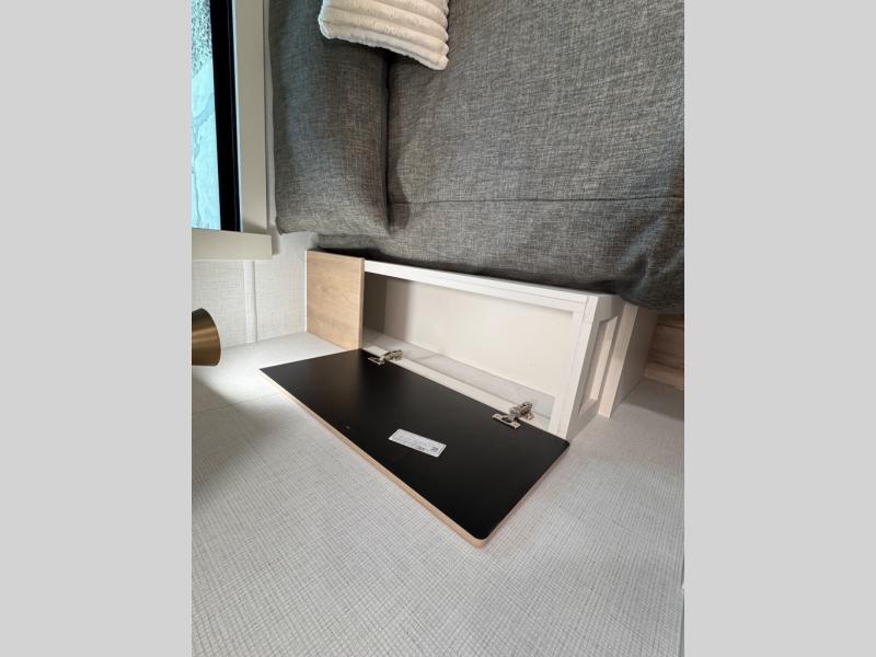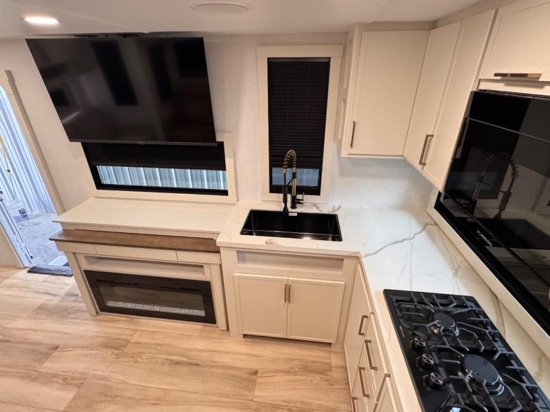 This travel trailer can comfortably sleep four with the king bed in the private bedroom and the tri-fold sofa in the main living area! The full bath features a spacious 42" x 30" shower with a built-in seat and Maxxair fan to name a few comforts. The front private bedroom features a 66" x 80" king bed with a MaxSpace Split-Level Wardrobe underneath to store shoes, clothes, and more! A slide out in the combined living area and rear kitchen makes your space more open, and you'll enjoy relaxing on the theater seating here in the evenings. The full kitchen includes a three burner stovetop, residential 30" convection microwave, 12 cu. ft. 12V refrigerator, plus a trash bin and Stow N' Go paper towel holder for added convenience. You can choose to eat outdoors under the 19' electric awning with LED lights or stay inside to dine at the pull-out dining table with a drawer for added storage!