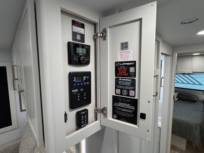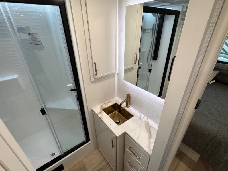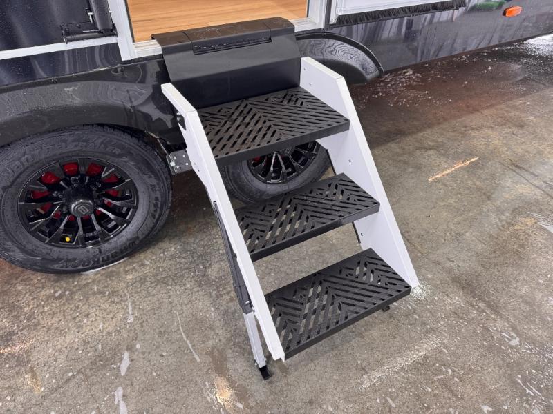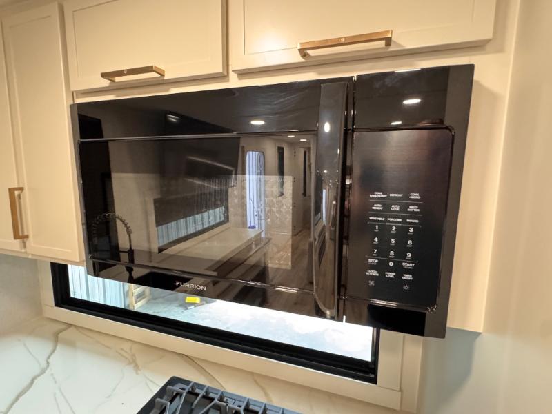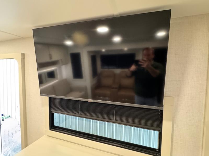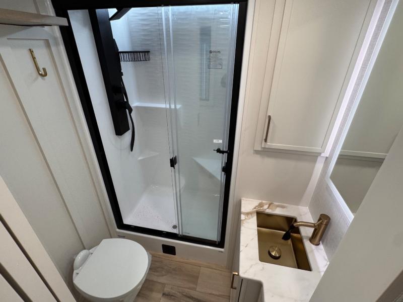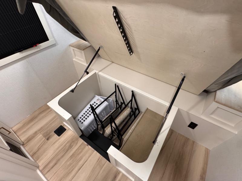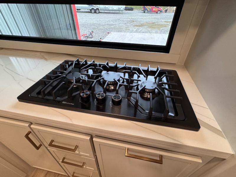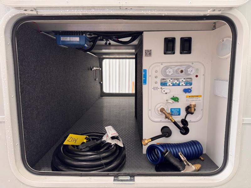 This travel trailer can comfortably sleep four with the king bed in the private bedroom and the tri-fold sofa in the main living area! The full bath features a spacious 42" x 30" shower with a built-in seat and Maxxair fan to name a few comforts. The front private bedroom features a 66" x 80" king bed with a MaxSpace Split-Level Wardrobe underneath to store shoes, clothes, and more! A slide out in the combined living area and rear kitchen makes your space more open, and you'll enjoy relaxing on the theater seating here in the evenings. The full kitchen includes a three burner stovetop, residential 30" convection microwave, 12 cu. ft. 12V refrigerator, plus a trash bin and Stow N' Go paper towel holder for added convenience. You can choose to eat outdoors under the 19' electric awning with LED lights or stay inside to dine at the pull-out dining table with a drawer for added storage!