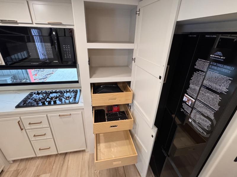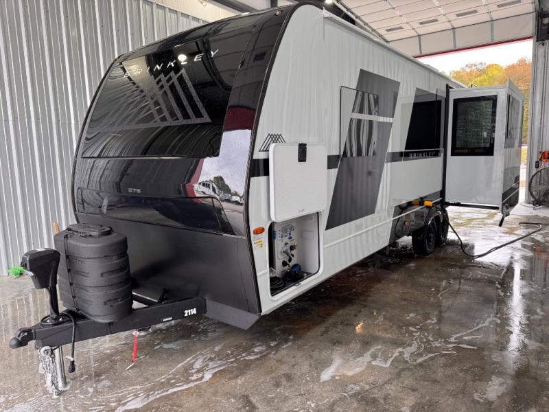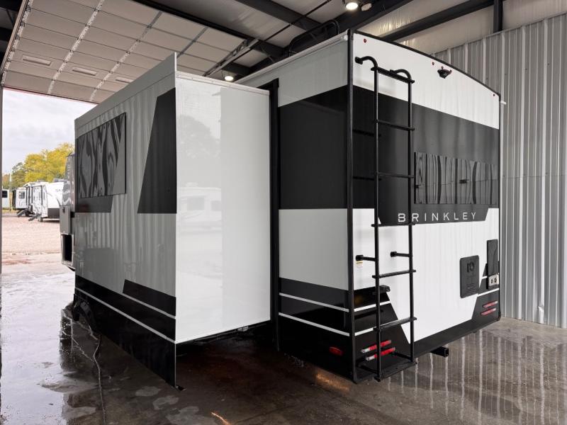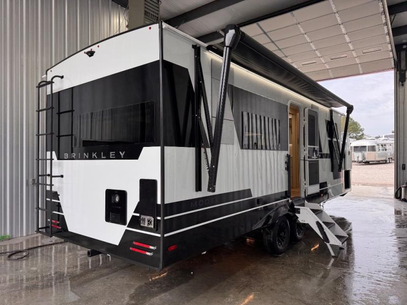 The lightweight Model I travel trailer by Brinkley is the perfect choice for those looking for an easy tow and at-home comforts! There is a drop-frame chassis, high-performance Road Armor suspension equalizer system, and Demco EZ Latch trailer coupler that automatically latches when dropped onto a hitch ball without the need of a safety pin. Additional exterior features include square Euro frameless windows, automotive-grade paint, full-width LED strip lighting in the pass-thru, and a pet & property security campside tie-down to keep your gear and furry friends safe. Inside, you'll be wowed by Brinkley's CraftSense wood trim construction, residential solid surface kitchen countertops, dimmable bedroom lights, and marine-grade neon LED shower lighting to name a few stand-out features!