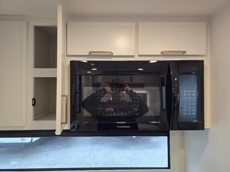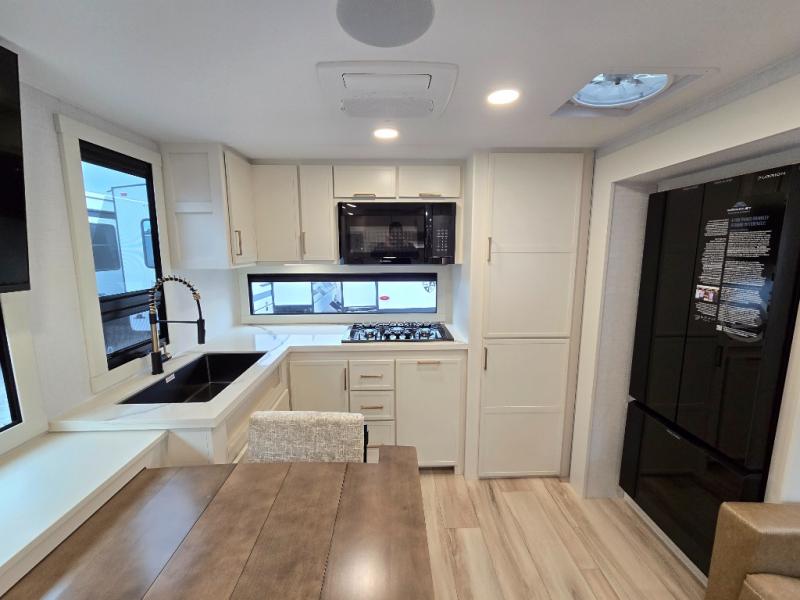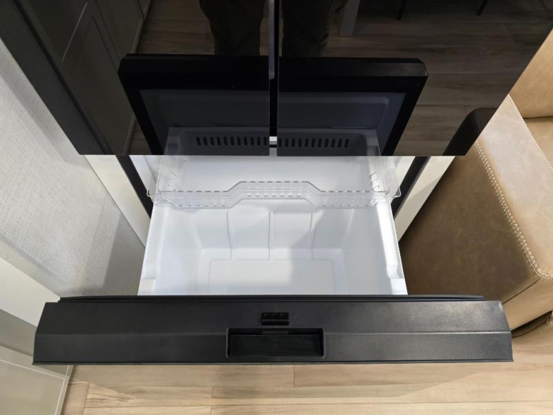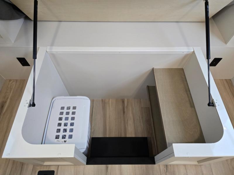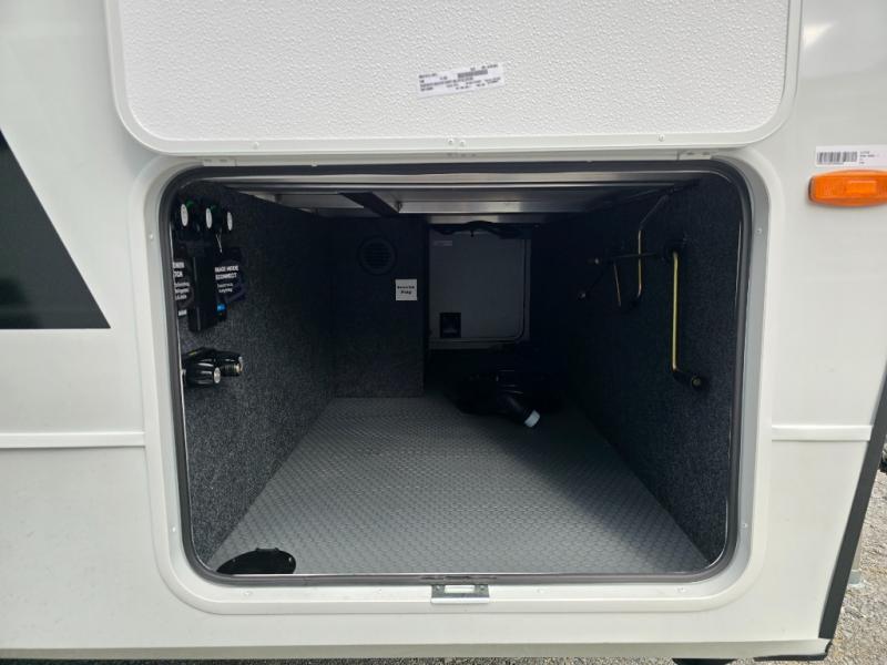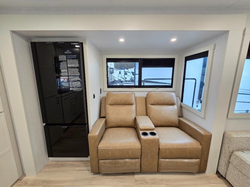 This travel trailer can comfortably sleep four with the king bed in the private bedroom and the tri-fold sofa in the main living area! The full bath features a spacious 42" x 30" shower with a built-in seat and Maxxair fan to name a few comforts. The front private bedroom features a 66" x 80" king bed with a MaxSpace Split-Level Wardrobe underneath to store shoes, clothes, and more! A slide out in the combined living area and rear kitchen makes your space more open, and you'll enjoy relaxing on the theater seating here in the evenings. The full kitchen includes a three burner stovetop, residential 30" convection microwave, 12 cu. ft. 12V refrigerator, plus a trash bin and Stow N' Go paper towel holder for added convenience. You can choose to eat outdoors under the 19' electric awning with LED lights or stay inside to dine at the pull-out dining table with a drawer for added storage!