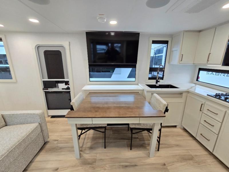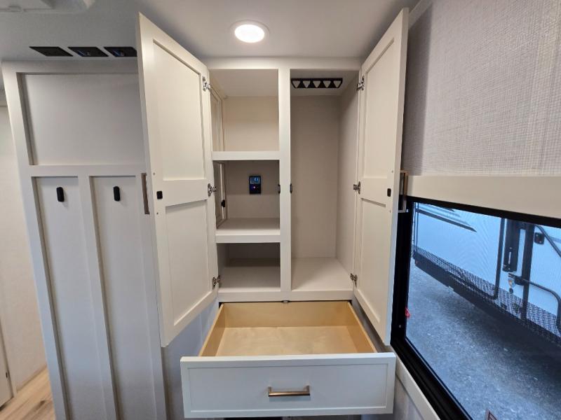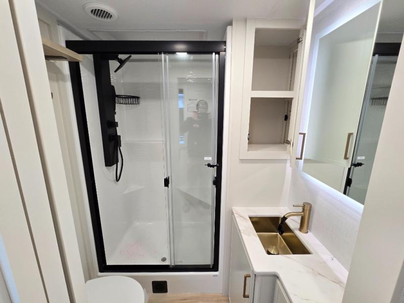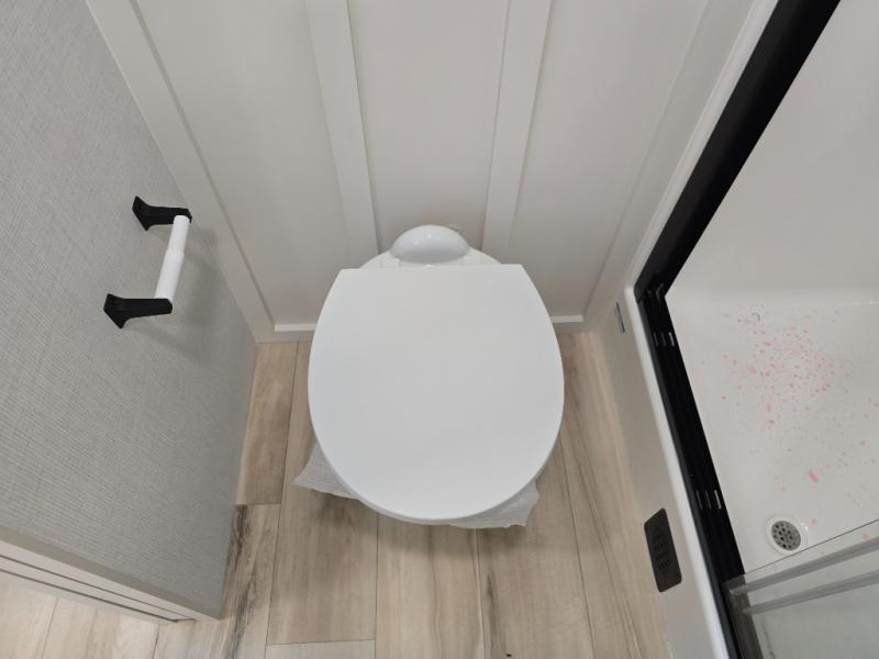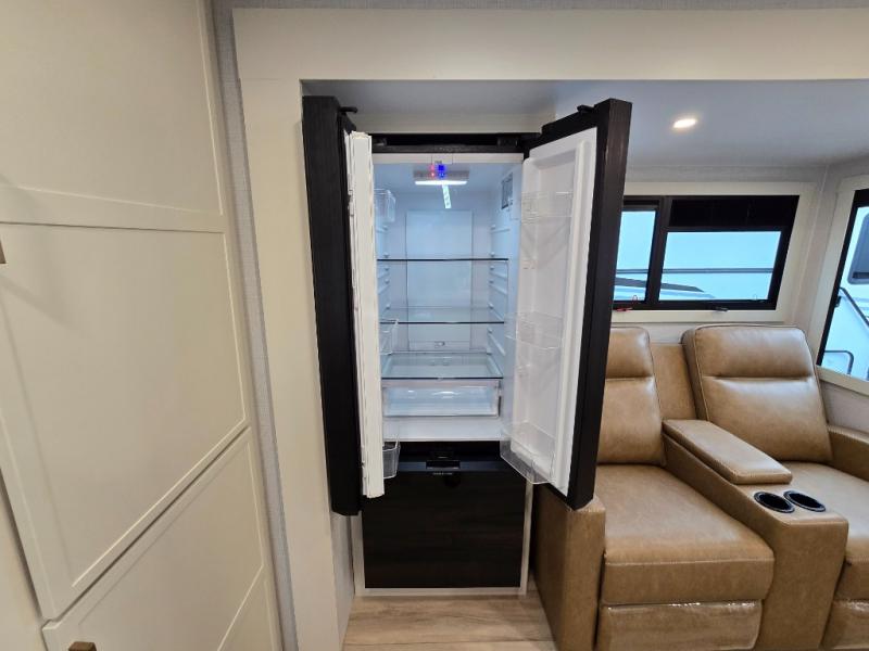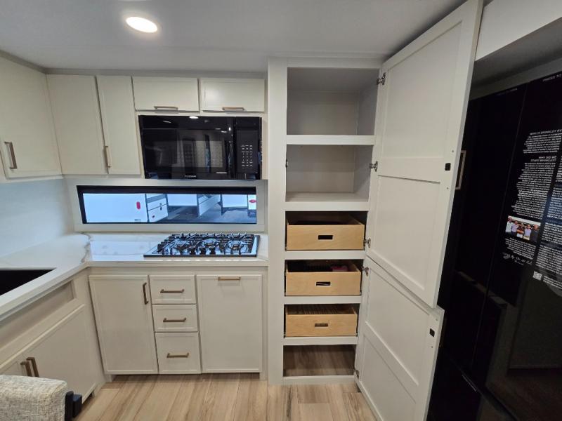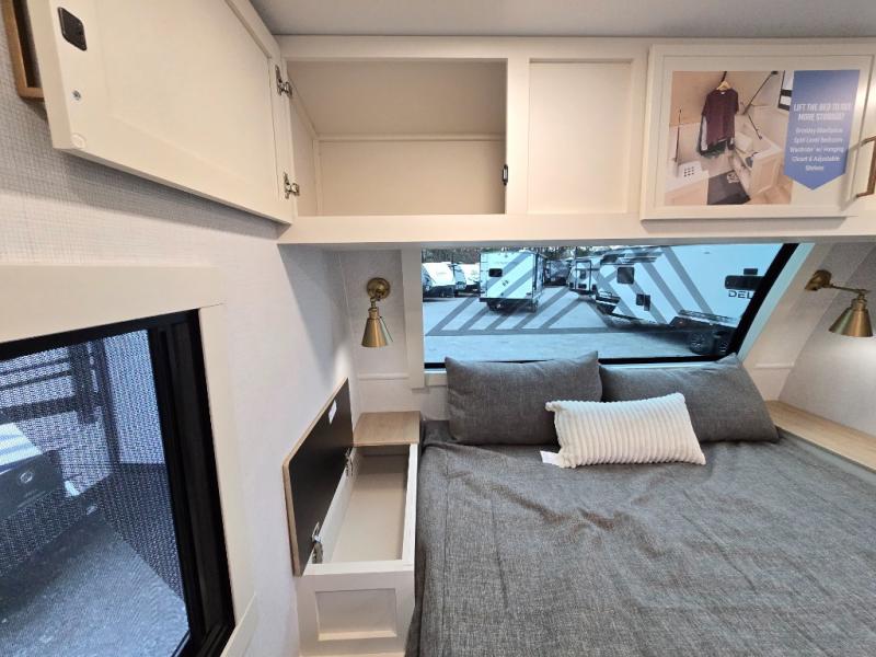 This travel trailer can comfortably sleep four with the king bed in the private bedroom and the tri-fold sofa in the main living area! The full bath features a spacious 42" x 30" shower with a built-in seat and Maxxair fan to name a few comforts. The front private bedroom features a 66" x 80" king bed with a MaxSpace Split-Level Wardrobe underneath to store shoes, clothes, and more! A slide out in the combined living area and rear kitchen makes your space more open, and you'll enjoy relaxing on the theater seating here in the evenings. The full kitchen includes a three burner stovetop, residential 30" convection microwave, 12 cu. ft. 12V refrigerator, plus a trash bin and Stow N' Go paper towel holder for added convenience. You can choose to eat outdoors under the 19' electric awning with LED lights or stay inside to dine at the pull-out dining table with a drawer for added storage!