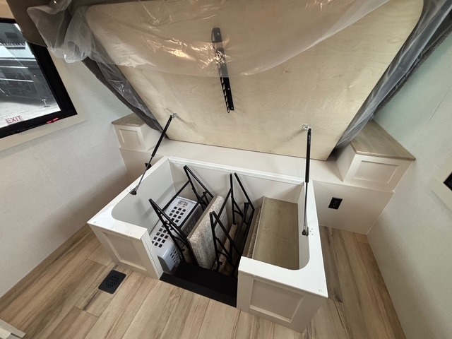 This travel trailer can comfortably sleep four with the king bed in the private bedroom and the tri-fold sofa in the main living area! The full bath features a spacious 42" x 30" shower with a built-in seat and Maxxair fan to name a few comforts. The front private bedroom features a 66" x 80" king bed with a MaxSpace Split-Level Wardrobe underneath to store shoes, clothes, and more! A slide out in the combined living area and rear kitchen makes your space more open, and you'll enjoy relaxing on the theater seating here in the evenings. The full kitchen includes a three burner stovetop, residential 30" convection microwave, 12 cu. ft. 12V refrigerator, plus a trash bin and Stow N' Go paper towel holder for added convenience. You can choose to eat outdoors under the 19' electric awning with LED lights or stay inside to dine at the pull-out dining table with a drawer for added storage!