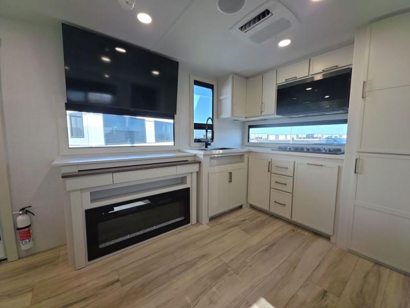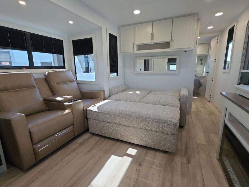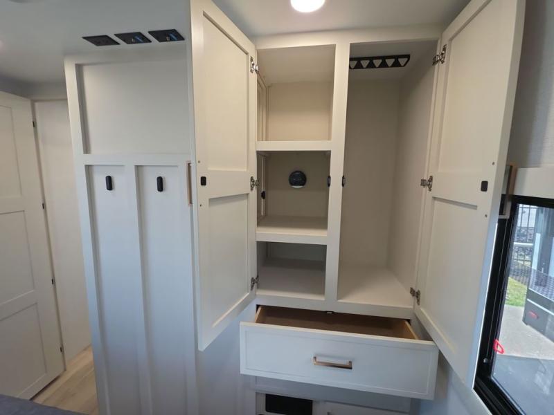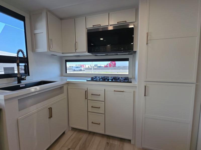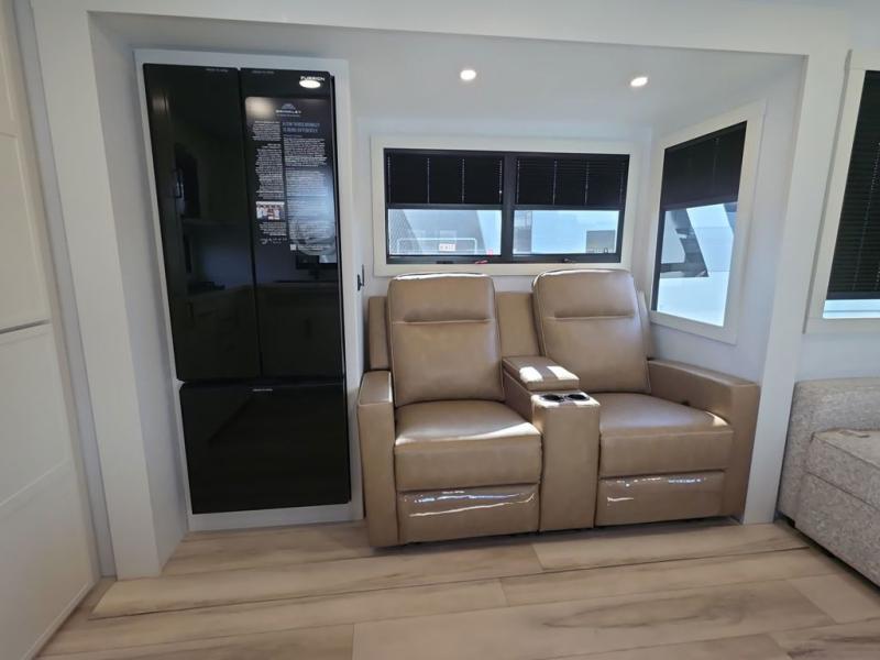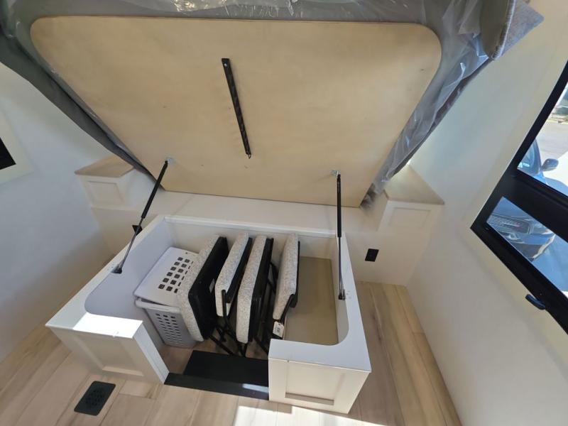 This travel trailer can comfortably sleep four with the king bed in the private bedroom and the tri-fold sofa in the main living area! The full bath features a spacious 42" x 30" shower with a built-in seat and Maxxair fan to name a few comforts. The front private bedroom features a 66" x 80" king bed with a MaxSpace Split-Level Wardrobe underneath to store shoes, clothes, and more! A slide out in the combined living area and rear kitchen makes your space more open, and you'll enjoy relaxing on the theater seating here in the evenings. The full kitchen includes a three burner stovetop, residential 30" convection microwave, 12 cu. ft. 12V refrigerator, plus a trash bin and Stow N' Go paper towel holder for added convenience. You can choose to eat outdoors under the 19' electric awning with LED lights or stay inside to dine at the pull-out dining table with a drawer for added storage!