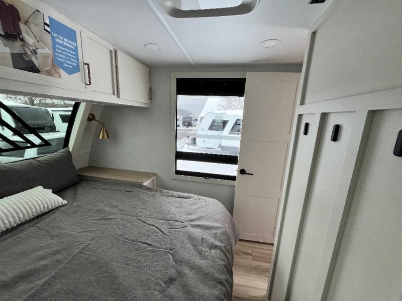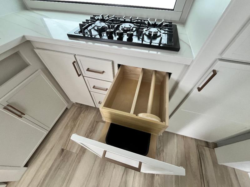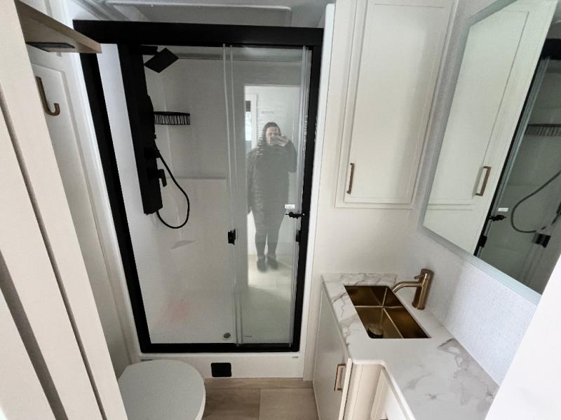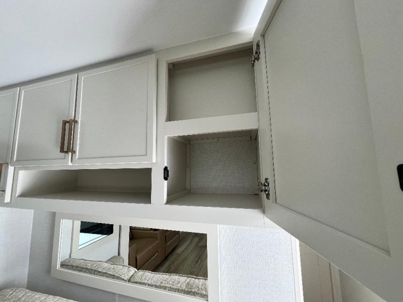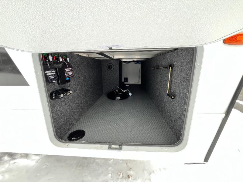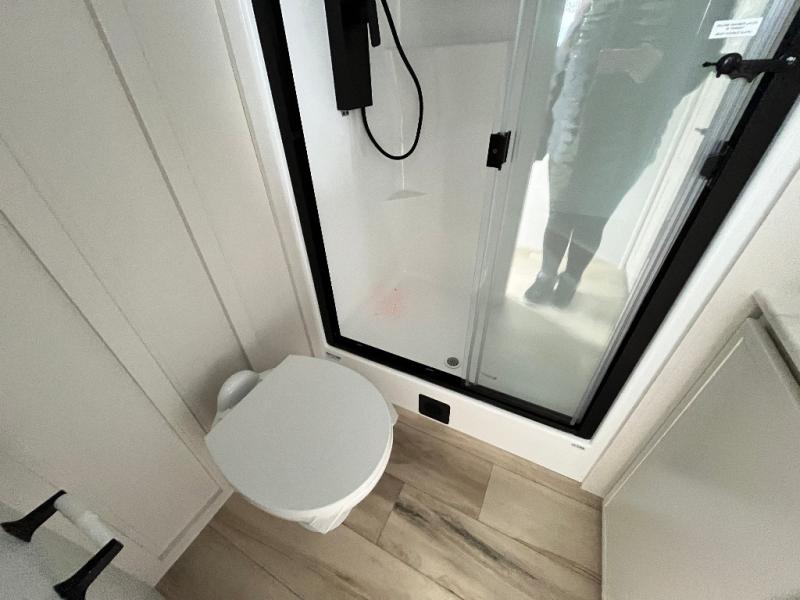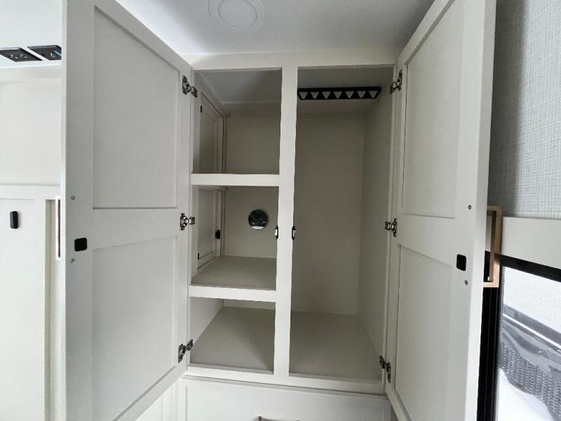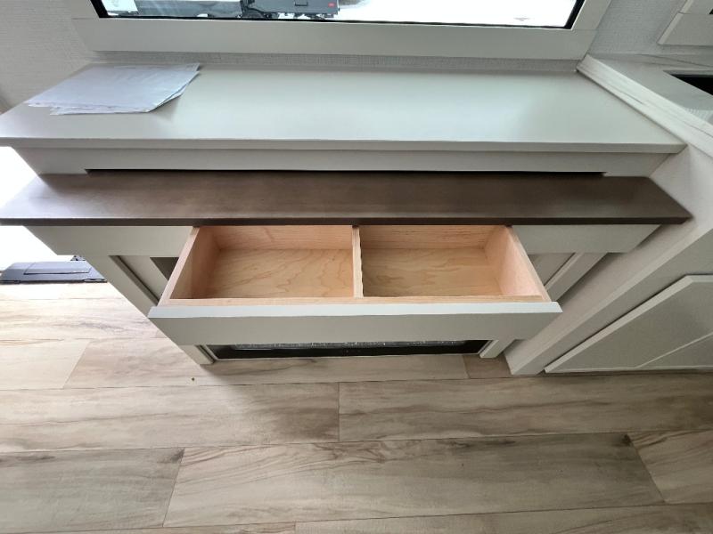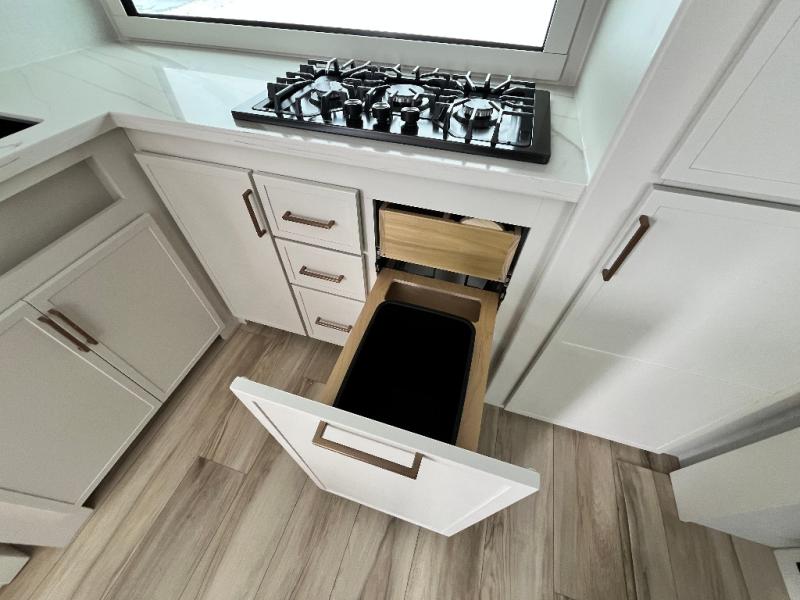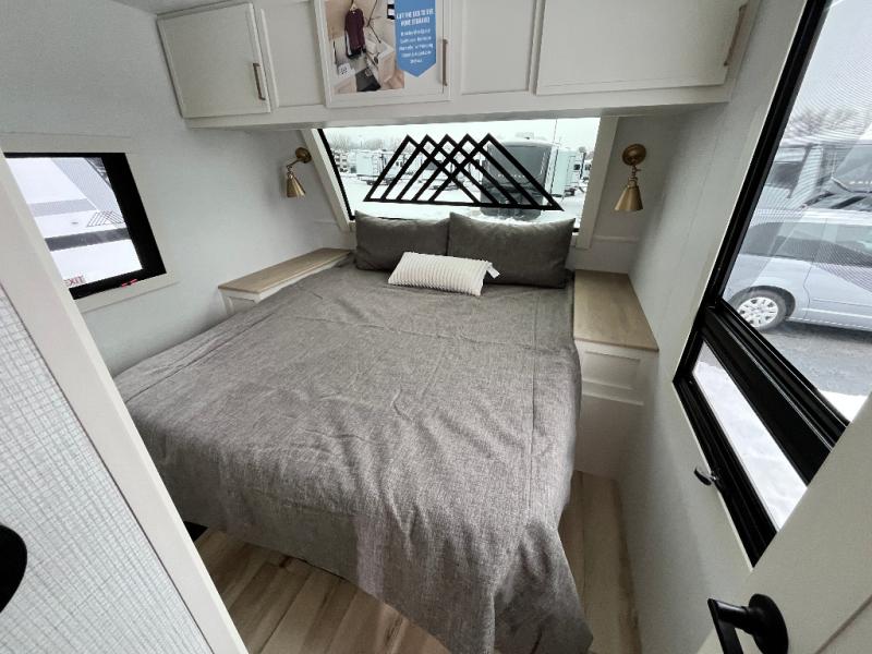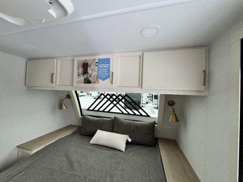 This travel trailer can comfortably sleep four with the king bed in the private bedroom and the tri-fold sofa in the main living area! The full bath features a spacious 42" x 30" shower with a built-in seat and Maxxair fan to name a few comforts. The front private bedroom features a 66" x 80" king bed with a MaxSpace Split-Level Wardrobe underneath to store shoes, clothes, and more! A slide out in the combined living area and rear kitchen makes your space more open, and you'll enjoy relaxing on the theater seating here in the evenings. The full kitchen includes a three burner stovetop, residential 30" convection microwave, 12 cu. ft. 12V refrigerator, plus a trash bin and Stow N' Go paper towel holder for added convenience. You can choose to eat outdoors under the 18' electric awning with LED lights or stay inside to dine at the pull-out dining table with a drawer for added storage!