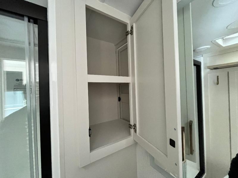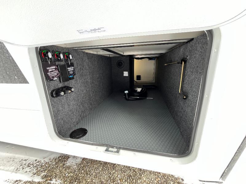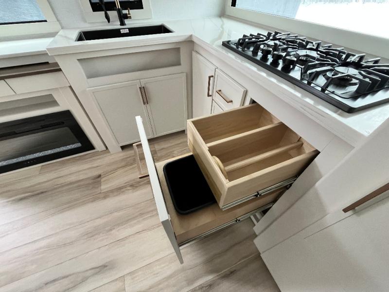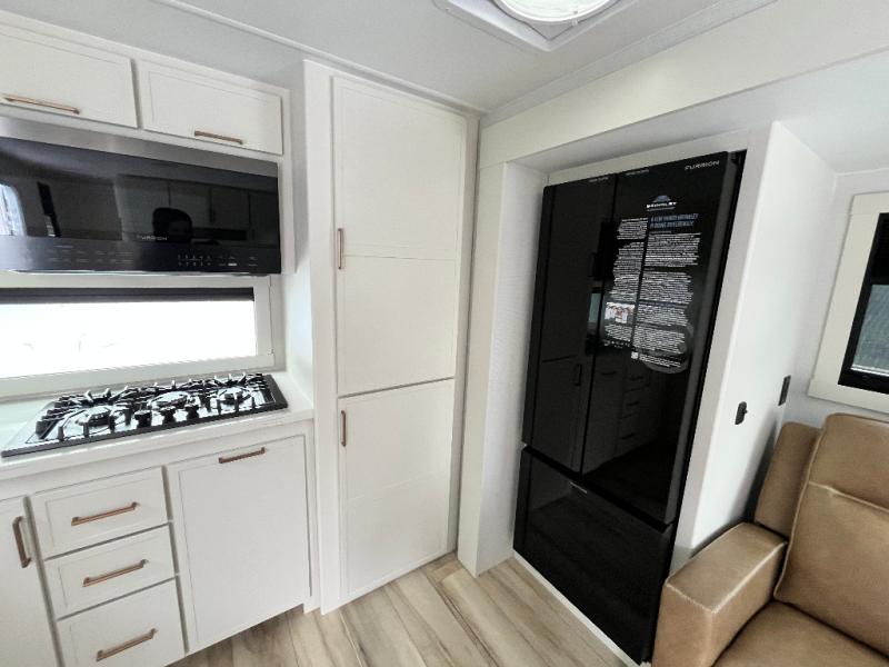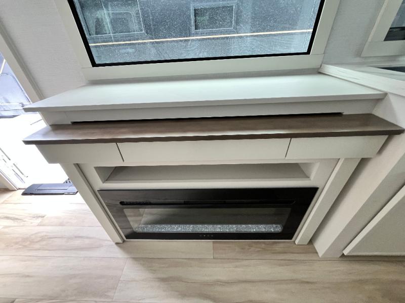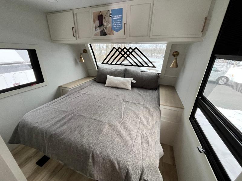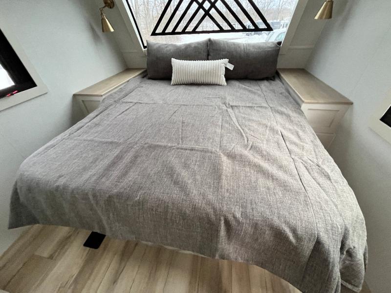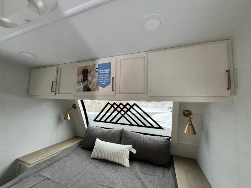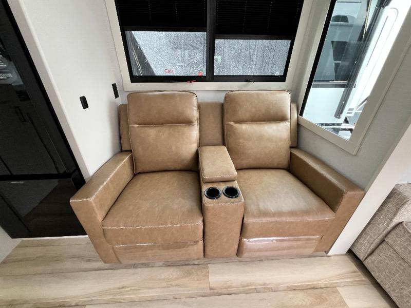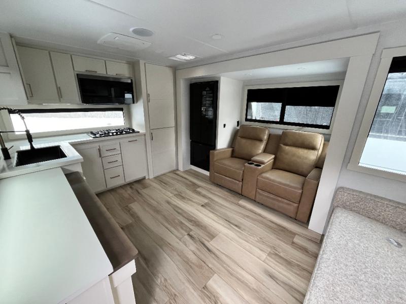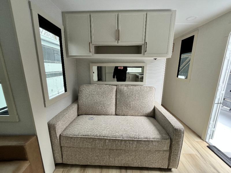 This travel trailer can comfortably sleep four with the king bed in the private bedroom and the tri-fold sofa in the main living area! The full bath features a spacious 42" x 30" shower with a built-in seat and Maxxair fan to name a few comforts. The front private bedroom features a 66" x 80" king bed with a MaxSpace Split-Level Wardrobe underneath to store shoes, clothes, and more! A slide out in the combined living area and rear kitchen makes your space more open, and you'll enjoy relaxing on the theater seating here in the evenings. The full kitchen includes a three burner stovetop, residential 30" convection microwave, 12 cu. ft. 12V refrigerator, plus a trash bin and Stow N' Go paper towel holder for added convenience. You can choose to eat outdoors under the 18' electric awning with LED lights or stay inside to dine at the pull-out dining table with a drawer for added storage!