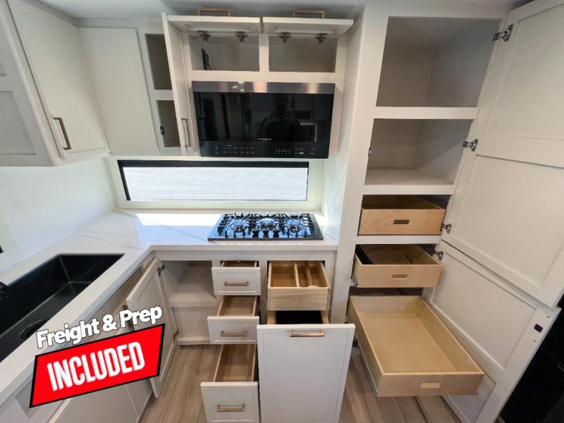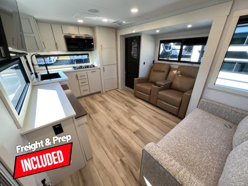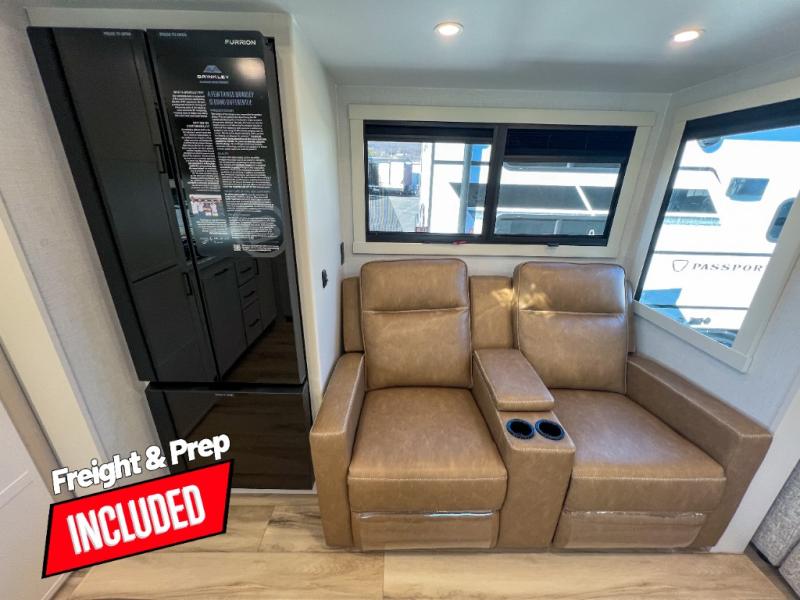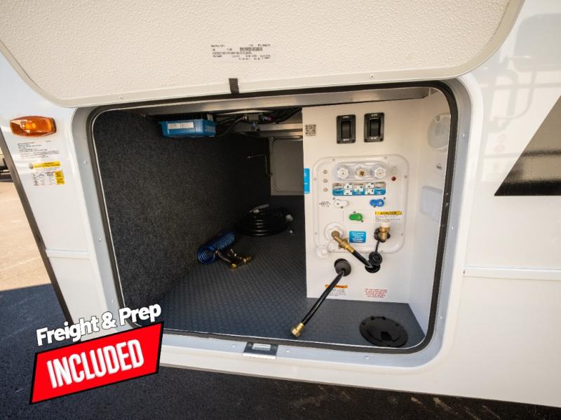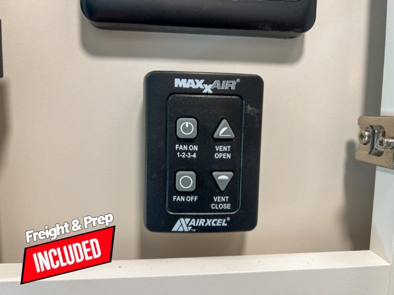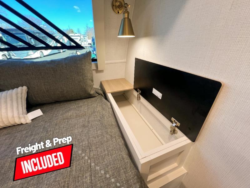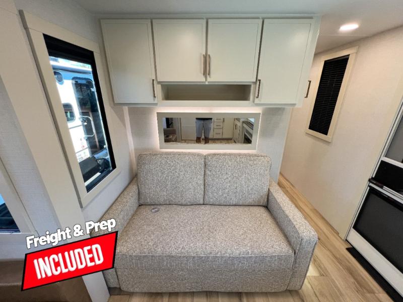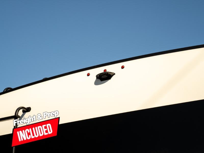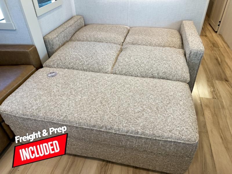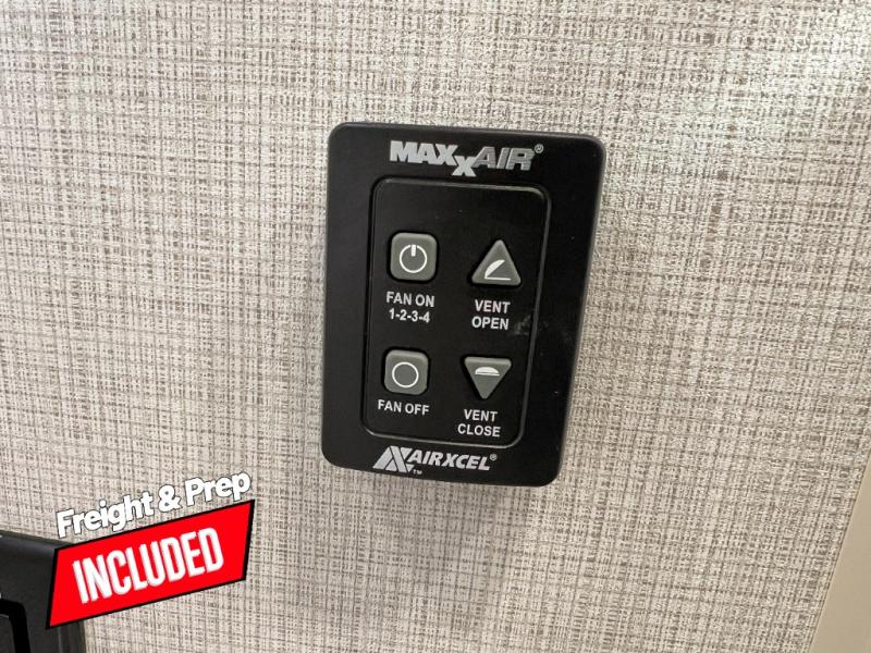 This travel trailer can comfortably sleep four with the king bed in the private bedroom and the tri-fold sofa in the main living area! The full bath features a spacious 42" x 30" shower with a built-in seat and Maxxair fan to name a few comforts. The front private bedroom features a 66" x 80" king bed with a MaxSpace Split-Level Wardrobe underneath to store shoes, clothes, and more! A slide out in the combined living area and rear kitchen makes your space more open, and you'll enjoy relaxing on the theater seating here in the evenings. The full kitchen includes a three burner stovetop, residential 30" convection microwave, 12 cu. ft. 12V refrigerator, plus a trash bin and Stow N' Go paper towel holder for added convenience. You can choose to eat outdoors under the 18' electric awning with LED lights or stay inside to dine at the pull-out dining table with a drawer for added storage!