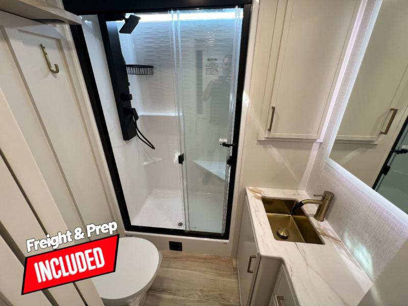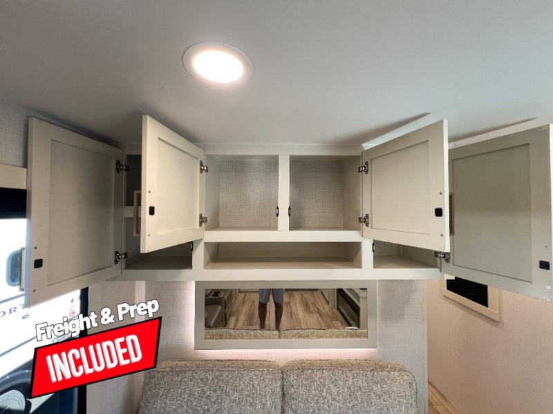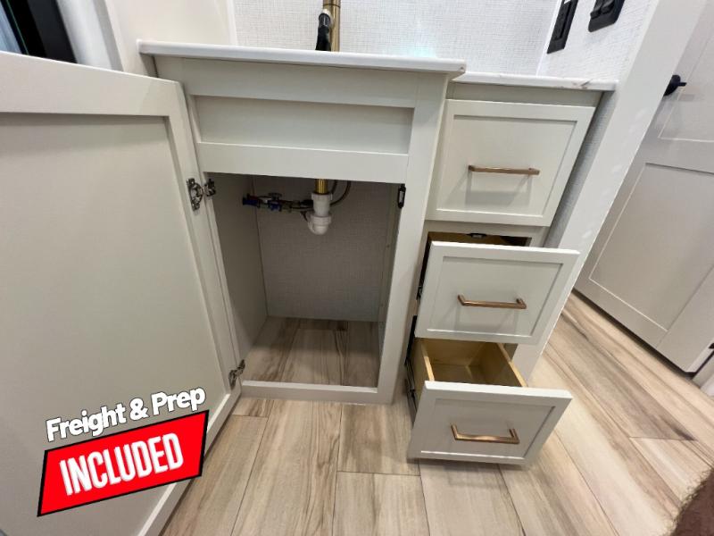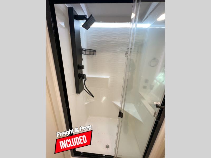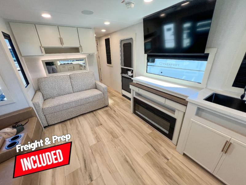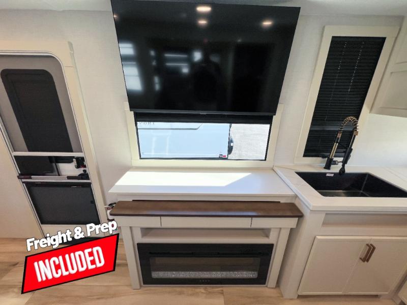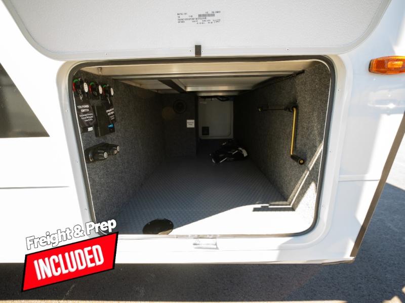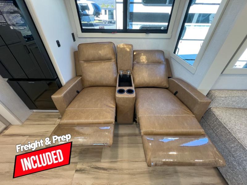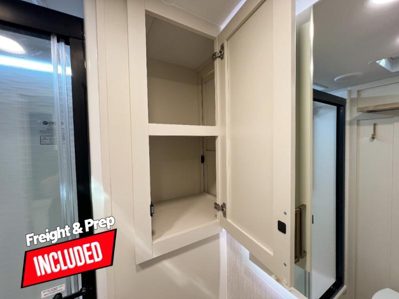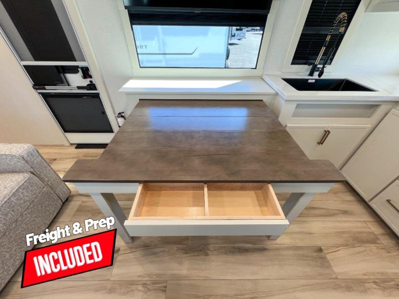 This travel trailer can comfortably sleep four with the king bed in the private bedroom and the tri-fold sofa in the main living area! The full bath features a spacious 42" x 30" shower with a built-in seat and Maxxair fan to name a few comforts. The front private bedroom features a 66" x 80" king bed with a MaxSpace Split-Level Wardrobe underneath to store shoes, clothes, and more! A slide out in the combined living area and rear kitchen makes your space more open, and you'll enjoy relaxing on the theater seating here in the evenings. The full kitchen includes a three burner stovetop, residential 30" convection microwave, 12 cu. ft. 12V refrigerator, plus a trash bin and Stow N' Go paper towel holder for added convenience. You can choose to eat outdoors under the 18' electric awning with LED lights or stay inside to dine at the pull-out dining table with a drawer for added storage!