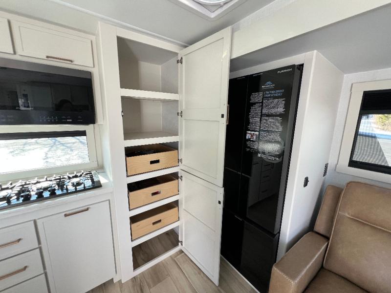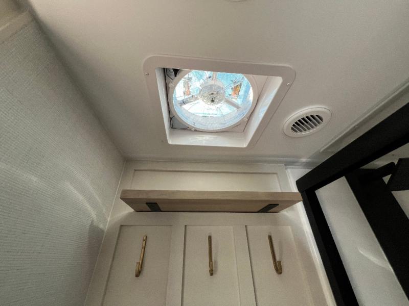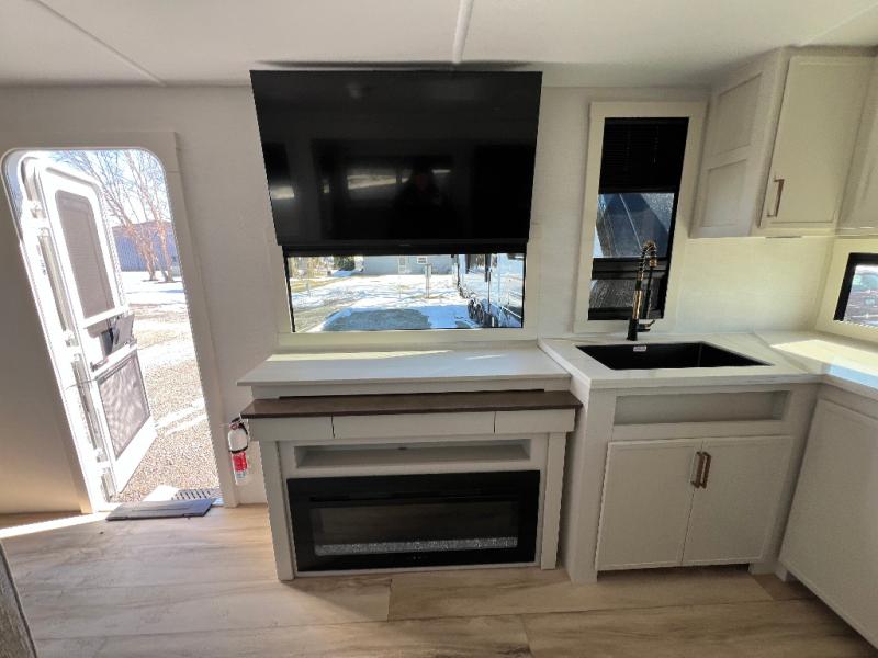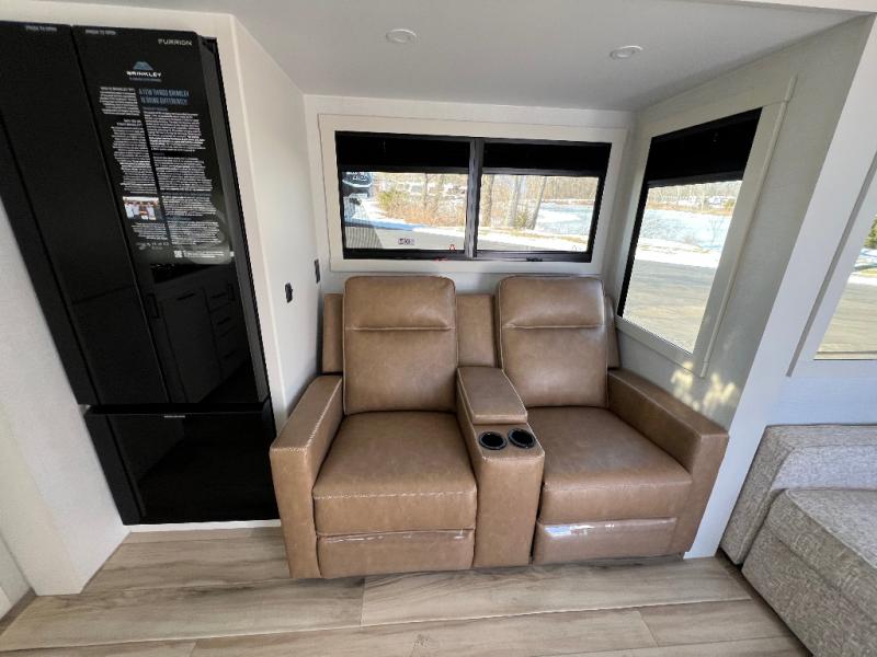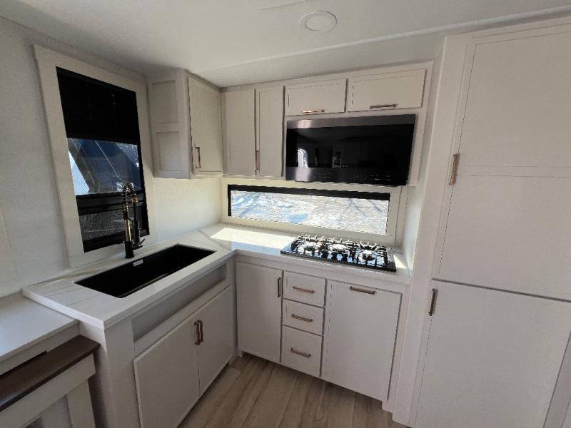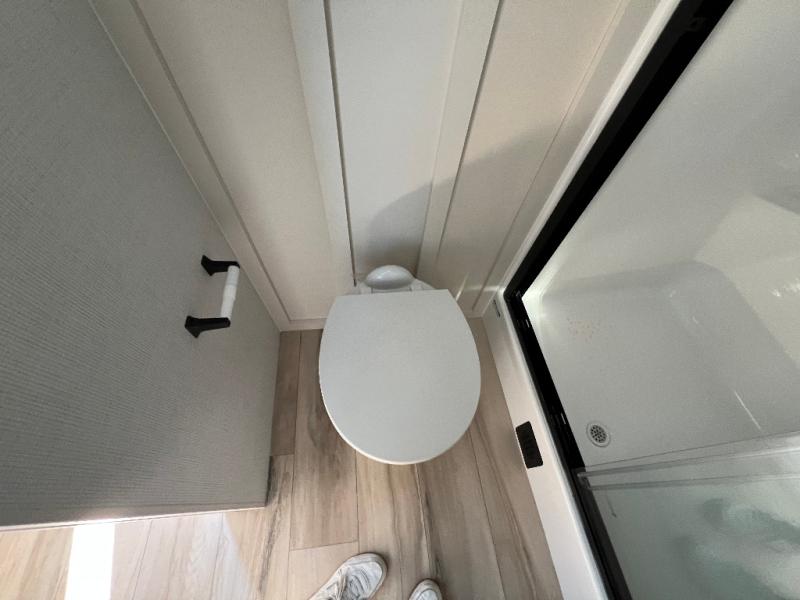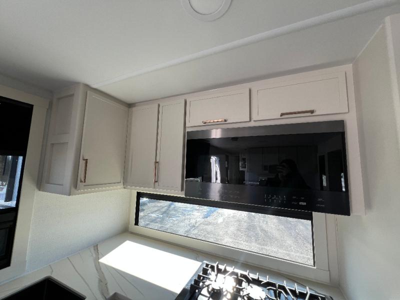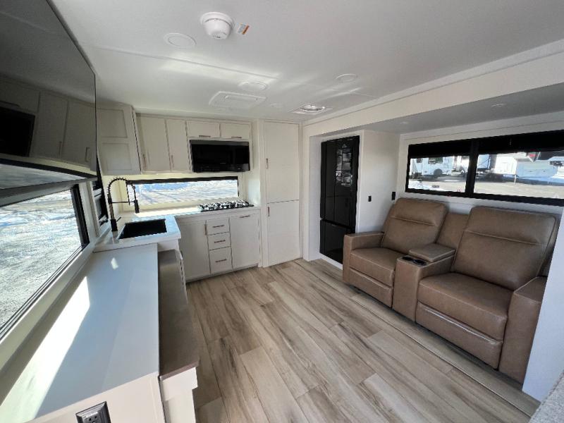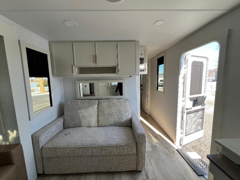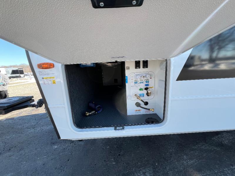 This travel trailer can comfortably sleep four with the king bed in the private bedroom and the tri-fold sofa in the main living area! The full bath features a spacious 42" x 30" shower with a built-in seat and Maxxair fan to name a few comforts. The front private bedroom features a 66" x 80" king bed with a MaxSpace Split-Level Wardrobe underneath to store shoes, clothes, and more! A slide out in the combined living area and rear kitchen makes your space more open, and you'll enjoy relaxing on the theater seating here in the evenings. The full kitchen includes a three burner stovetop, residential 30" convection microwave, 12 cu. ft. 12V refrigerator, plus a trash bin and Stow N' Go paper towel holder for added convenience. You can choose to eat outdoors under the 18' electric awning with LED lights or stay inside to dine at the pull-out dining table with a drawer for added storage!