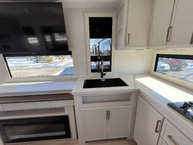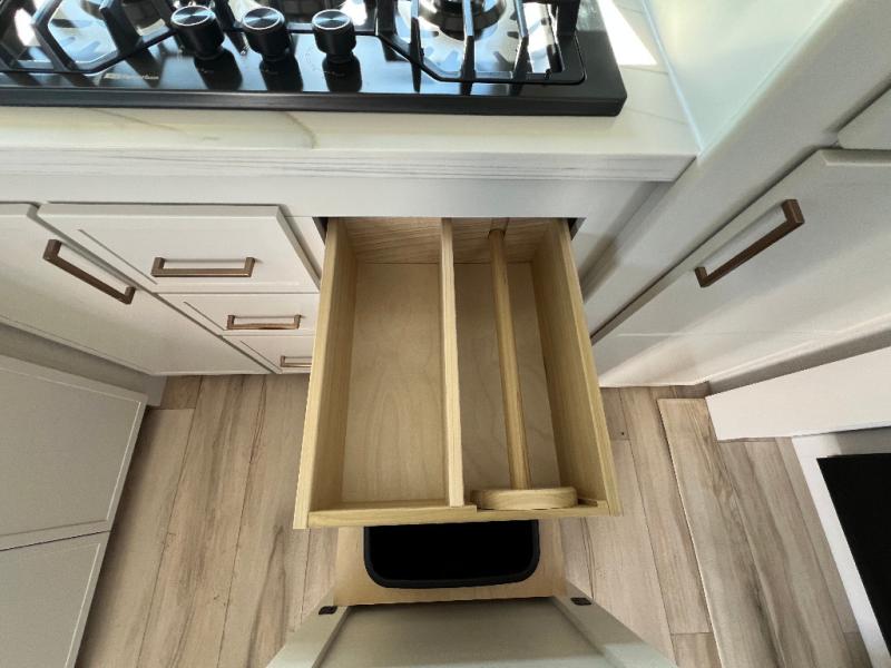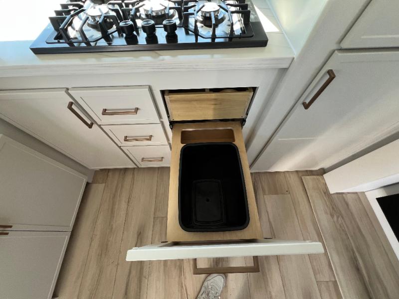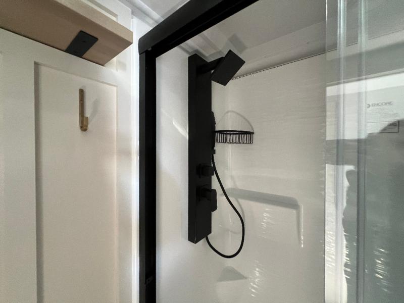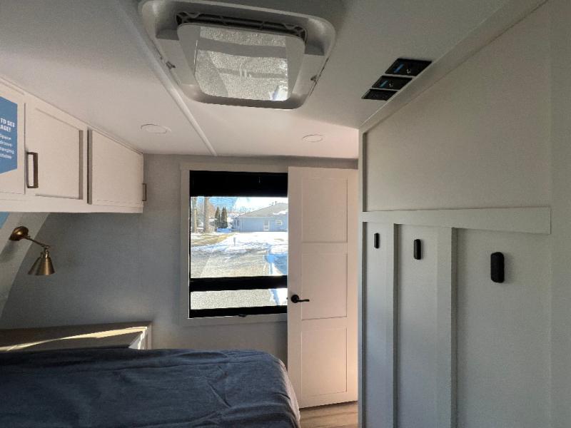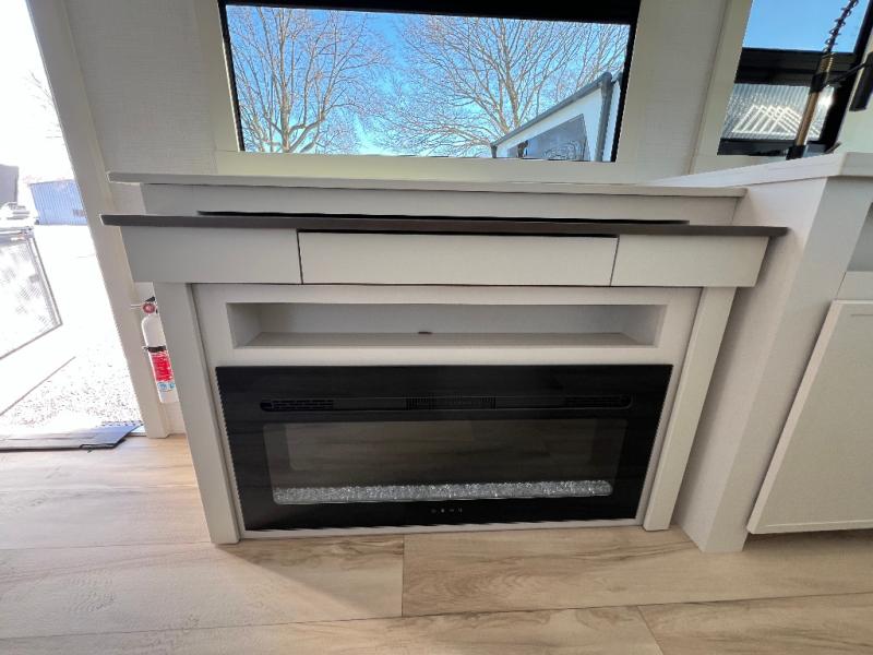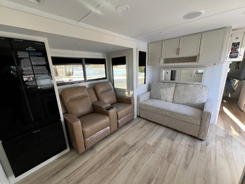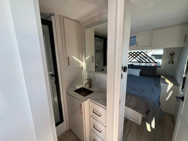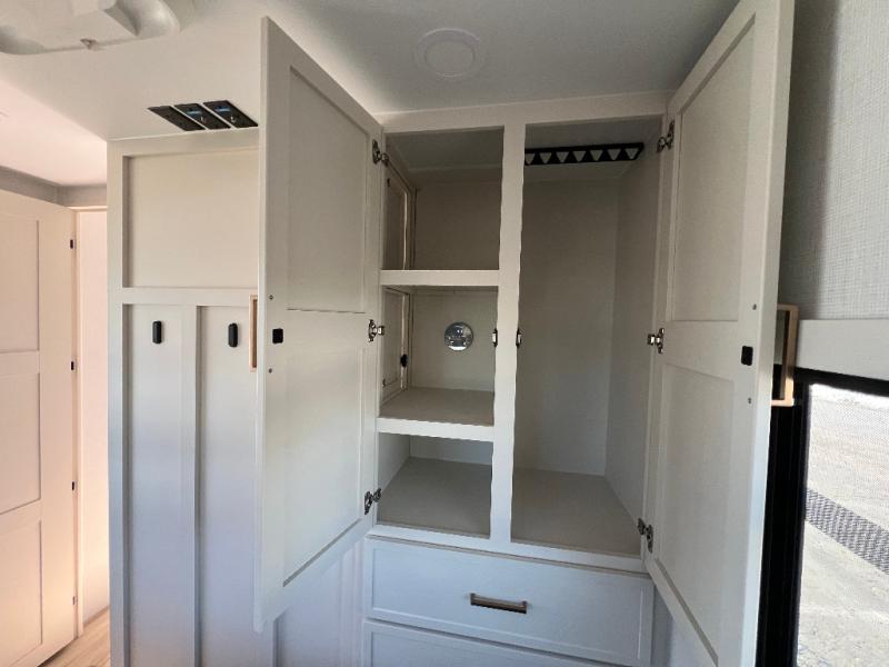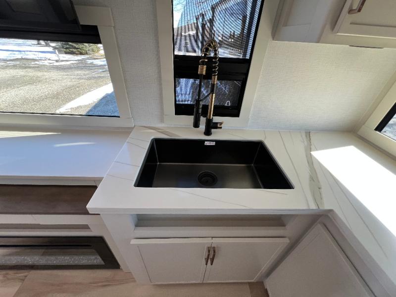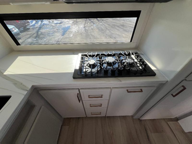 This travel trailer can comfortably sleep four with the king bed in the private bedroom and the tri-fold sofa in the main living area! The full bath features a spacious 42" x 30" shower with a built-in seat and Maxxair fan to name a few comforts. The front private bedroom features a 66" x 80" king bed with a MaxSpace Split-Level Wardrobe underneath to store shoes, clothes, and more! A slide out in the combined living area and rear kitchen makes your space more open, and you'll enjoy relaxing on the theater seating here in the evenings. The full kitchen includes a three burner stovetop, residential 30" convection microwave, 12 cu. ft. 12V refrigerator, plus a trash bin and Stow N' Go paper towel holder for added convenience. You can choose to eat outdoors under the 18' electric awning with LED lights or stay inside to dine at the pull-out dining table with a drawer for added storage!