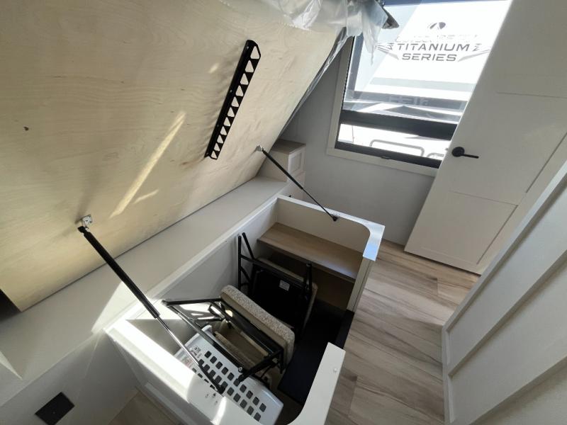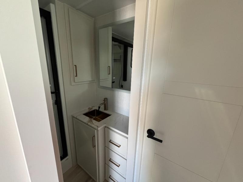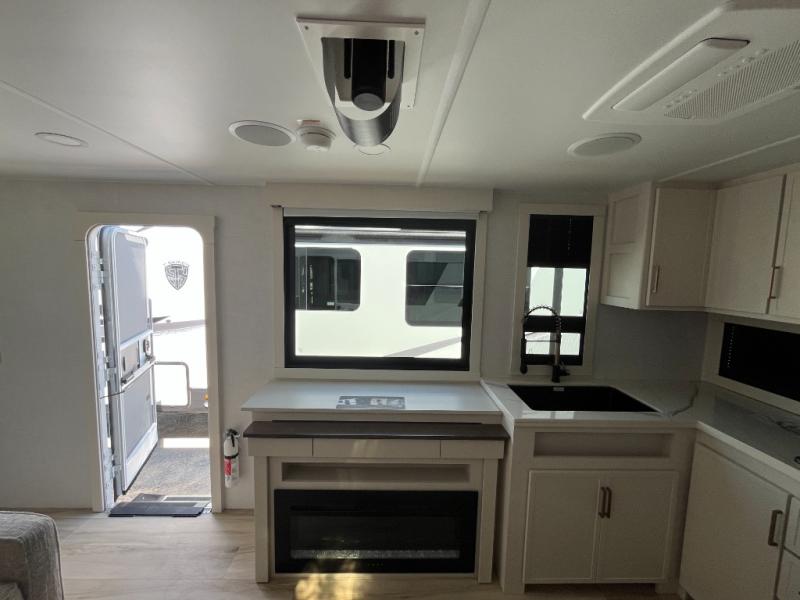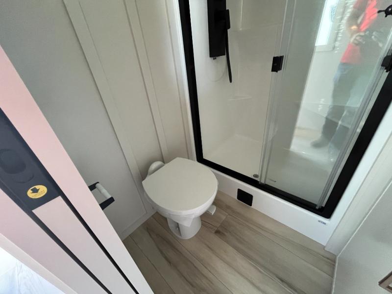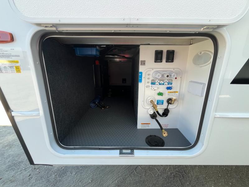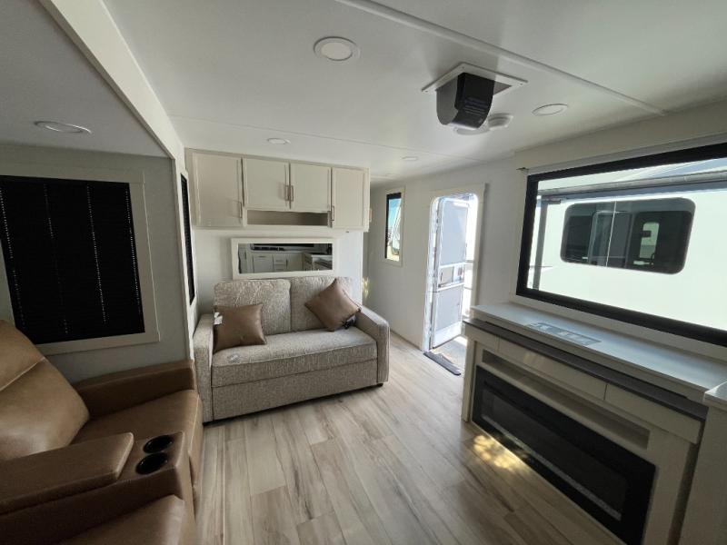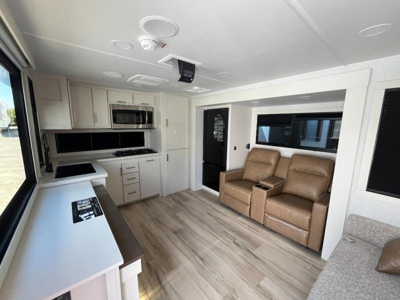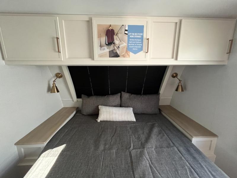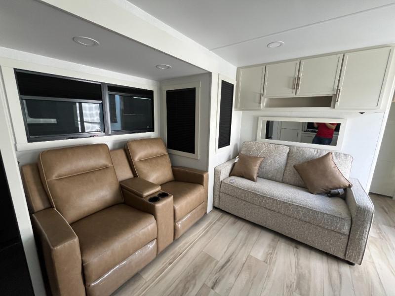 This travel trailer can comfortably sleep four with the king bed in the private bedroom and the tri-fold sofa in the main living area! The full bath features a spacious 42" x 30" shower with a built-in seat and Maxxair fan to name a few comforts. The front private bedroom features a 66" x 80" king bed with a MaxSpace Split-Level Wardrobe underneath to store shoes, clothes, and more! A slide out in the combined living area and rear kitchen makes your space more open, and you'll enjoy relaxing on the theater seating here in the evenings. The full kitchen includes a three burner stovetop, residential 30" convection microwave, 12 cu. ft. 12V refrigerator, plus a trash bin and Stow N' Go paper towel holder for added convenience. You can choose to eat outdoors under the 18' electric awning with LED lights or stay inside to dine at the pull-out dining table with a drawer for added storage!