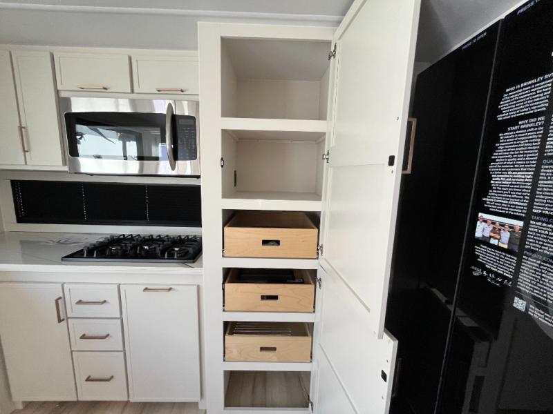 The lightweight Model I travel trailer by Brinkley is the perfect choice for those looking for an easy tow and at-home comforts! There is a drop-frame chassis, high-performance Road Armor suspension equalizer system, and Demco EZ Latch trailer coupler that automatically latches when dropped onto a hitch ball without the need of a safety pin. Additional exterior features include square Euro frameless windows, automotive-grade paint, full-width LED strip lighting in the pass-thru, and a pet & property security campside tie-down to keep your gear and furry friends safe. Inside, you'll be wowed by Brinkley's CraftSense wood trim construction, residential solid surface kitchen countertops, dimmable bedroom lights, and marine-grade neon LED shower lighting to name a few stand-out features!