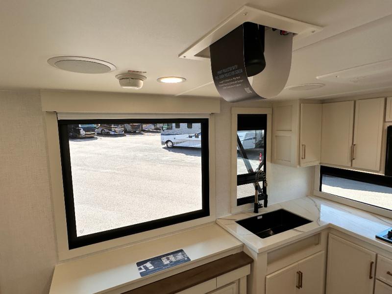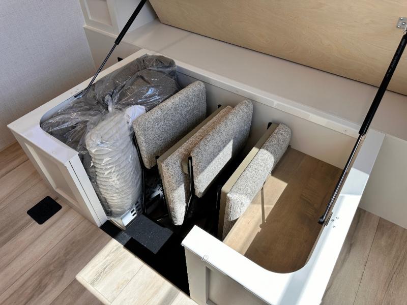 This travel trailer can comfortably sleep four with the king bed in the private bedroom and the tri-fold sofa in the main living area! The full bath features a spacious 42" x 30" shower with a built-in seat and Maxxair fan to name a few comforts. The front private bedroom features a 66" x 80" king bed with a MaxSpace Split-Level Wardrobe underneath to store shoes, clothes, and more! A slide out in the combined living area and rear kitchen makes your space more open, and you'll enjoy relaxing on the theater seating here in the evenings. The full kitchen includes a three burner stovetop, residential 30" convection microwave, 12 cu. ft. 12V refrigerator, plus a trash bin and Stow N' Go paper towel holder for added convenience. You can choose to eat outdoors under the 19' electric awning with LED lights or stay inside to dine at the pull-out dining table with a drawer for added storage!