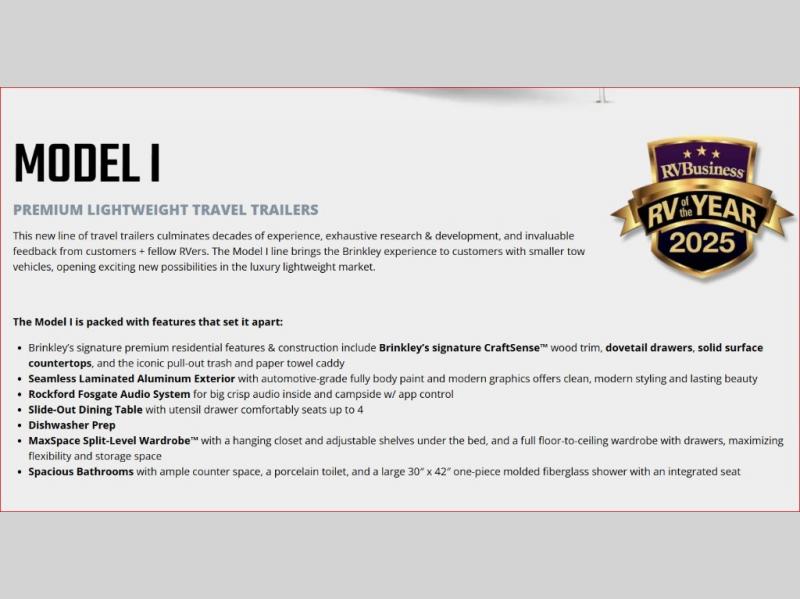 The lightweight Model I travel trailer by Brinkley is the perfect choice for those looking for an easy tow and at-home comforts! There is a drop-frame chassis, high-performance Road Armor suspension equalizer system, and Demco EZ Latch trailer coupler that automatically latches when dropped onto a hitch ball without the need of a safety pin. Additional exterior features include square Euro frameless windows, automotive-grade paint, full-width LED strip lighting in the pass-thru, and a pet & property security campside tie-down to keep your gear and furry friends safe. Inside, you'll be wowed by Brinkley's CraftSense wood trim construction, residential solid surface kitchen countertops, dimmable bedroom lights, and marine-grade neon LED shower lighting to name a few stand-out features!