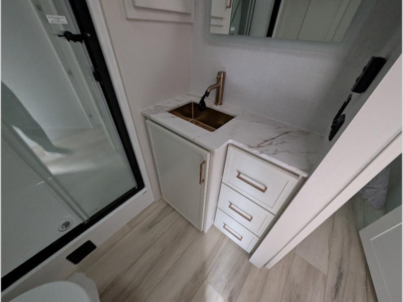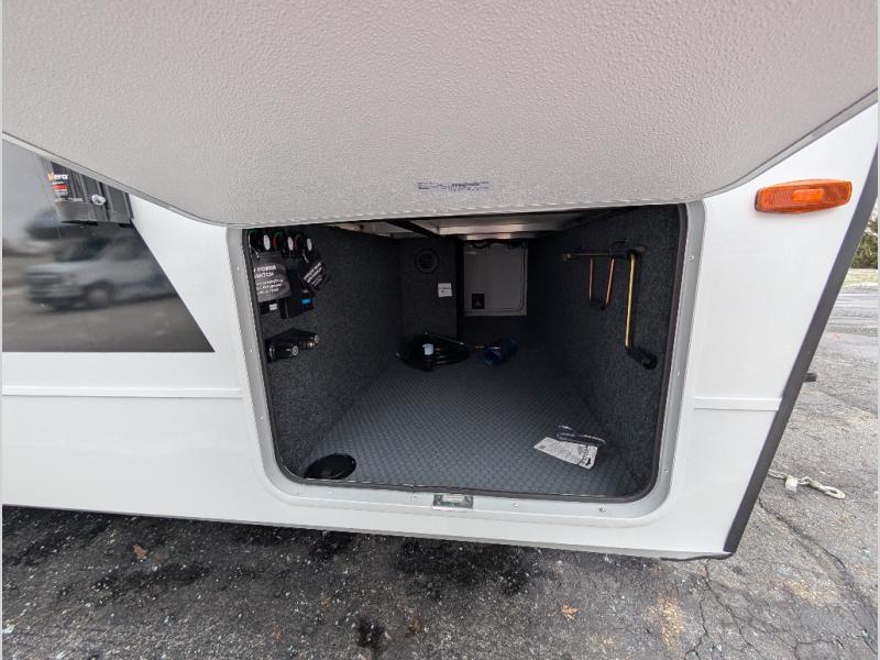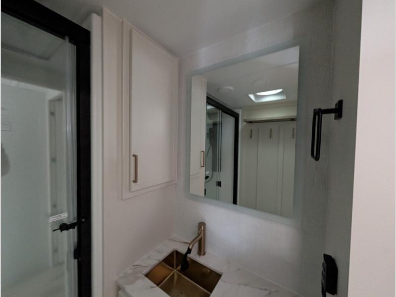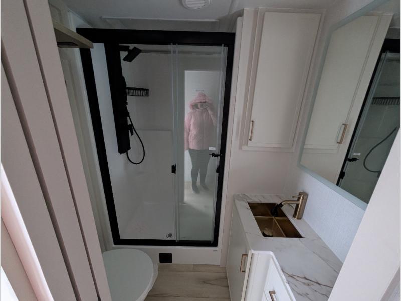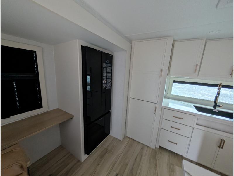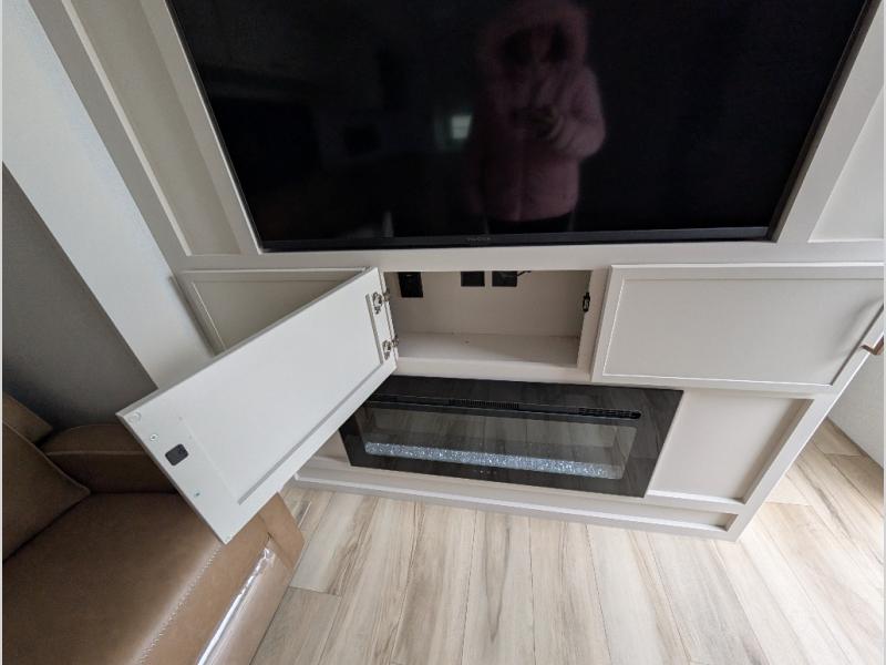 Savor the joy of cooking and sharing meals with loved ones in this beautifully appointed kitchen! This rear kitchen features a spacious pantry with drawers and outlets, a 30" convection microwave, a flip-up counter, and a 12V refrigerator. The convertible dining table and L-desk create a refined space for meals, work, and relaxation. The adjacent L-sofa forms a cozy sanctuary for reading, socializing, or enjoying the entertainment center and fireplace. There is a full bathroom with everything you need to keep your personal hygiene on the road. Plus, the front bedroom’s peaceful haven features a plush king bed, nightstands with storage, and a MaxSpace split-level wardrobe. Additionally, the two exterior awnings create a spacious outdoor living area, ideal for relaxing, entertaining, or enjoying the great outdoors.