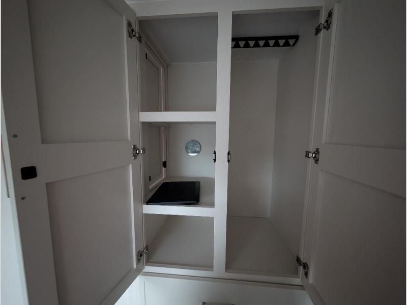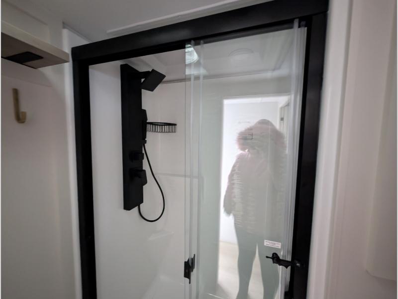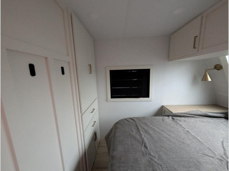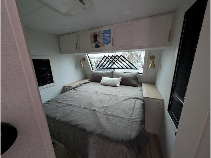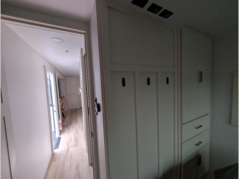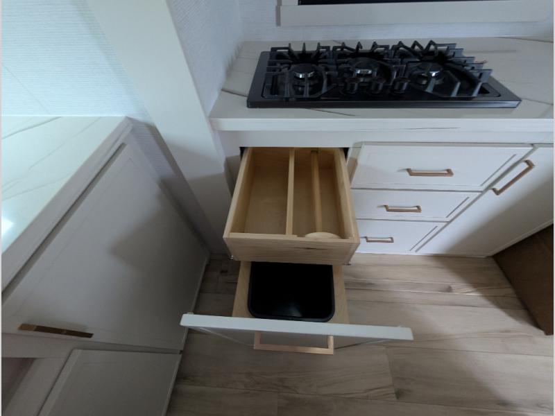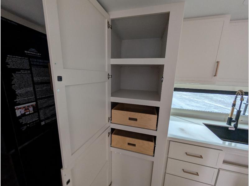 Savor the joy of cooking and sharing meals with loved ones in this beautifully appointed kitchen! This rear kitchen features a spacious pantry with drawers and outlets, a 30" convection microwave, a flip-up counter, and a 12V refrigerator. The convertible dining table and L-desk create a refined space for meals, work, and relaxation. The adjacent L-sofa forms a cozy sanctuary for reading, socializing, or enjoying the entertainment center and fireplace. There is a full bathroom with everything you need to keep your personal hygiene on the road. Plus, the front bedroom’s peaceful haven features a plush king bed, nightstands with storage, and a MaxSpace split-level wardrobe. Additionally, the two exterior awnings create a spacious outdoor living area, ideal for relaxing, entertaining, or enjoying the great outdoors.