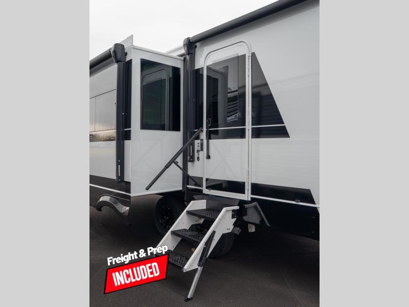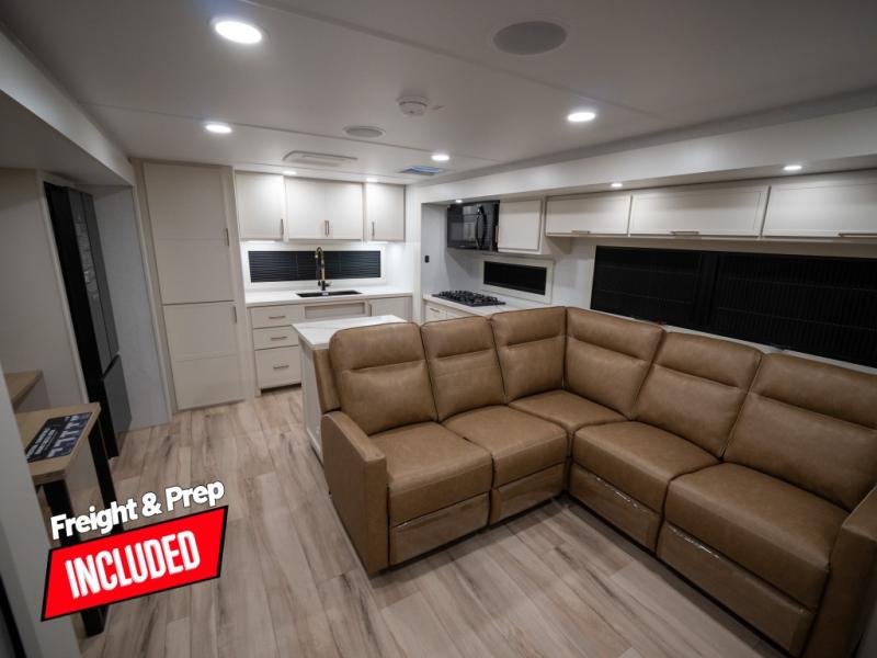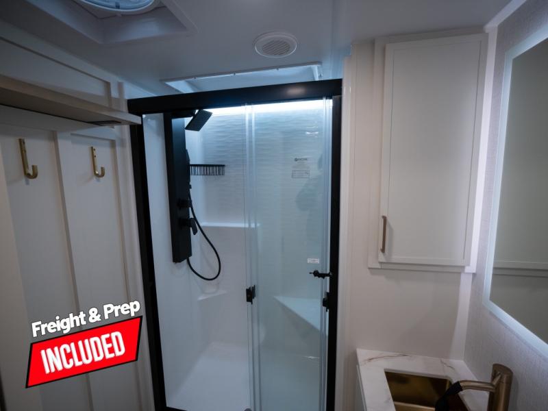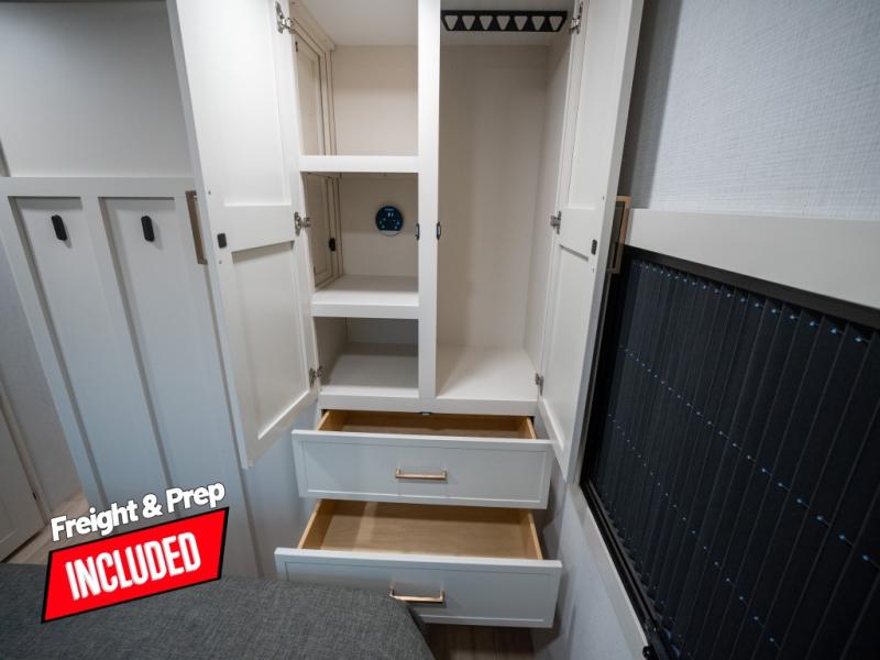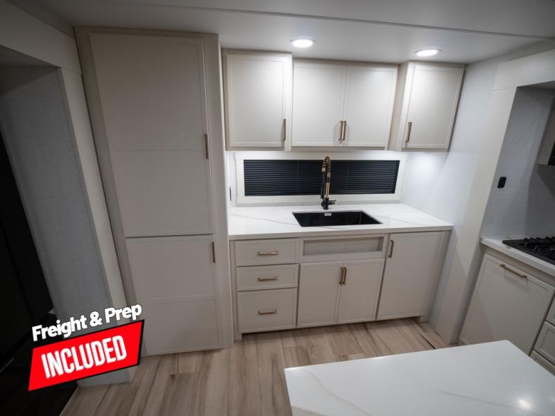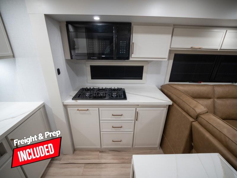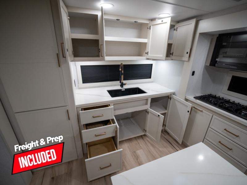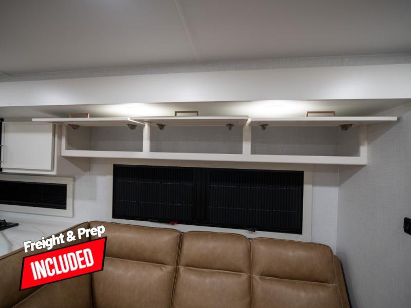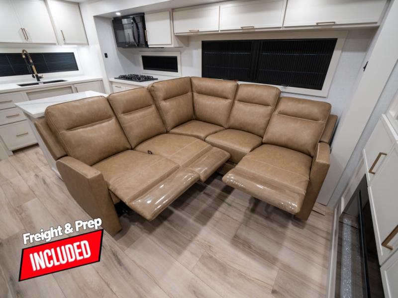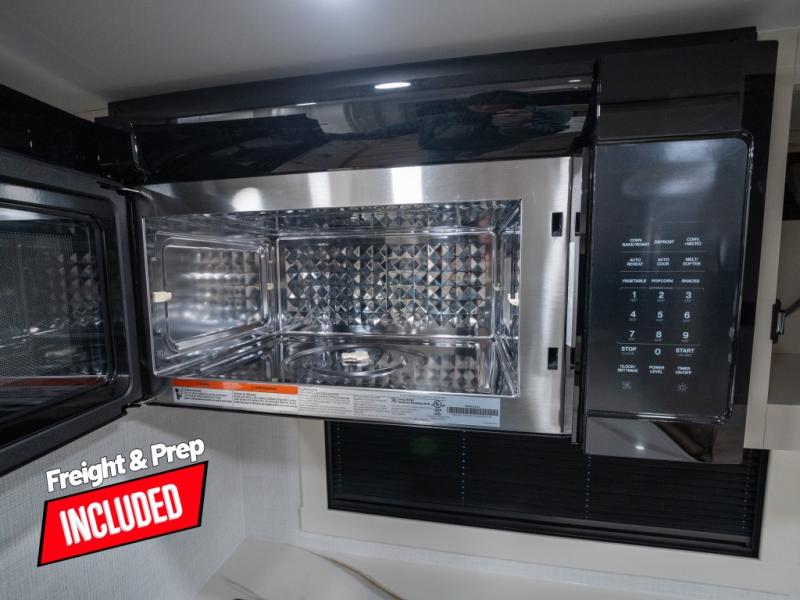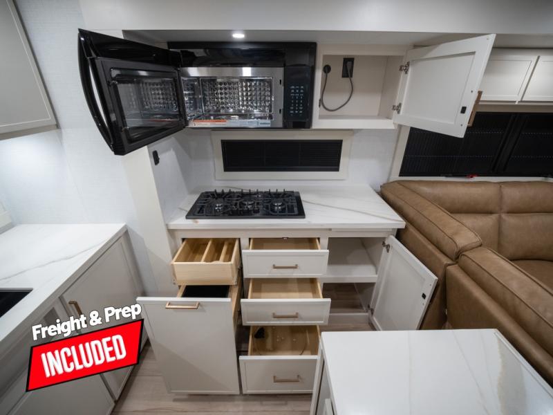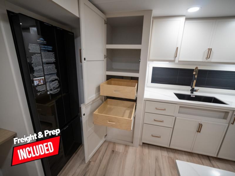 Savor the joy of cooking and sharing meals with loved ones in this beautifully appointed kitchen! This rear kitchen features a spacious pantry with drawers and outlets, a 30" convection microwave, a flip-up counter, and a 12V refrigerator. The convertible dining table and L-desk create a refined space for meals, work, and relaxation. The adjacent L-sofa forms a cozy sanctuary for reading, socializing, or enjoying the entertainment center and fireplace. There is a full bathroom with everything you need to keep your personal hygiene on the road. Plus, the front bedroom’s peaceful haven features a plush king bed, nightstands with storage, and a MaxSpace split-level wardrobe. Additionally, the two exterior awnings create a spacious outdoor living area, ideal for relaxing, entertaining, or enjoying the great outdoors.
