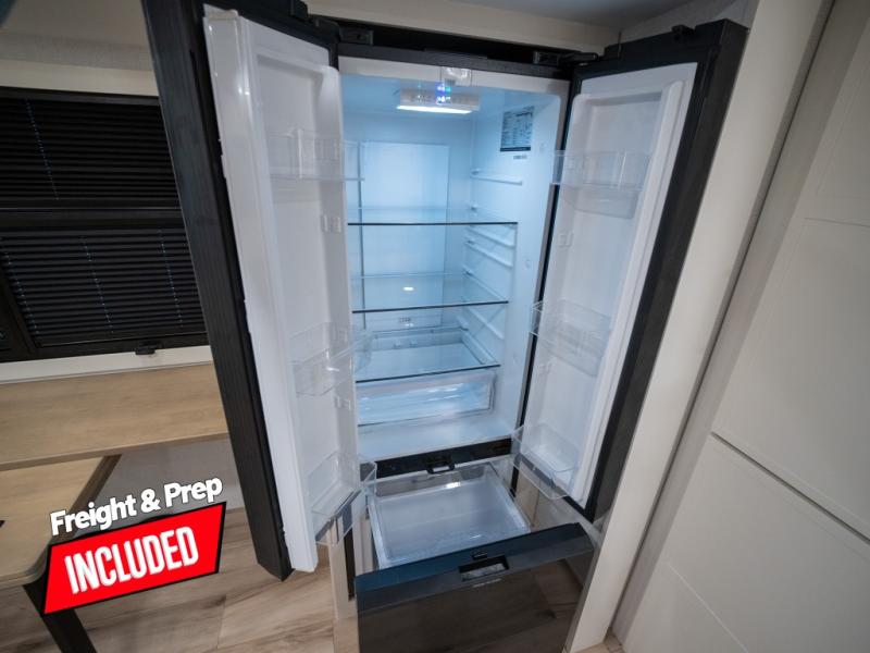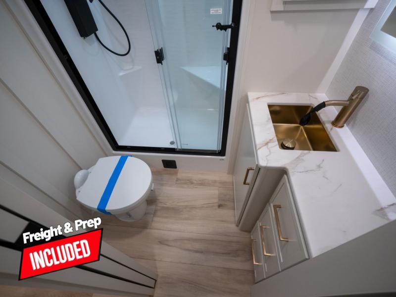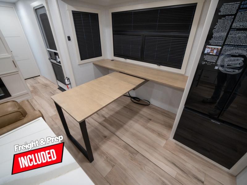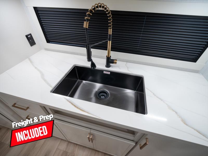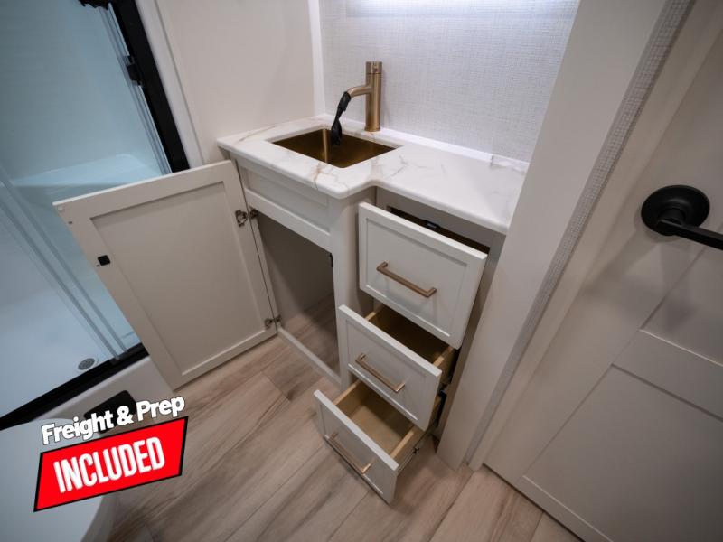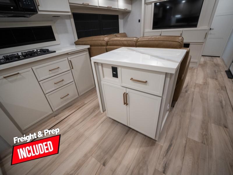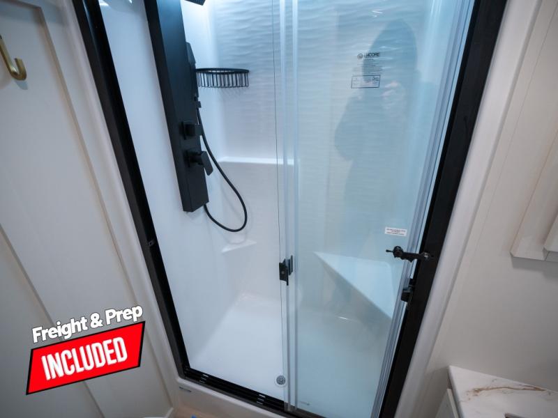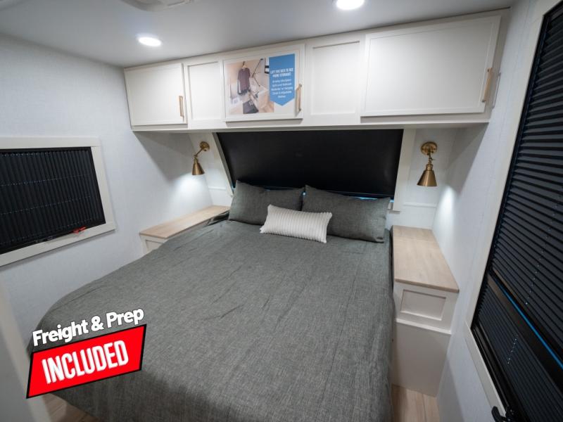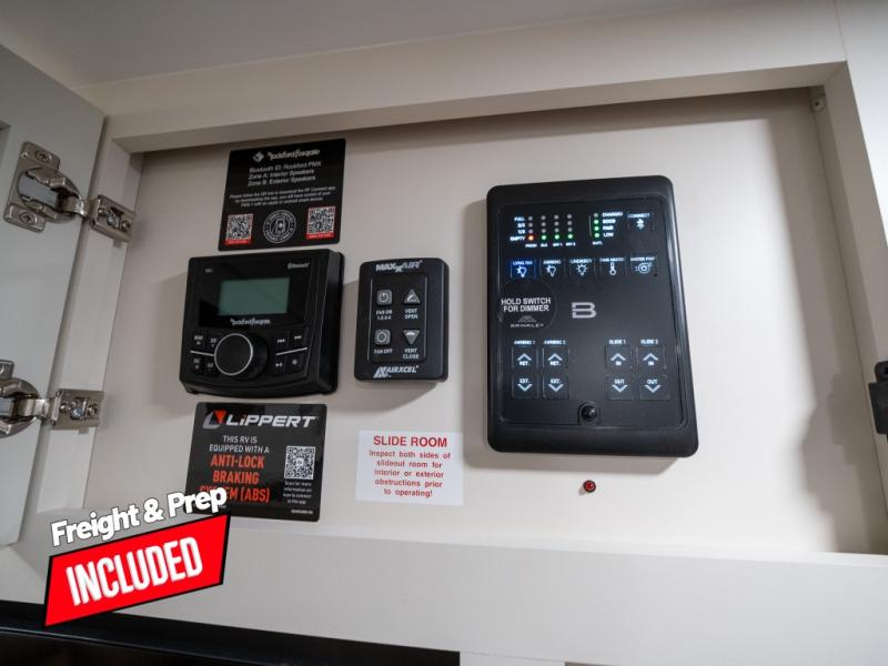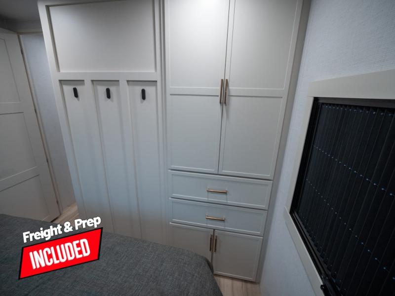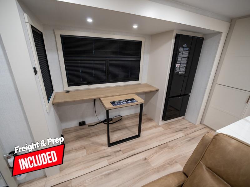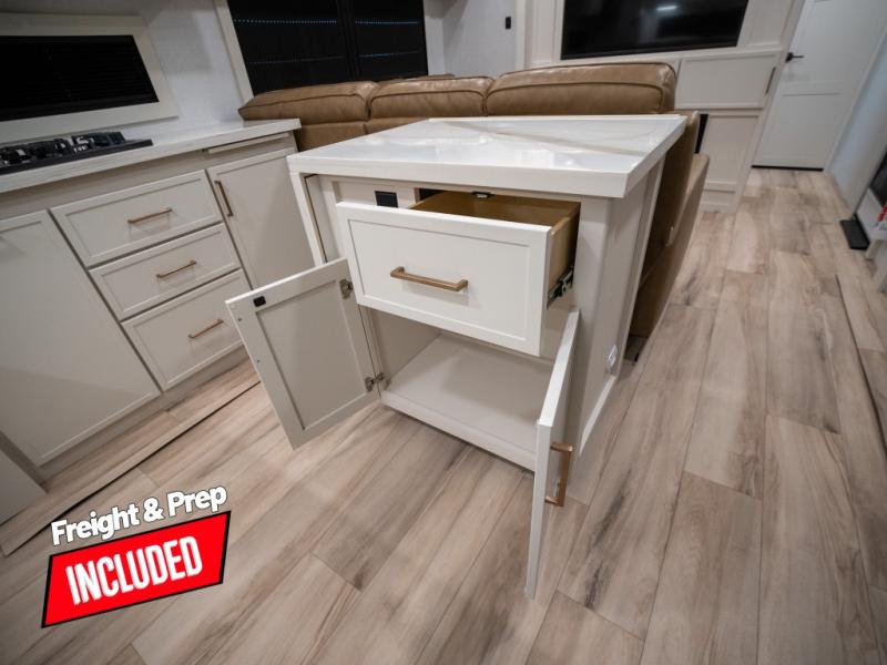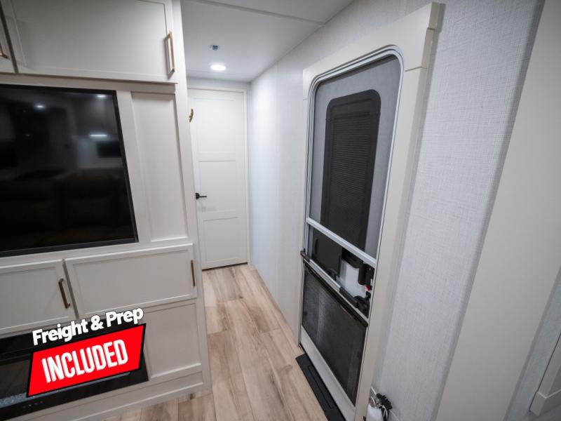 Savor the joy of cooking and sharing meals with loved ones in this beautifully appointed kitchen! This rear kitchen features a spacious pantry with drawers and outlets, a 30" convection microwave, a flip-up counter, and a 12V refrigerator. The convertible dining table and L-desk create a refined space for meals, work, and relaxation. The adjacent L-sofa forms a cozy sanctuary for reading, socializing, or enjoying the entertainment center and fireplace. There is a full bathroom with everything you need to keep your personal hygiene on the road. Plus, the front bedroom’s peaceful haven features a plush king bed, nightstands with storage, and a MaxSpace split-level wardrobe. Additionally, the two exterior awnings create a spacious outdoor living area, ideal for relaxing, entertaining, or enjoying the great outdoors.