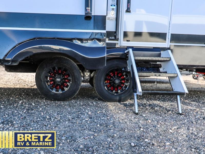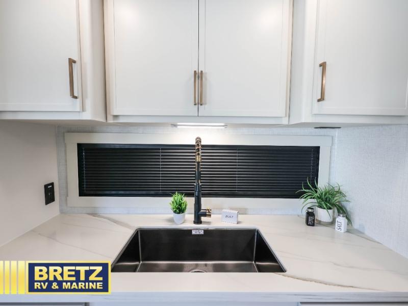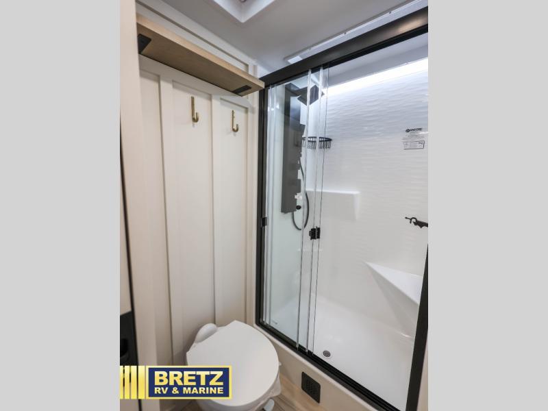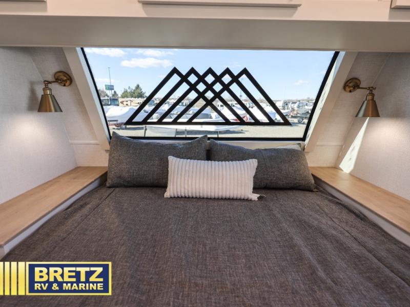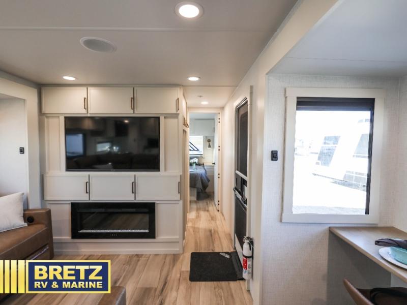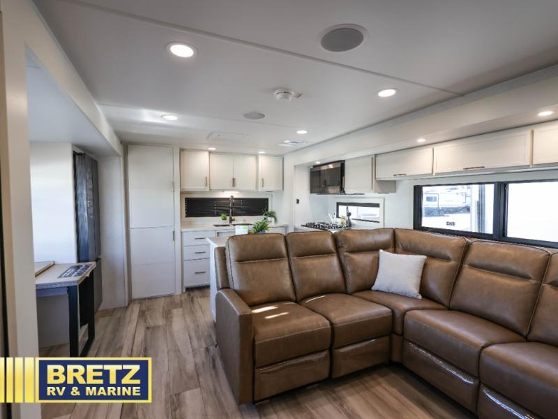 Savor the joy of cooking and sharing meals with loved ones in this beautifully appointed kitchen! This rear kitchen features a spacious pantry with drawers and outlets, a 30" convection microwave, a flip-up counter, and a 12V refrigerator. The convertible dining table and L-desk create a refined space for meals, work, and relaxation. The adjacent L-sofa forms a cozy sanctuary for reading, socializing, or enjoying the entertainment center and fireplace. There is a full bathroom with everything you need to keep your personal hygiene on the road. Plus, the front bedroom’s peaceful haven features a plush king bed, nightstands with storage, and a MaxSpace split-level wardrobe. Additionally, the two exterior awnings create a spacious outdoor living area, ideal for relaxing, entertaining, or enjoying the great outdoors.