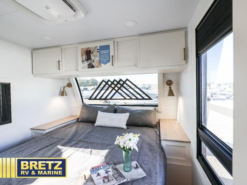 The lightweight Model I travel trailer by Brinkley is the perfect choice for those looking for an easy tow and at-home comforts! There is a drop-frame chassis, high-performance Road Armor suspension equalizer system, and Demco EZ Latch trailer coupler that automatically latches when dropped onto a hitch ball without the need of a safety pin. Additional exterior features include square Euro frameless windows, automotive-grade paint, full-width LED strip lighting in the pass-thru, and a pet & property security campside tie-down to keep your gear and furry friends safe. Inside, you'll be wowed by Brinkley's CraftSense wood trim construction, residential solid surface kitchen countertops, dimmable bedroom lights, and marine-grade neon LED shower lighting to name a few stand-out features!
