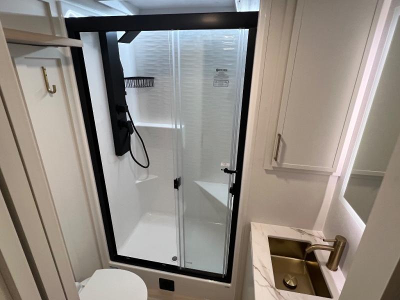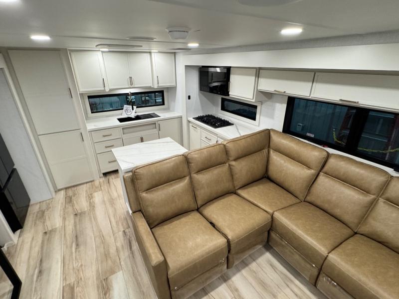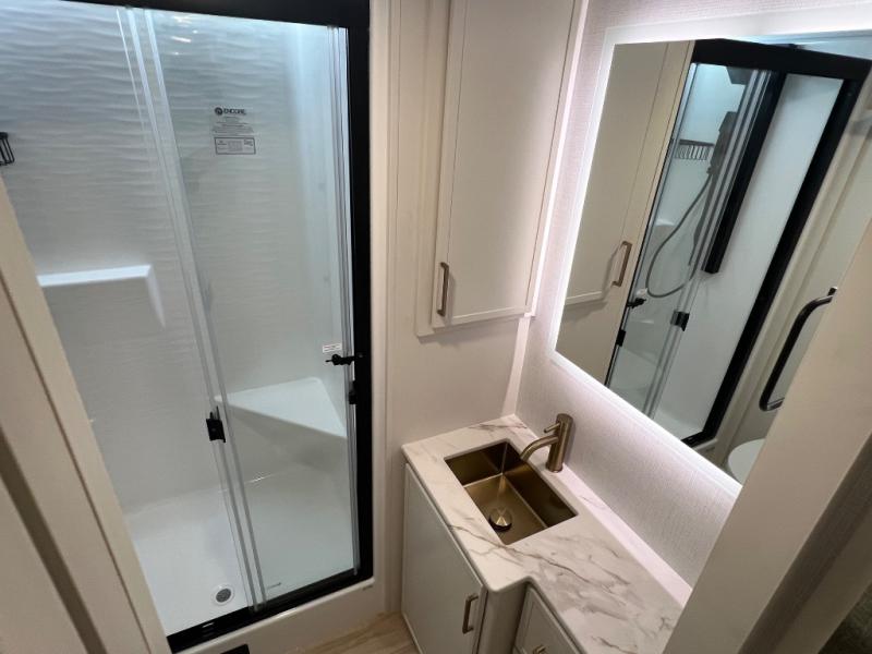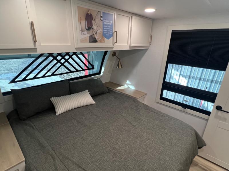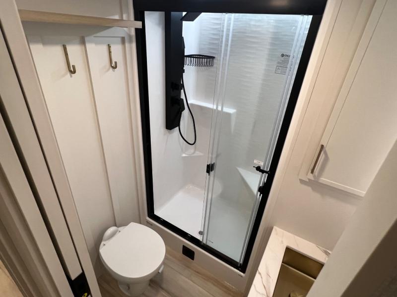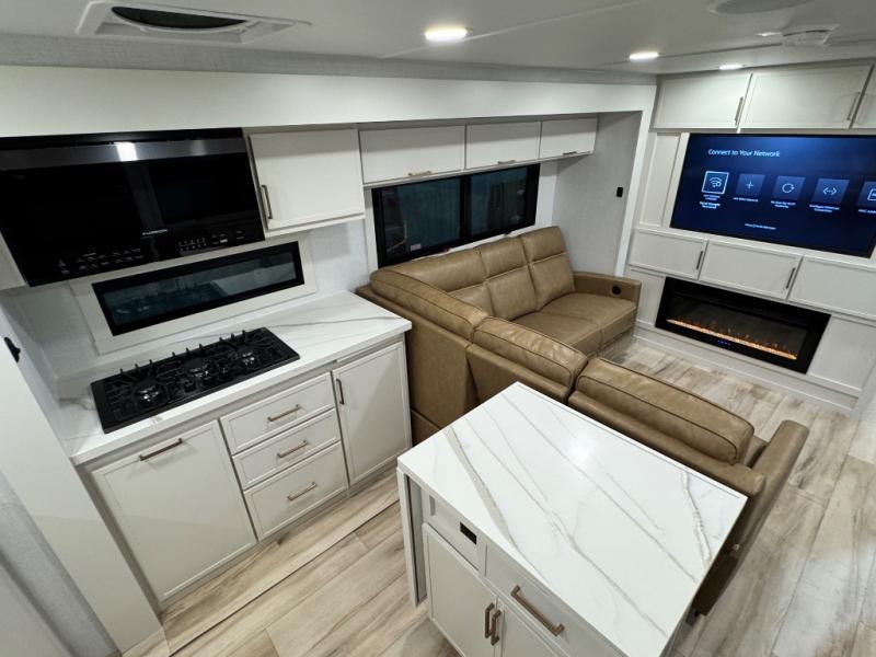 Savor the joy of cooking and sharing meals with loved ones in this beautifully appointed kitchen! This rear kitchen features a spacious pantry with drawers and outlets, a 30" convection microwave, a flip-up counter, and a 12V refrigerator. The convertible dining table and L-desk create a refined space for meals, work, and relaxation. The adjacent L-sofa forms a cozy sanctuary for reading, socializing, or enjoying the entertainment center and fireplace. There is a full bathroom with everything you need to keep your personal hygiene on the road. Plus, the front bedroom’s peaceful haven features a plush king bed, nightstands with storage, and a MaxSpace split-level wardrobe. Additionally, the two exterior awnings create a spacious outdoor living area, ideal for relaxing, entertaining, or enjoying the great outdoors.