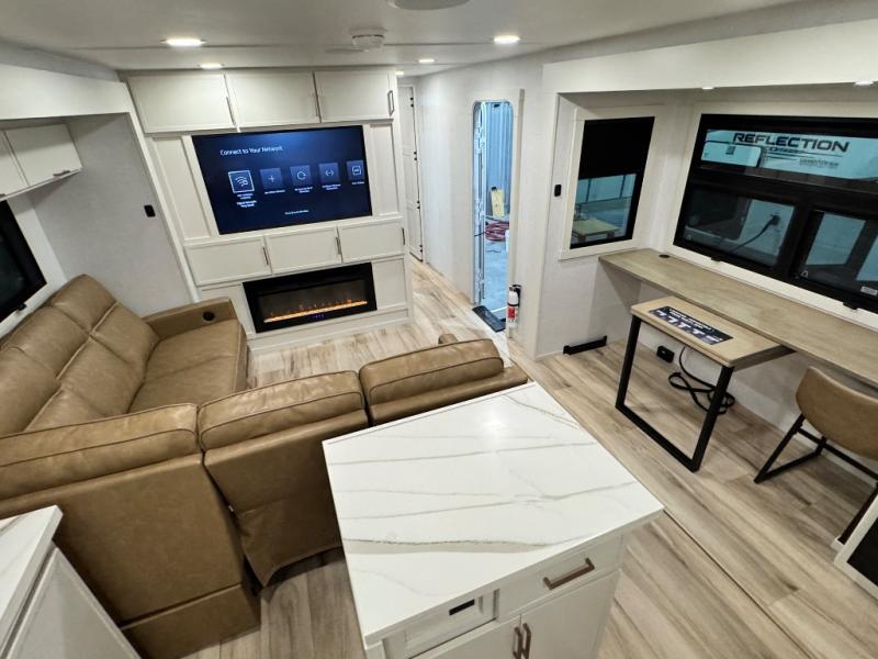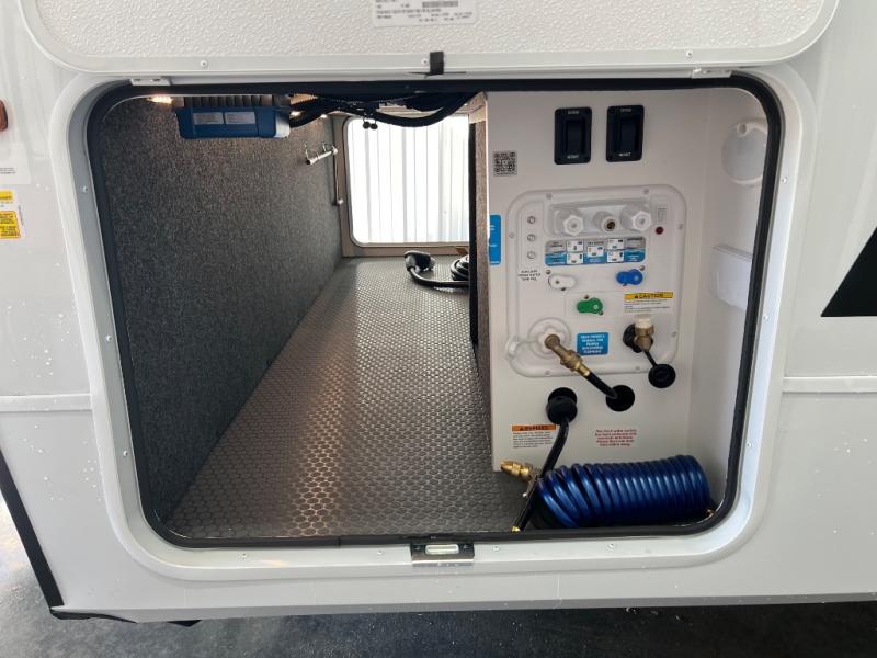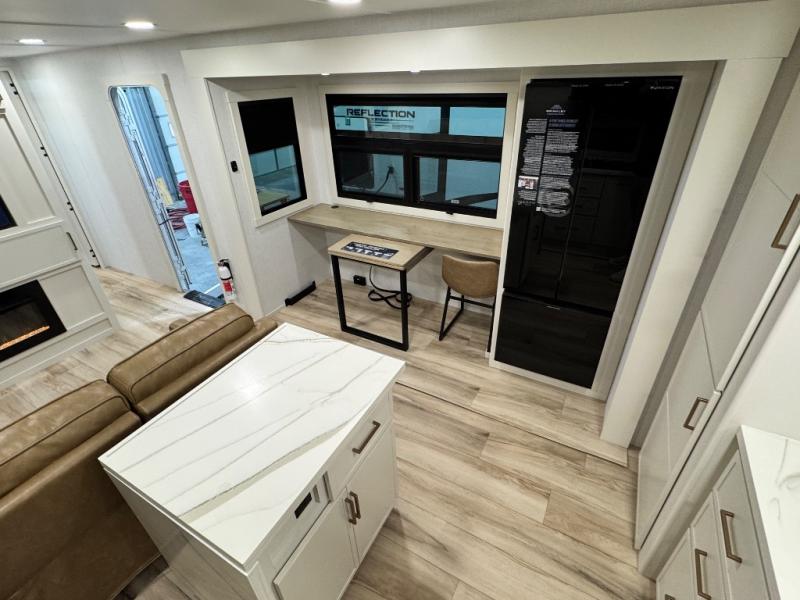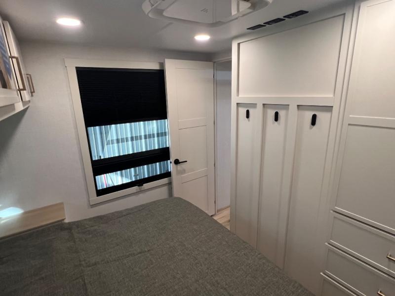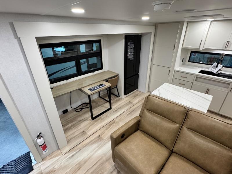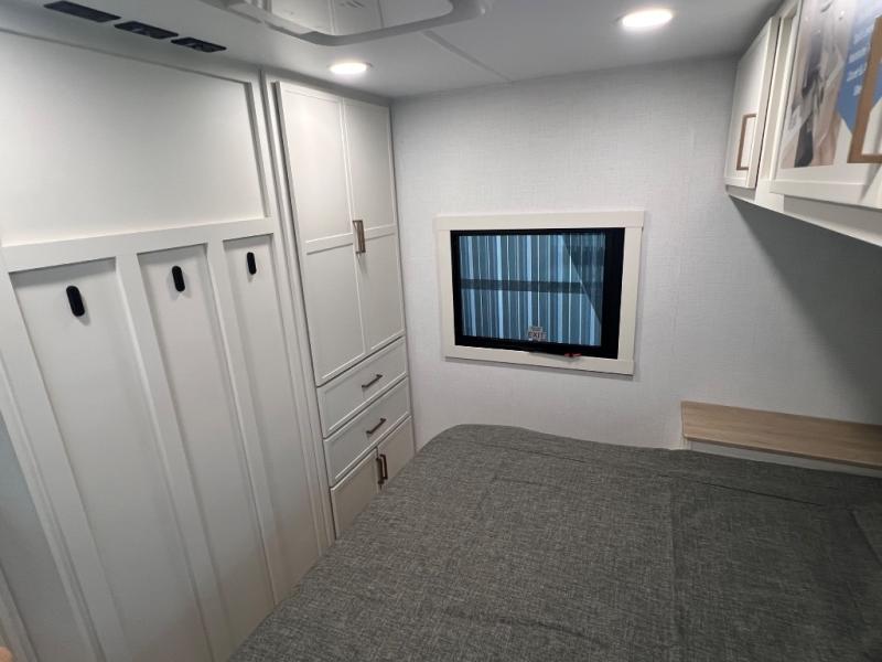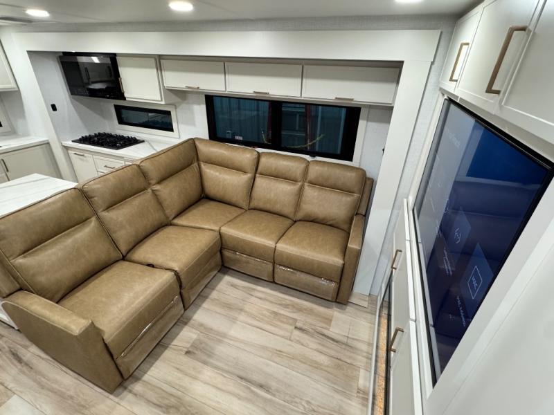 Savor the joy of cooking and sharing meals with loved ones in this beautifully appointed kitchen! This rear kitchen features a spacious pantry with drawers and outlets, a 30" convection microwave, a flip-up counter, and a 12V refrigerator. The convertible dining table and L-desk create a refined space for meals, work, and relaxation. The adjacent L-sofa forms a cozy sanctuary for reading, socializing, or enjoying the entertainment center and fireplace. There is a full bathroom with everything you need to keep your personal hygiene on the road. Plus, the front bedroom’s peaceful haven features a plush king bed, nightstands with storage, and a MaxSpace split-level wardrobe. Additionally, the two exterior awnings create a spacious outdoor living area, ideal for relaxing, entertaining, or enjoying the great outdoors.