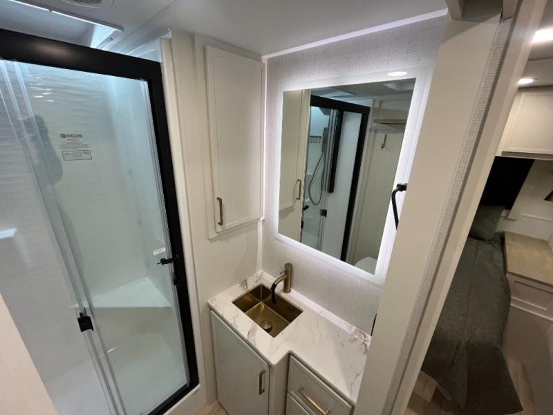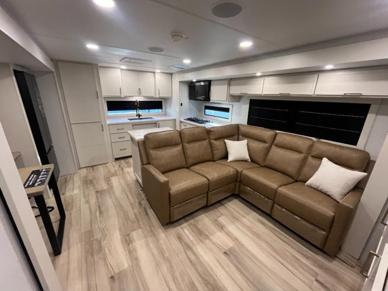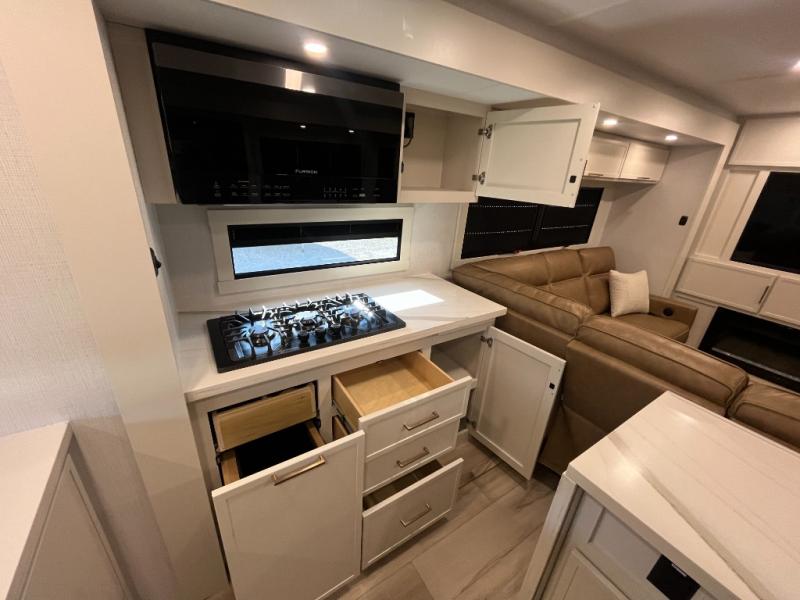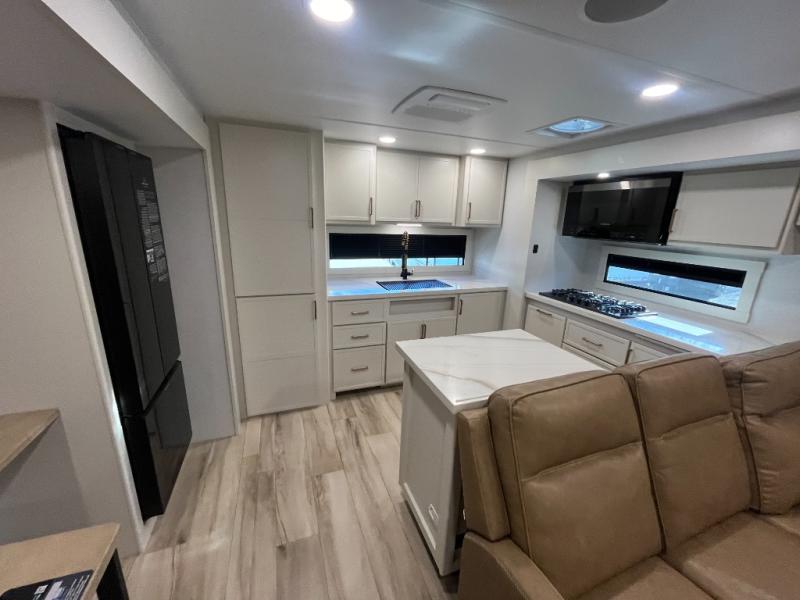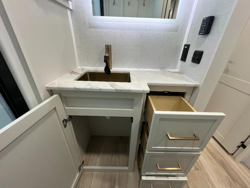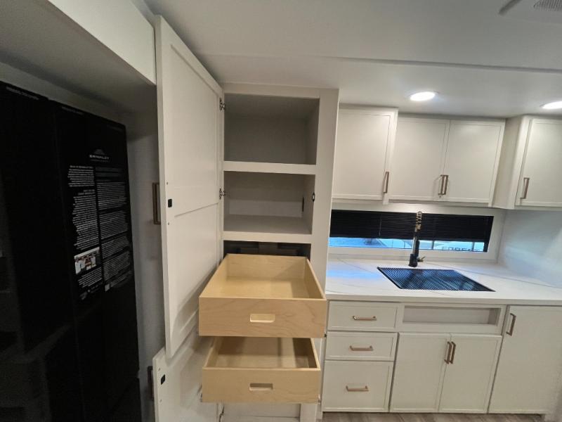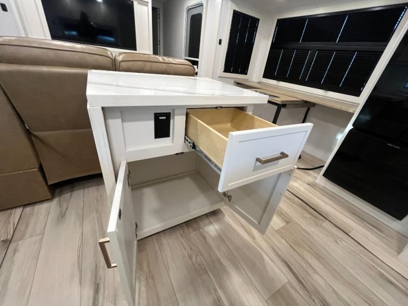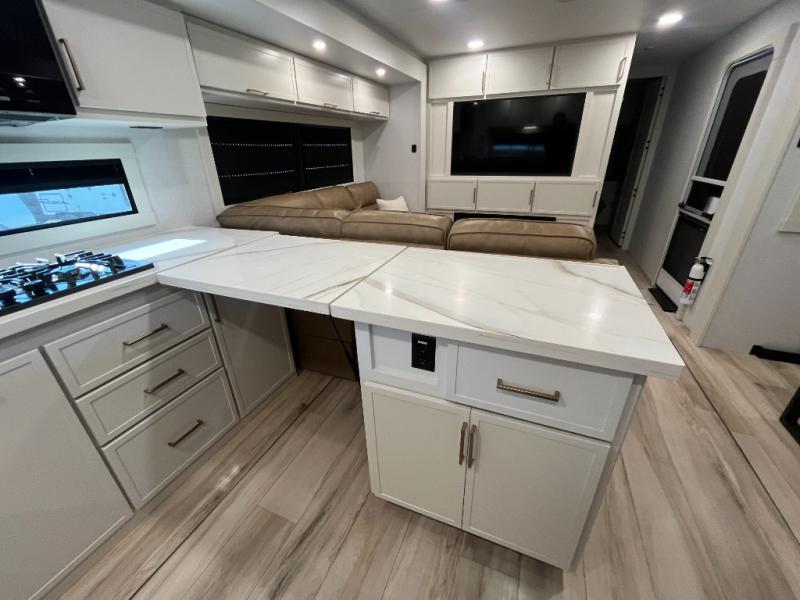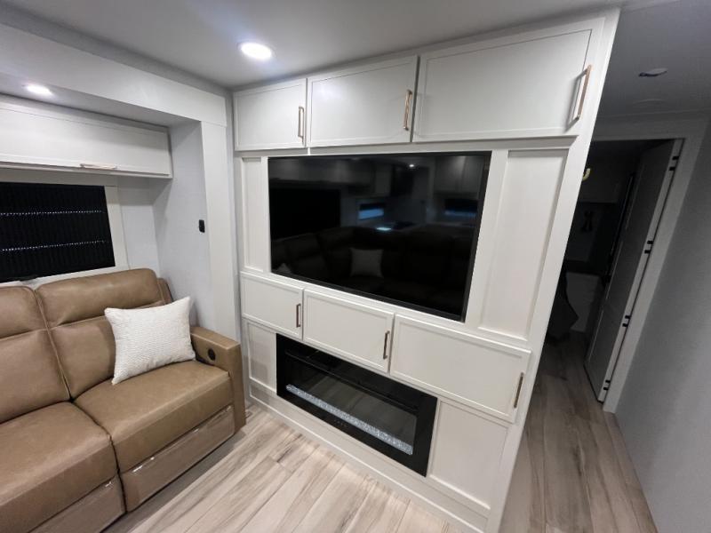Savor the joy of cooking and sharing meals with loved ones in this beautifully appointed kitchen! This rear kitchen features a spacious pantry with drawers and outlets, a 30" convection microwave, a flip-up counter, and a 12V refrigerator. The convertible dining table and L-desk create a refined space for meals, work, and relaxation. The adjacent L-sofa forms a cozy sanctuary for reading, socializing, or enjoying the entertainment center and fireplace. There is a full bathroom with everything you need to keep your personal hygiene on the road. Plus, the front bedroom’s peaceful haven features a plush king bed, nightstands with storage, and a MaxSpace split-level wardrobe. Additionally, the two exterior awnings create a spacious outdoor living area, ideal for relaxing, entertaining, or enjoying the great outdoors.