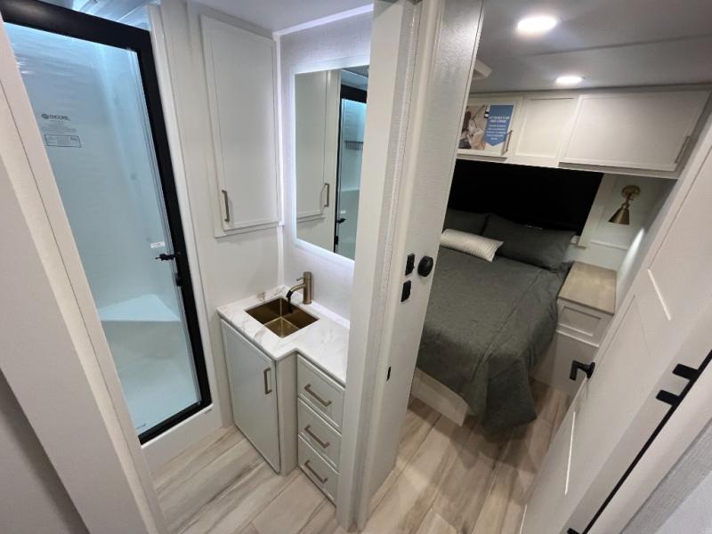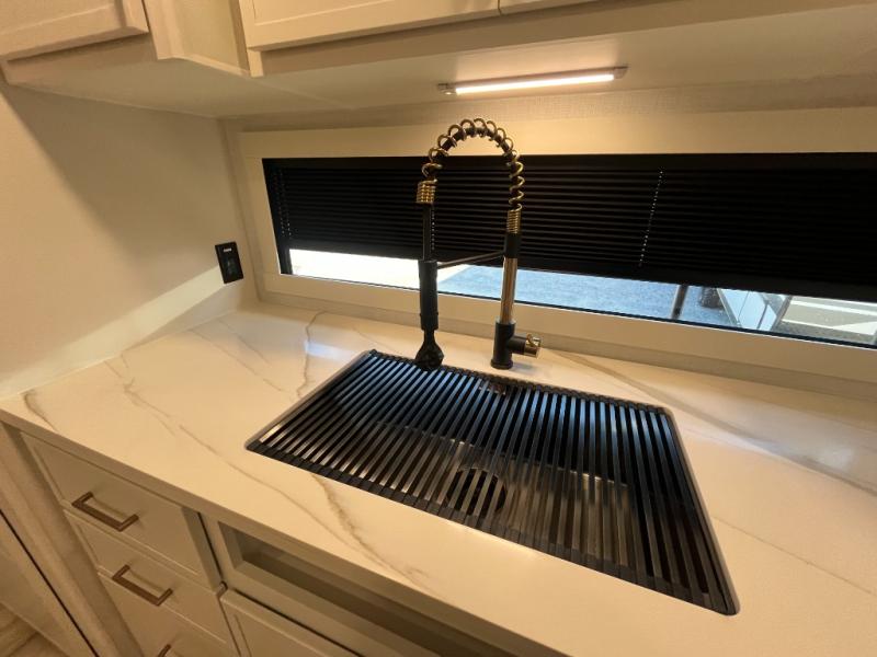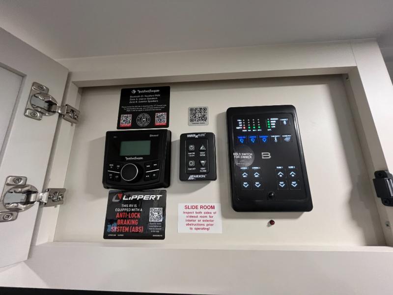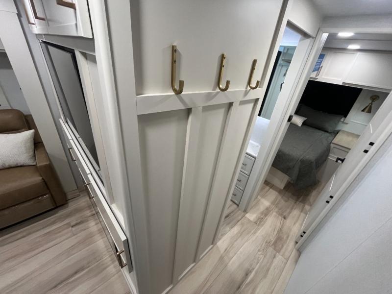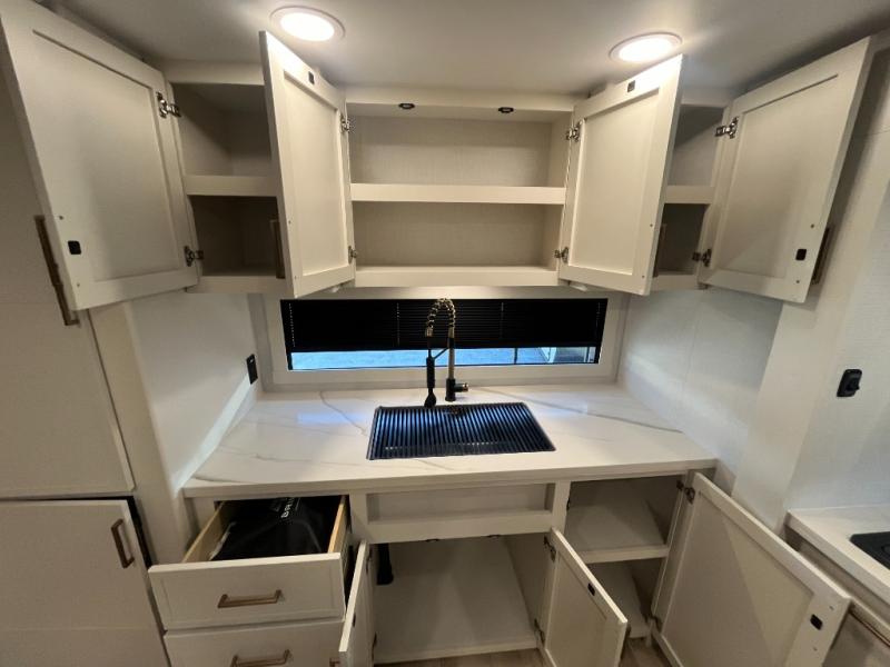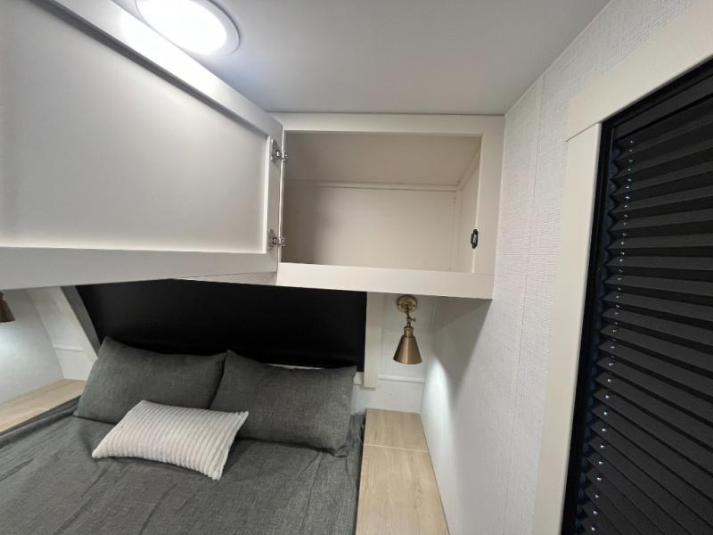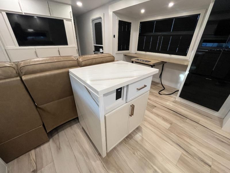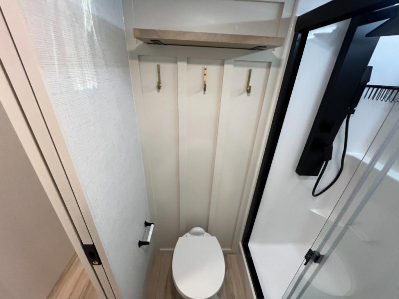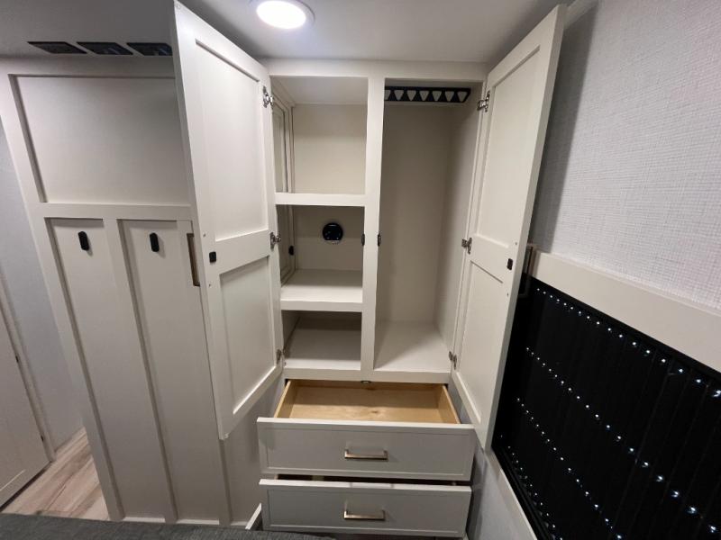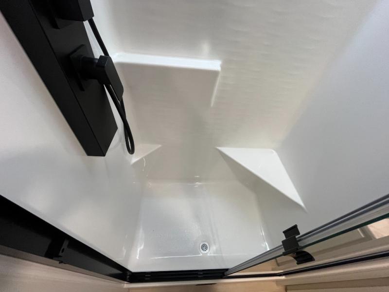 Savor the joy of cooking and sharing meals with loved ones in this beautifully appointed kitchen! This rear kitchen features a spacious pantry with drawers and outlets, a 30" convection microwave, a flip-up counter, and a 12V refrigerator. The convertible dining table and L-desk create a refined space for meals, work, and relaxation. The adjacent L-sofa forms a cozy sanctuary for reading, socializing, or enjoying the entertainment center and fireplace. There is a full bathroom with everything you need to keep your personal hygiene on the road. Plus, the front bedroom’s peaceful haven features a plush king bed, nightstands with storage, and a MaxSpace split-level wardrobe. Additionally, the two exterior awnings create a spacious outdoor living area, ideal for relaxing, entertaining, or enjoying the great outdoors.