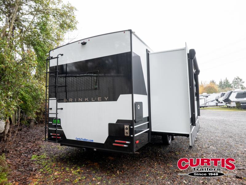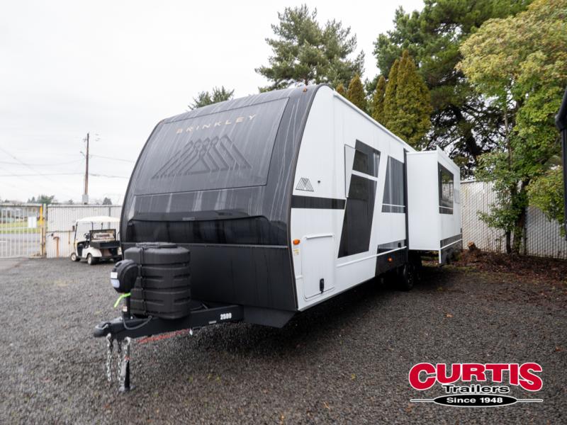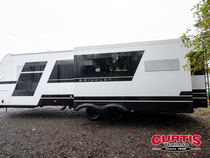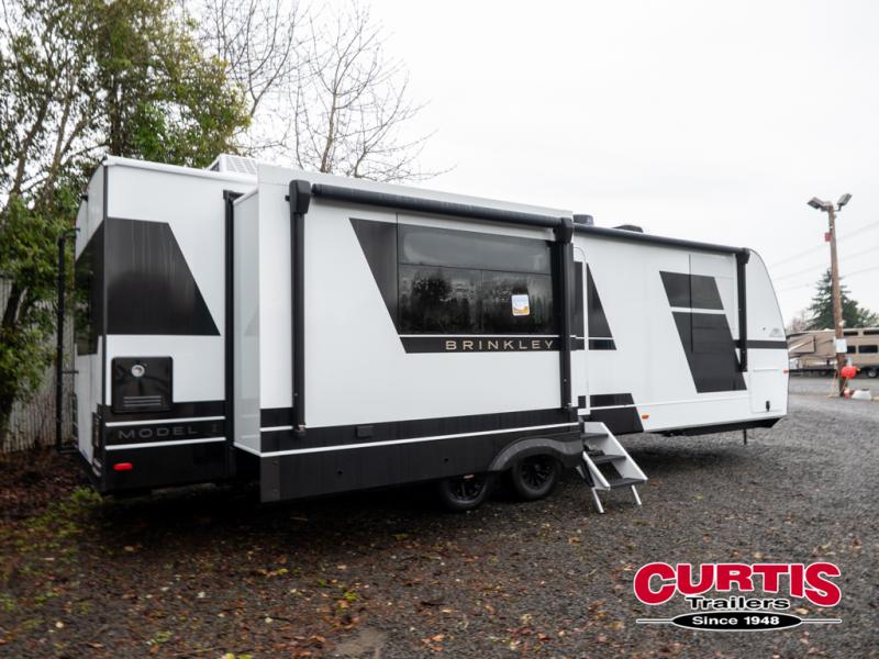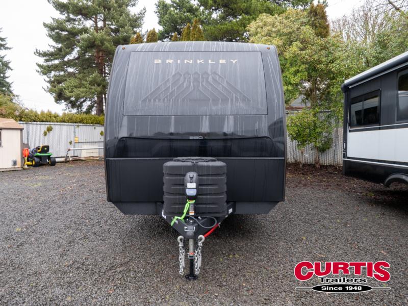The lightweight Model I travel trailer by Brinkley is the perfect choice for those looking for an easy tow and at-home comforts! There is a drop-frame chassis, high-performance Road Armor suspension equalizer system, and Demco EZ Latch trailer coupler that automatically latches when dropped onto a hitch ball without the need of a safety pin. Additional exterior features include square Euro frameless windows, automotive-grade paint, full-width LED strip lighting in the pass-thru, and a pet & property security campside tie-down to keep your gear and furry friends safe. Inside, you'll be wowed by Brinkley's CraftSense wood trim construction, residential solid surface kitchen countertops, dimmable bedroom lights, and marine-grade neon LED shower lighting to name a few stand-out features!