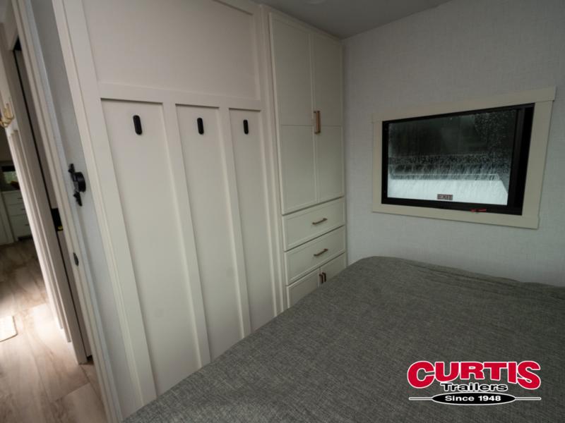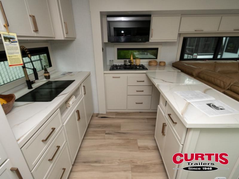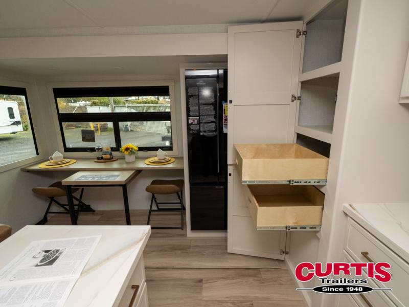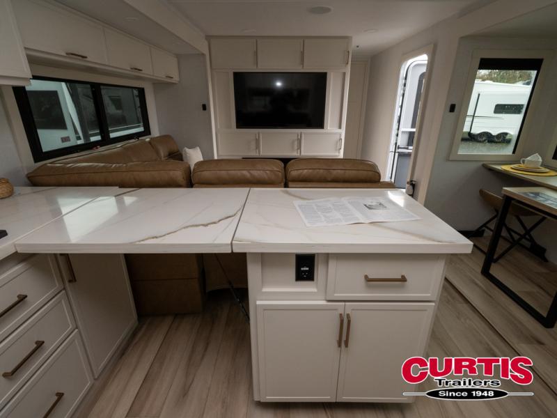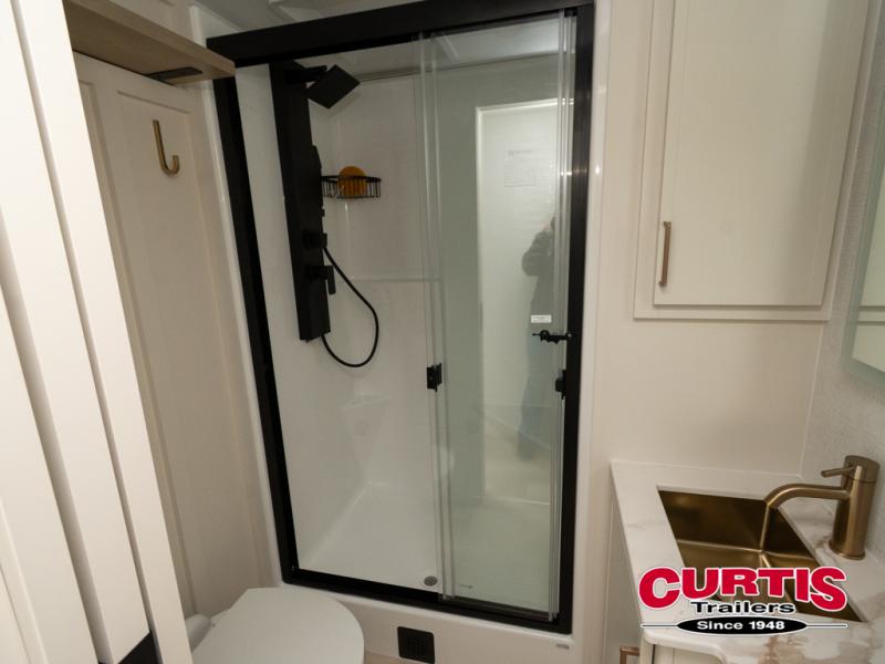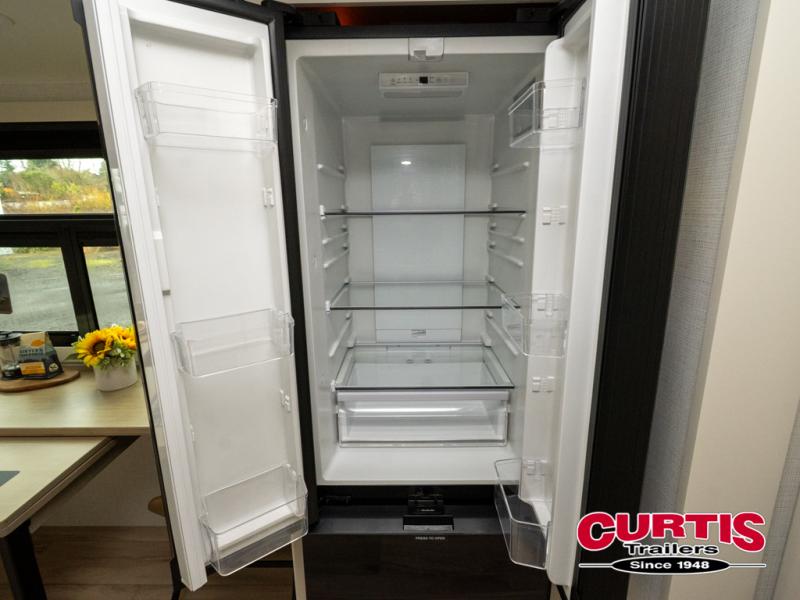 Savor the joy of cooking and sharing meals with loved ones in this beautifully appointed kitchen! This rear kitchen features a spacious pantry with drawers and outlets, a 30" convection microwave, a flip-up counter, and a 12V refrigerator. The convertible dining table and L-desk create a refined space for meals, work, and relaxation. The adjacent L-sofa forms a cozy sanctuary for reading, socializing, or enjoying the entertainment center and fireplace. There is a full bathroom with everything you need to keep your personal hygiene on the road. Plus, the front bedroom’s peaceful haven features a plush king bed, nightstands with storage, and a MaxSpace split-level wardrobe. Additionally, the two exterior awnings create a spacious outdoor living area, ideal for relaxing, entertaining, or enjoying the great outdoors.