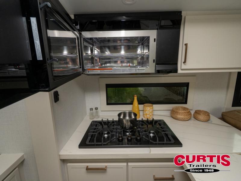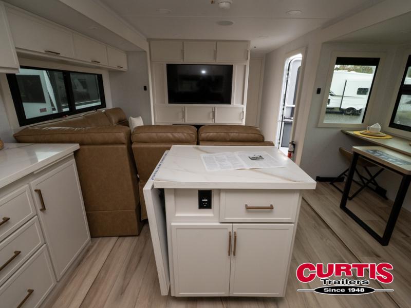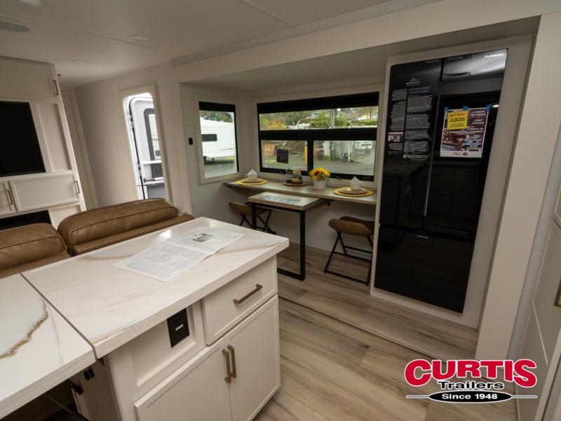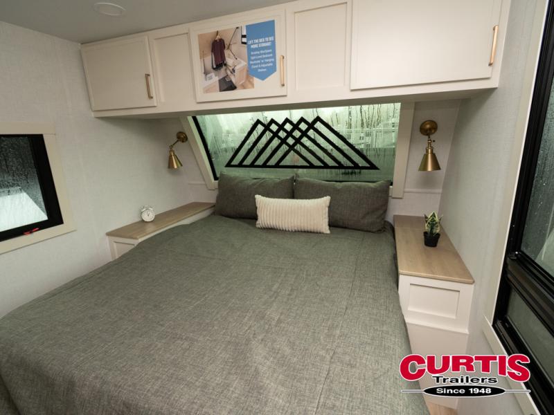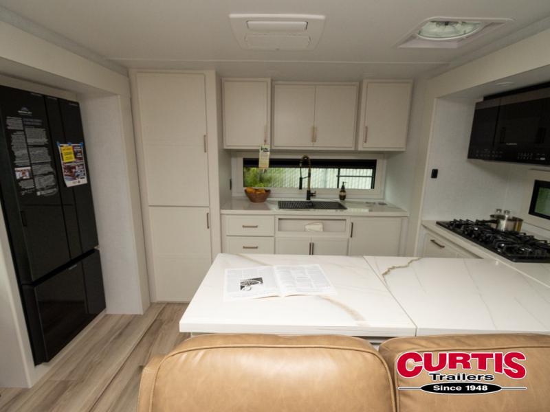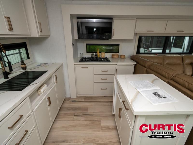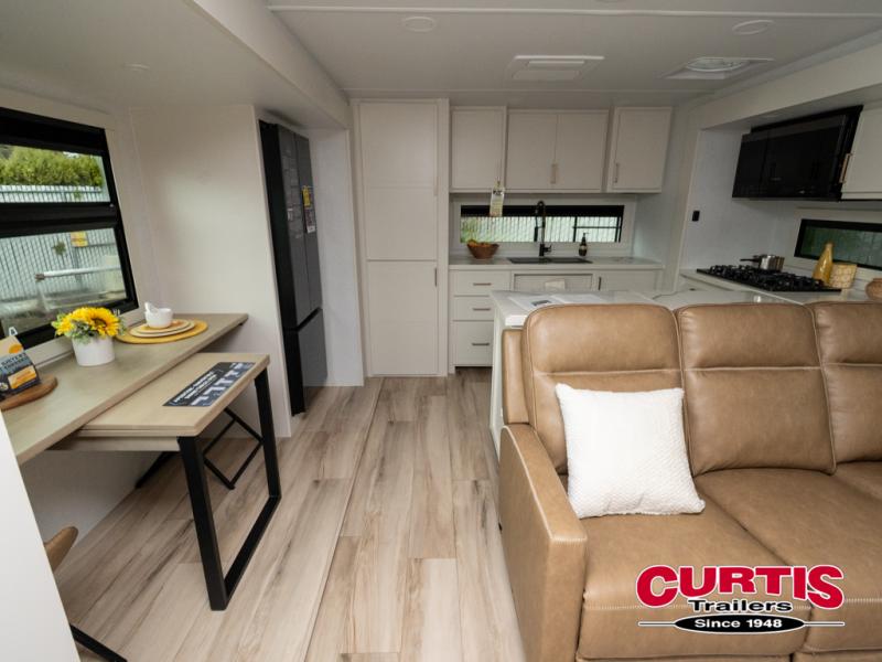 Savor the joy of cooking and sharing meals with loved ones in this beautifully appointed kitchen! This rear kitchen features a spacious pantry with drawers and outlets, a 30" convection microwave, a flip-up counter, and a 12V refrigerator. The convertible dining table and L-desk create a refined space for meals, work, and relaxation. The adjacent L-sofa forms a cozy sanctuary for reading, socializing, or enjoying the entertainment center and fireplace. There is a full bathroom with everything you need to keep your personal hygiene on the road. Plus, the front bedroom’s peaceful haven features a plush king bed, nightstands with storage, and a MaxSpace split-level wardrobe. Additionally, the two exterior awnings create a spacious outdoor living area, ideal for relaxing, entertaining, or enjoying the great outdoors.