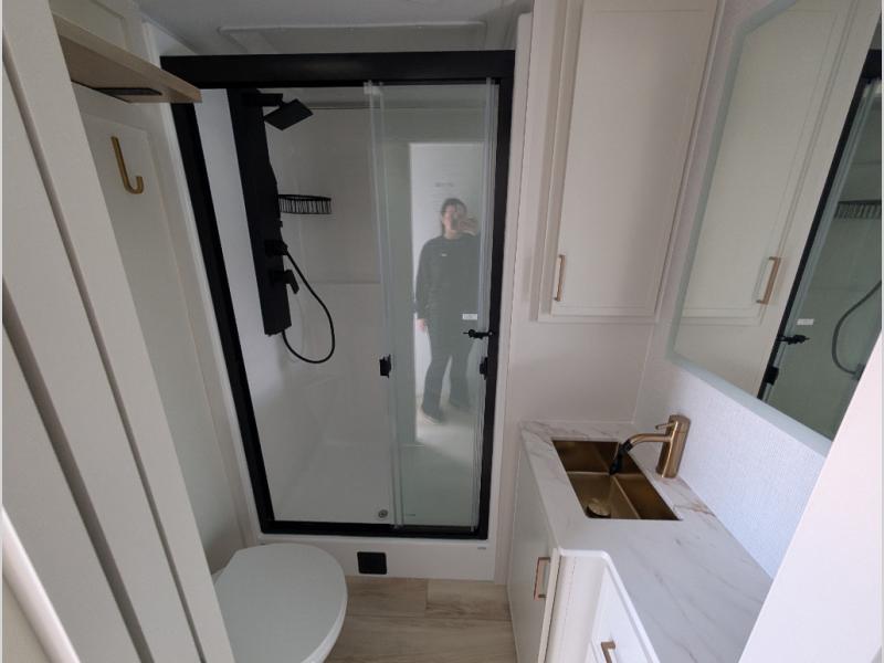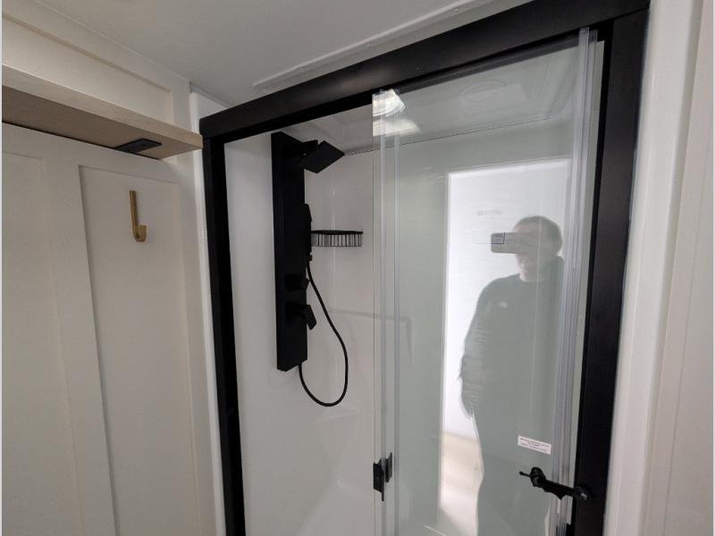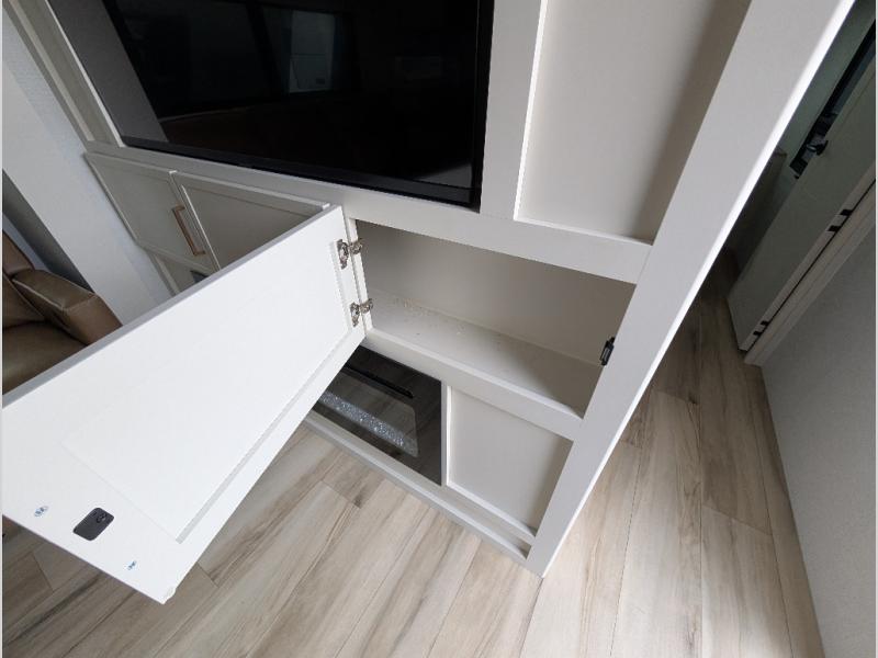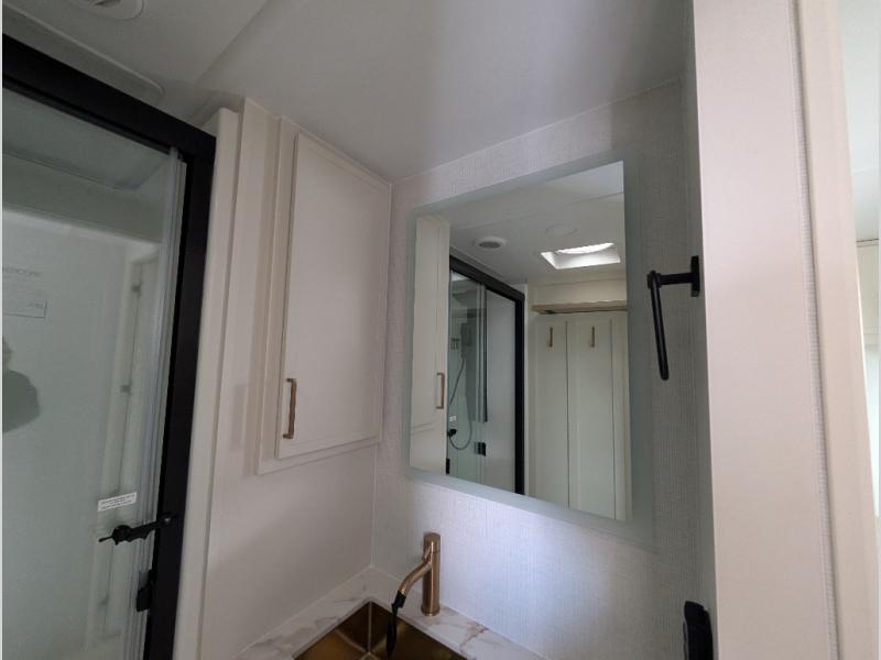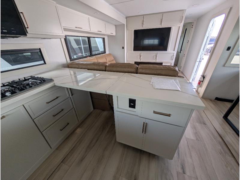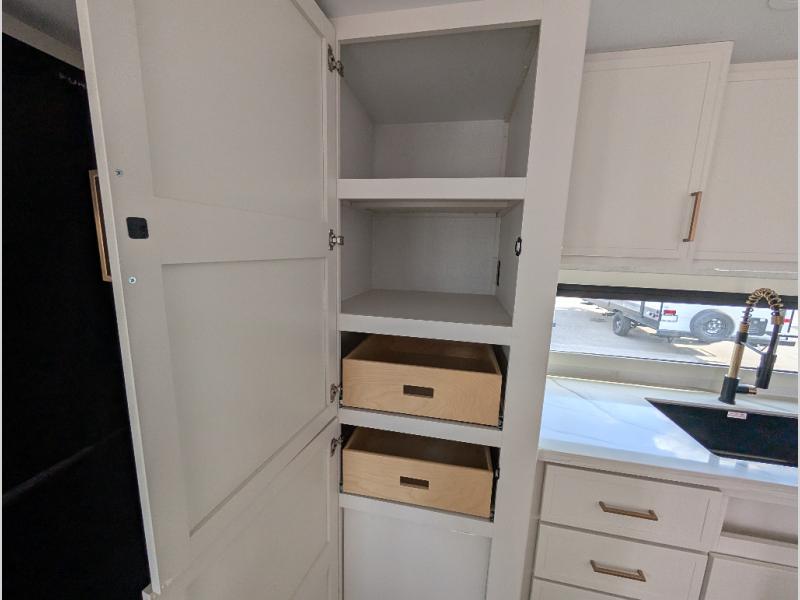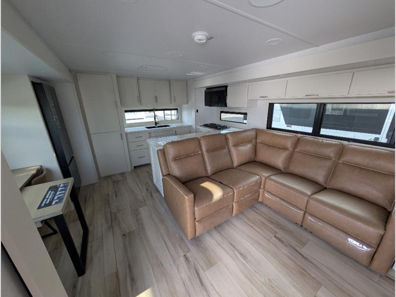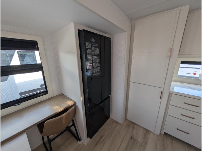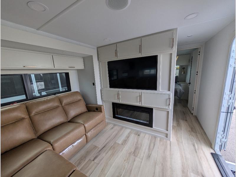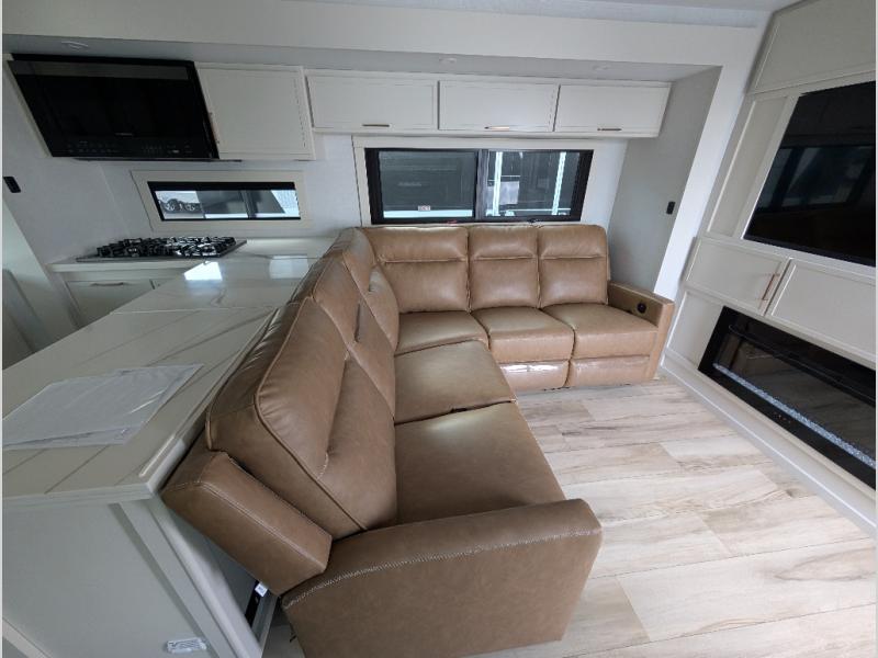 Savor the joy of cooking and sharing meals with loved ones in this beautifully appointed kitchen! This rear kitchen features a spacious pantry with drawers and outlets, a 30" convection microwave, a flip-up counter, and a 12V refrigerator. The convertible dining table and L-desk create a refined space for meals, work, and relaxation. The adjacent L-sofa forms a cozy sanctuary for reading, socializing, or enjoying the entertainment center and fireplace. There is a full bathroom with everything you need to keep your personal hygiene on the road. Plus, the front bedroom’s peaceful haven features a plush king bed, nightstands with storage, and a MaxSpace split-level wardrobe. Additionally, the two exterior awnings create a spacious outdoor living area, ideal for relaxing, entertaining, or enjoying the great outdoors.