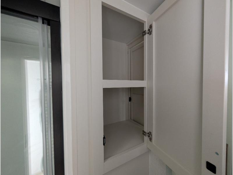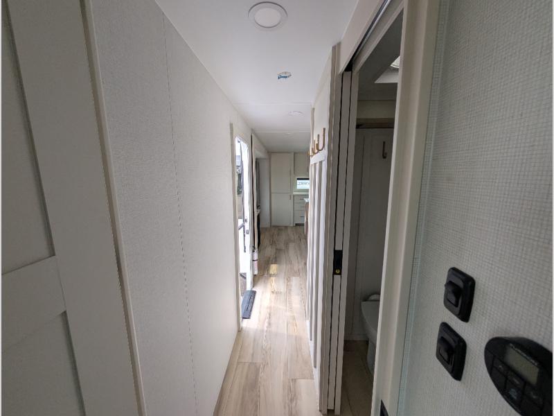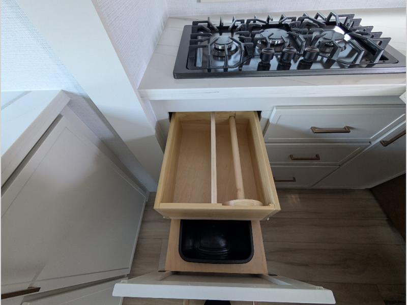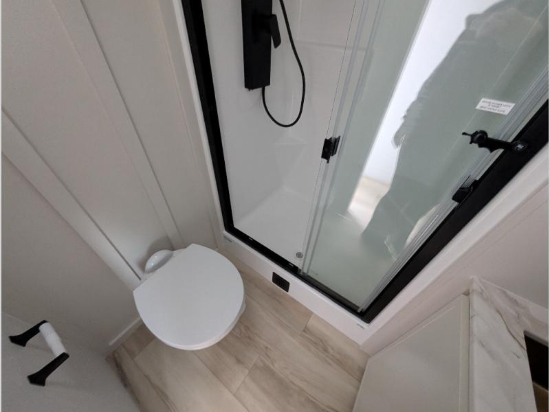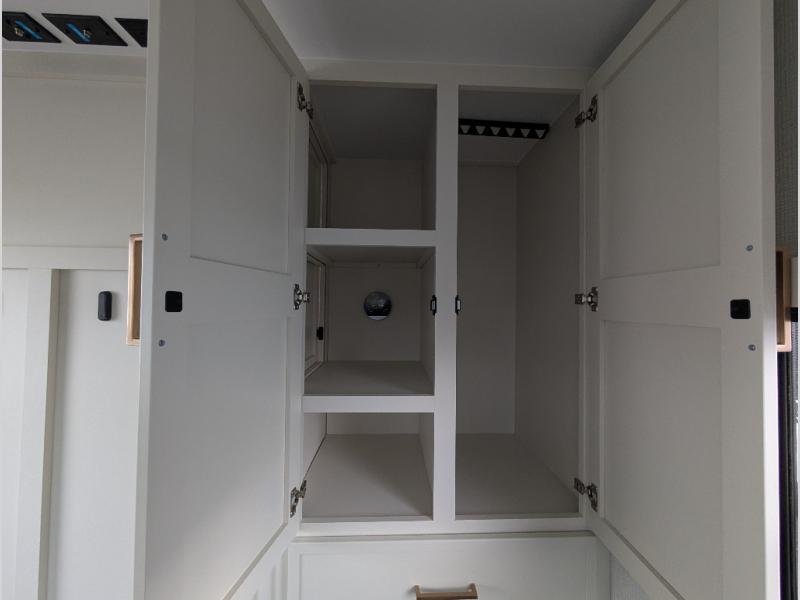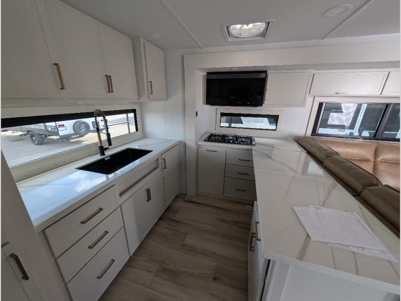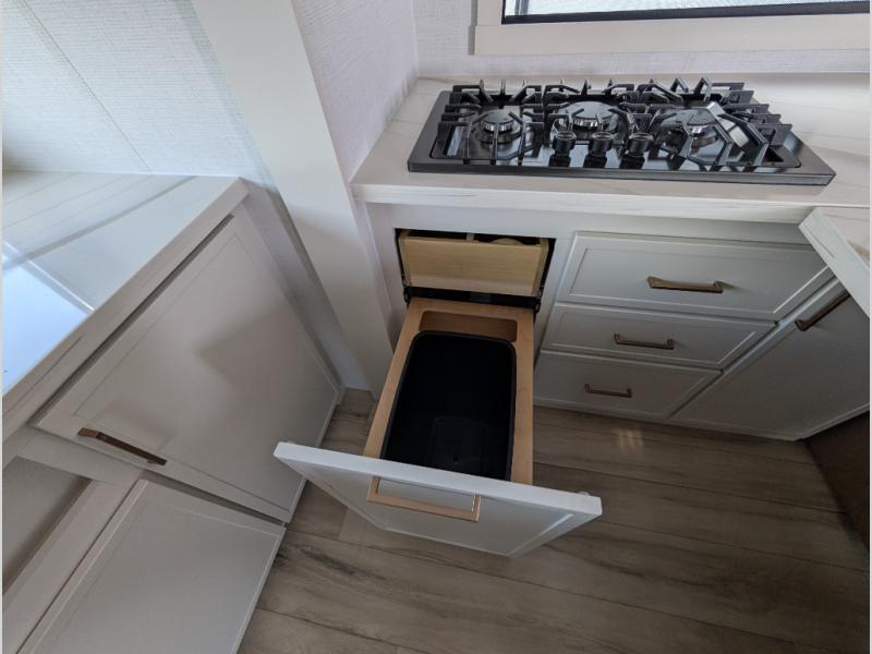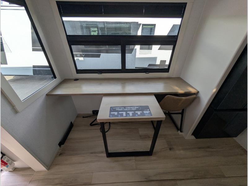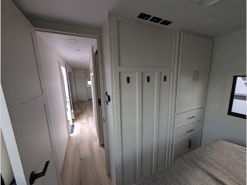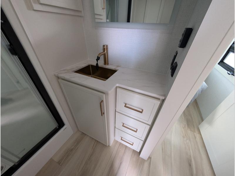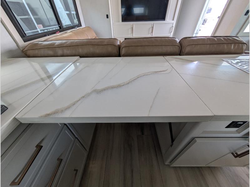 Savor the joy of cooking and sharing meals with loved ones in this beautifully appointed kitchen! This rear kitchen features a spacious pantry with drawers and outlets, a 30" convection microwave, a flip-up counter, and a 12V refrigerator. The convertible dining table and L-desk create a refined space for meals, work, and relaxation. The adjacent L-sofa forms a cozy sanctuary for reading, socializing, or enjoying the entertainment center and fireplace. There is a full bathroom with everything you need to keep your personal hygiene on the road. Plus, the front bedroom’s peaceful haven features a plush king bed, nightstands with storage, and a MaxSpace split-level wardrobe. Additionally, the two exterior awnings create a spacious outdoor living area, ideal for relaxing, entertaining, or enjoying the great outdoors.